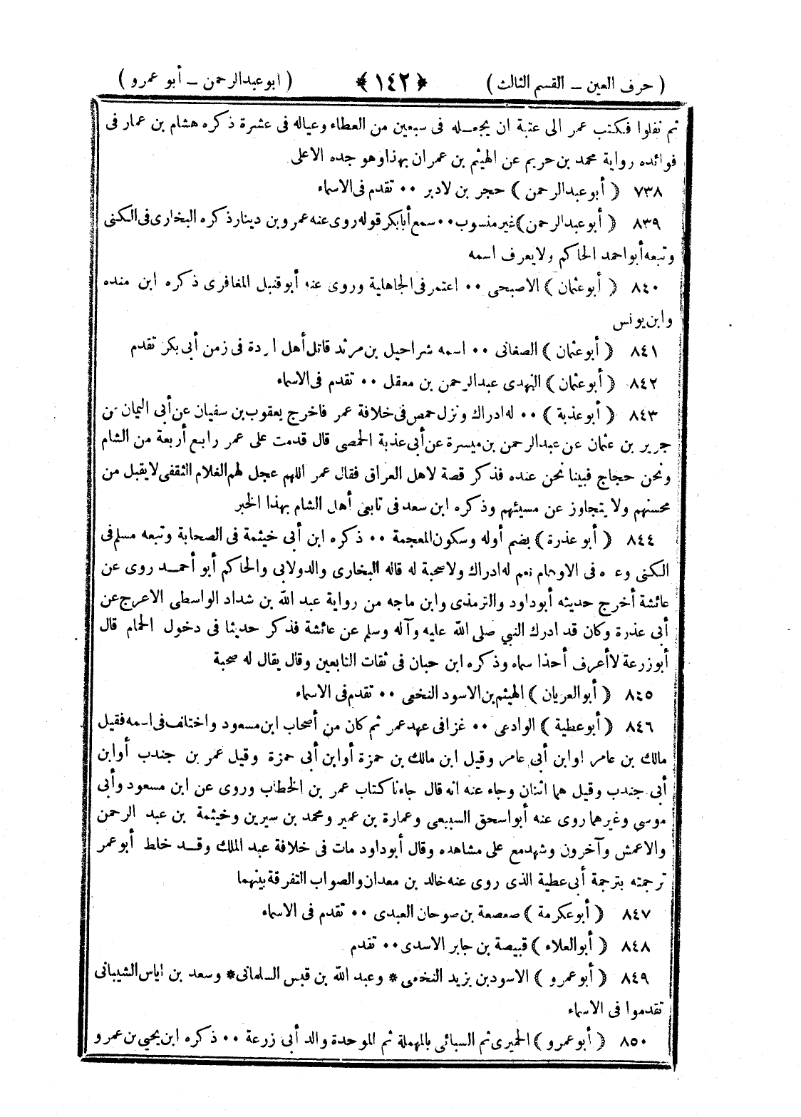 <142> ثم نفلوا فكتب عمر إلى عتبة أن يجعله في سبعين من العطاء وعياله في عشرة ذكره هشام بن عمار في فوائده رواية محمد بن خريم عن الهيثم بن عمران بهذا وهو جده الأعلى أبو عبد الرحمن حجر بن الأدبر تقدم في الأسماء أبو عبد الرحمن غير منسوب سمع أبو بكر قوله روى عنه عمرو بن دينار ذكره البخاري في الكنى وتبعه أبو أحمد الحاكم ولا يعرف اسمه أبو عثمان الأصبحي اعتمر في الجاهلية وروى عنه أبو قبيل المعافري ذكره بن منده وابن يونس أبو عثمان الصنعاني اسمه شراحيل بن مرثد قاتل أهل الردة في زمن أبي بكر تقدم أبو عثمان النهدي عبد الرحمن بن معقل تقدم في الأسماء أبو عذبة له إدراك ونزل حمص في خلافة عمر فأخرج يعقوب بن سفيان عن أبي اليمان عن حريز بن عثمان عن عبد الرحمن بن ميسرة عن أبي عذبة الحمصي قال قدمت على عمر رابع أربعة من الشام ونحن حجاج فبينا نحن عنده فذكر قصة لأهل العراق فقال عمر اللهم عجل لهم الغلام الثقفي لا يقبل من محسنهم ولا يتجاوز عن مسيئهم وذكره بن سعد في تابعي أهل الشام بهذا الخبر أبو عذرة بضم أوله وسكون المعجمة ذكره بن أبي خيثمة في الصحابة وتبعه مسلم في الكنى وعد في الأوهام نعم له إدراك ولا صحبة له قاله البخاري والدولابي والحاكم أبو أحمد روى عن عائشة أخرج حديثه أبو داود والترمذي وابن ماجة من رواية عبد الله بن شداد الواسطي الأعرج عن أبي عذرة وكان قد أدرك النبي صلى الله عليه وسلم عن عائشة فذكر حديثا في دخول الحمام قال أبو زرعة لا أعرف أحدا سماه وذكره بن حبان في ثقات التابعين وقال يقال له صحبة أبو العريان الهيثم بن الأسود النخعي تقدم في الأسماء أبو عطية الوادعي غزا في عهد عمر ثم كان من أصحاب بن مسعود واختلف في اسمه فقيل مالك بن عامر أو بن أبي عامر وقيل مالك بن حمزة أو بن أبي حمزة وقيل عمرو بن جندب أو بن أبي جندب وقيل هما اثنان وجاء عنه أنه قال جاءنا كتاب عمر بن الخطاب وروى عن بن مسعود وأبي موسى وغيرهما روى عنه أبو إسحاق السبيعي وعمارة بن عمير ومحمد بن سيرين وخيثمة بن عبد الرحمن والأعمش وآخرون وشهد مع على مشاهده وقال أبو داود في رواية أخرى مات في خلافة عبد الملك وقد خلط أبو عمر بترجمة أبي عطية الذي روى عنه خالد بن معدان والصواب التفرقة بينهما أبو عكرمة صعصعة بن صوحان العبدي تقدم في الأسماء أبو العلاء قبيصة بن جابر الأسدي تقدم أبو عمرو الأسود بن يزيد النخعي وعبد الله بن قيس السلماني وسعد بن إياس الشيباني تقدموا في الإسماء أبو عمرو الحميري ثم السيباني بالمهملة ثم الموحدة والد أبي زرعة ذكره يحيى بن عمرو §