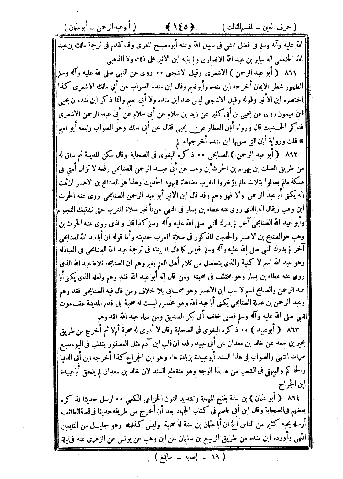 <145> الله عليه وسلم في فضل المشي في سبيل الله وعنه أبو مصبح المقرائي وقد تقدم في ترجمة مالك بن عبد الله الخثعمي أنه جابر بن عبد الله الأنصاري ولم ينبه بن الأثير على ذلك ولا الذهبي أبو عبد الرحمن الأشعري وقيل الأشجعي روى عن النبي صلى الله عليه وسلم الطهور شطر الإيمان أخرجه بن منده وأبو نعيم وقال بن منده الصواب عن أبي مالك الأشعري كذا اختصره بن الأثير وقوله وقيل الأشجعي ليس عند بن منده ولا أبي نعيم وإنما ذكر بن منده أن يحيى بن ميمون روى عن يحيى بن أبي كثير عن زيد بن سلام عن أبي سلام عن أبي عبد الرحمن الأشعري فذكر الحديث قال ورواه أبان العطار عن يحيى فقال عن أبي مالك وهو الصواب وتبعه أبو نعيم قلت ورواية أبان التي صوبها بن منده أخرجها مسلم أبو عبد الرحمن الصنابحي ذكره البغوي في الصحابة وقال سكن المدينة ثم ساق له من طريق الصلت بن بهرام عن الحارث بن وهب عن أبي عبد الرحمن الصنابحي رفعه لا تزال أمتي في مسكة ما لم يعملوا بثلاث ما لم يؤخروا المغرب مضاهاة لليهود الحديث وهذا هو الصنابح بن الأعسر إن ثبت أنه يكنى أبا عبد الرحمن وإلا فهو وهم وقد قال بن الأثير عبد الرحمن الصنابحي روى عنه الحارث بن وهب ويقال إنه الذي روى عنه عطاء بن يسار في النهي عن تأخير صلاة المغرب حتى تشتبك النجوم وأبو عبد الله الصنابحي آخر لم يدرك النبي صلى الله عليه وسلم كذا قال والذي روى عنه الحارث بن وهب هو الصنابح بن الأعسر والحديث المذكور في صلاة المغرب حديثه وأما قوله إن أبا عبد الله الصنابحي آخر لم يدرك النبي صلى الله عليه وسلم فليس كما قال لما بينته في ترجمة عبد الله الصنابحي في العبادلة وهو عبد الله اسم لا كنية والذي يتحصل من كلام أهل العلم بغير وهم أن الصنابحة ثلاثة عبد الله الذي روى عنه عطاء بن يسار وهو مختلف في صحبته ومن قال إنه أبو عبد الله فقد وهم ولعله الذي يكنى عبد الرحمن والصنابح اسم لا نسب بن الأعسر وهو صحابي بلا خلاف ومن قال فيه الصنابحي فقد وهم وعبد الرحمن بن عسيلة الصنابحي يكنى أبا عبد الله وهو مخضرم ليست له صحبة بل قدم المدينة عقب موت النبي صلى الله عليه وسلم فصلى خلف أبي بكر الصديق ومن سماه عبد الله فقد وهم أبو عبيد ذكره البغوي في الصحابة وقال لا أدري له صحبة أم لا ثم أخرج من طريق بجير بن سعد عن خالد بن معدان عن أبي عبيد رفعه إن قلب بن آدم مثل العصفور يتقلب في اليوم سبع مرات انتهى والصواب في هذا السند أبو عبيدة بزيادة هاء وهو بن الجراح كذا أخرجه بن أبي الدنيا والحاكم والبيهقي في الشعب من هذا الوجه وهو منقطع السند لأن خالد بن معدان لم يلحق أبا عبيدة بن الجراح أبو عثمان بن سنة بفتح المهملة وتشديد النون الخزاعي الكعبي أرسل حديثا فذكره بعضهم في الصحابة وقال بن أبي عاصم في كتاب الجهاد بعد أن أخرج من طريقة حديثا في قصة الطائف أرسله يحسب كثير من الناس الخ أن أبا عثمان بن سنة له صحبة وليس كذلك وهو جليل من التابعين انتهى وأورده بن منده من طريق الربيع بن سليمان عن بن وهب عن يونس عن الزهري عنه في ليلة §