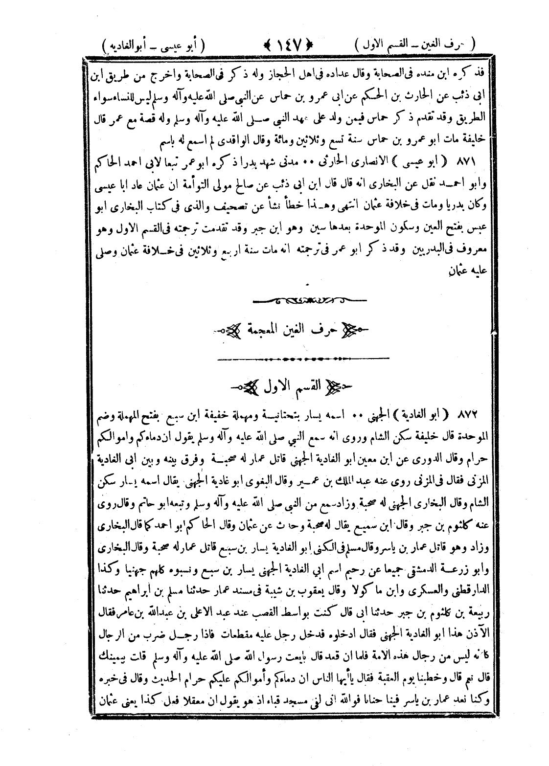 <147> فذكره بن منده في الصحابة وقال عداده في أهل الحجاز وله ذكر في الصحابة وأخرج من طريق بن أبي ذئب عن الحارث بن الحكم عن أبي عمرو بن حماس عن النبي صلى الله عليه وسلم ليس للنساء سواء الطريق وقد تقدم ذكر حماس فيمن ولد على عهد النبي صلى الله عليه وسلم وله قصة مع عمر قال خليفة مات أبو عمرو بن حماس سنة تسع وثلاثين ومائة وقال الواقدي لم أسمع له باسم أبو عيسى الأنصاري الحارثي مدني شهد بدرا ذكره أبو عمر تبعا لأبي أحمد الحاكم وأبو أحمد نقل عن البخاري أنه قال قال بن أبي ذئب عن صالح مولى التوأمة أن عثمان عاد أبا عيسى وكان بدريا ومات في خلافة عثمان انتهى وهذا خطأ نشأ عن تصحيف والذي في كتاب البخاري أبو عبس بفتح العين وسكون الموحدة بعدها سين وهو بن جبر وقد تقدمت ترجمته في القسم الأول وهو معروف في البدريين وقد ذكر أبو عمر في ترجمته أنه مات سنة أربع وثلاثين في خلافة عثمان وصلى عليه عثمان