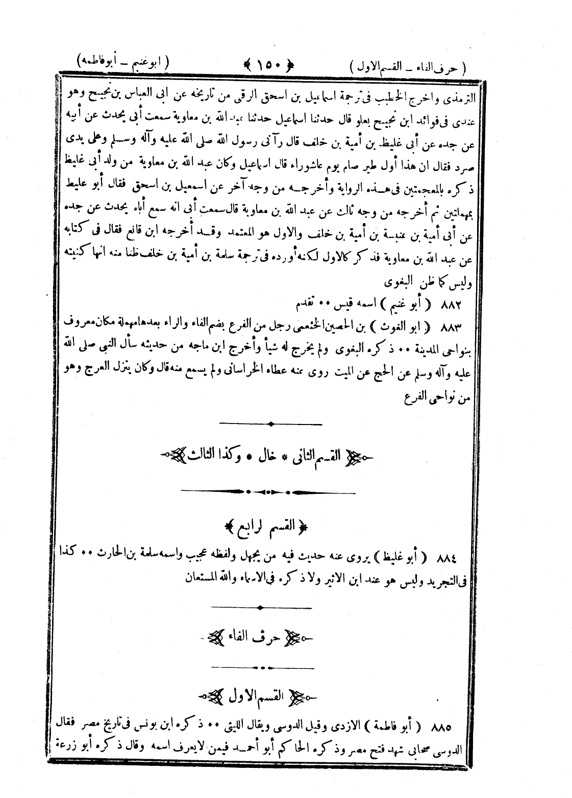 <150> الترمذي وأخرج الخطيب في ترجمة إسماعيل بن إسحاق الرقي من تاريخه عن أبي العباس بن نجيح وهو عندي في فوائد بن نجيح بعلو قال حدثنا إسماعيل حدثنا عبد الله بن معاوية سمعت أبي يحدث عن أبيه عن جده عن أبي غليظ بن أمية بن خلف قال رآني رسول الله صلى الله عليه وسلم وعلى يدي صرد فقال إن هذا أول طير صام يوم عاشوراء قال إسماعيل وكان عبد الله بن معاوية من ولد أبي غليظ ذكره بالمعجمتين في هذه الرواية وأخرجه من وجه آخر عن إسماعيل بن إسحاق فقال أبو عليط بمهملتين ثم أخرجه من وجه ثالث عن عبد الله بن معاوية قال سمعت أبي أنه سمع أباه يحدث عن جده عن أبي أمية عنبسة بن أمية بن خلف والأول هو المعتمد وقد أخرجه بن قانع فقال في كتابه عن عبد بن معاوية فذكر كالأول لكنه أورده في ترجمة سلمة بن أمية بن خلف ظنا منه أنها كنيته وليس كما ظن البغوي أبو غنيم اسمه قيس تقدم أبو الغوث بن الحصين الخثعمي رجل من الفرع بضم الفاء والراء بعدها مهملة مكان معروف بنواحي المدينة ذكره البغوي ولم يخرج له شيئا وأخرج بن ماجة من حديثه سأل النبي صلى الله عليه وسلم عن الحج عن الميت روى عنه عطاء الخراساني ولم يسمع منه قال وكان ينزل العرج وهو من نواحي الفرع القسم الثاني خال وكذا القسم الثالث القسم الرابع أبو غليظ يروي عنه حديث فيه من يجهل ولفظه عجيب واسمه سلمة بن الحارث كذا في التجريد وليس هو عند بن الأثير ولا ذكره في الأسماء والله المستعان