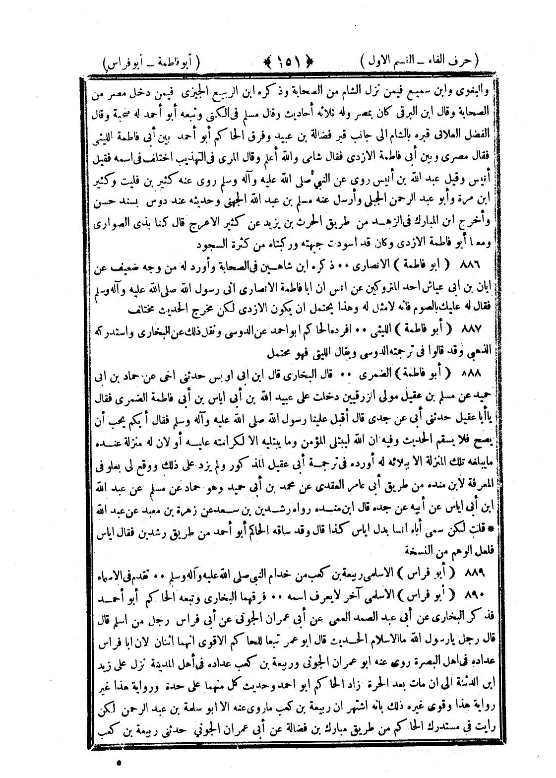 <151> والبغوي وابن سميع فيمن نزل الشام من الصحابة وذكره بن الربيع الجيزي فيمن دخل مصر من الصحابة وقال بن البرقي كان بمصر وله ثلاثة أحاديث وقال مسلم في الكنى وتبعه أبو أحمد له صحبة وقال الفضل الغلابي قبره بالشام إلى جانب قبر فضالة بن عبيد وفرق الحاكم أبو أحمد بين أبي فاطمة الليثي فقال مصري وبين أبي فاطمة الأزدي فقال يقال شامي والله أعلم وقال المزي في التهذيب اختلف في اسمه فقيل أنيس وقيل عبد الله بن أنيس روى عن النبي صلى الله عليه وسلم روى عنه كثير بن قليب وكثير بن مرة وأبو عبد الرحمن الحبلي وأرسل عنه مسلم بن عبد الله الجهني وحديثه عن دوس بسند حسن وأخرج بن المبارك في الزهد من طريق الحارث بن يزيد عن كثير الأعرج قال كنا بذي الصواري ومعنا أبو فاطمة الأزدي وكان قد اسودت جبهته وركبتاه من كثرة السجود أبو فاطمة الأنصاري ذكره بن شاهين في الصحابة وأورد له من وجه ضعيف عن أبان بن أبي عياش أحد المتروكين عن أنس أن أبا فاطمة الأنصاري أتى رسول الله صلى الله عليه وسلم فقال عليك بالصوم فإنه لا مثل له وهذا يحتمل أن يكون الأزدي لأن الأنصاري من الأزد وذكر الصوم أيضا وقع في بعض طرق حديث الأزدي لكن مخرج الحديث مختلف أبو فاطمة الليثي أفرده الحاكم أبو أحمد عن الدوسي ونقل ذلك عن البخاري واستدركه الذهبي وقد قالوا في ترجمته الدوسي ويقال الليثي فهو محتمل أبو فاطمة الضمري قال البخاري قال بن أبي أويس حدثني أخي عن حماد أبي حميد عن مسلم بن عقيل مولى الزرقيين دخلت على عبيد الله بن أبي إياس بن فاطمة الضمري فقال يا أبا عقيل حدثني أبي عن جدي قال أقبل علينا رسول الله صلى الله عليه وسلم فقال أيكم يحب أن يصح فلا يسقم الحديث وفيه إن الله ليبتلي المؤمن وما يبتليه إلا لكرامته عليه أو لأن له منزلة عنده ما يبلغه تلك المنزلة إلا ببلائه له وأورده في ترجمة أبي عقيل المذكور ولم يزد على ذلك ووقع لي بعلو في المعرفة لابن مندة من طريق أبي عامر العقدي عن محمد بن أبي حميد وهو حماد عن مسلم عن عبد الله بن أبي إياس عن أبيه عن جده قال بن مندة رواه رشدين بن سعد عن زهرة بن معبد عن عبد الله قلت لكن سمى أباه أنسا بدل إياس كذا قال وقد ساقه الحاكم أبو أحمد من طريق رشدين فقال إياس فلعل الوهم من النسخة أبو فراس الأسلمي ربيعة بن كعب من خدام النبي صلى الله عليه وسلم تقدم في الأسماء أبو فراس الأسلمي آخر لا يعرف اسمه فرقهما البخاري وتبعه الحاكم أبو أحمد فذكر البخاري عن أبي عبد الصمد العمي عن أبي عمران الجوني عن أبي فراس رجل من أسلم قال قال رجل يا رسول الله ما الإسلام الحديث قال أبو عمر تبعا للحاكم الأقوى أنهما اثنان لأن أبا فراس عداده في أهل البصرة روى عنه أبو عمران الجوني وربيعة بن كعب عداده في أهل المدينة نزل على زيد بن الدثنة إلى أن مات بعد الحرة زاد الحاكم أبو أحمد وحديث كل منهما على حدة ورواية هذا غير رواية هذا وقوى غيره ذلك بأنه اشتهر أن ربيعة بن كعب ما روى عنه إلا أبو سلمة عبد الرحمن لكن رأيت في مستدرك الحاكم من طريق مبارك بن فضالة عن أبي عمران الجوني حدثني ربيعة بن كعب §
