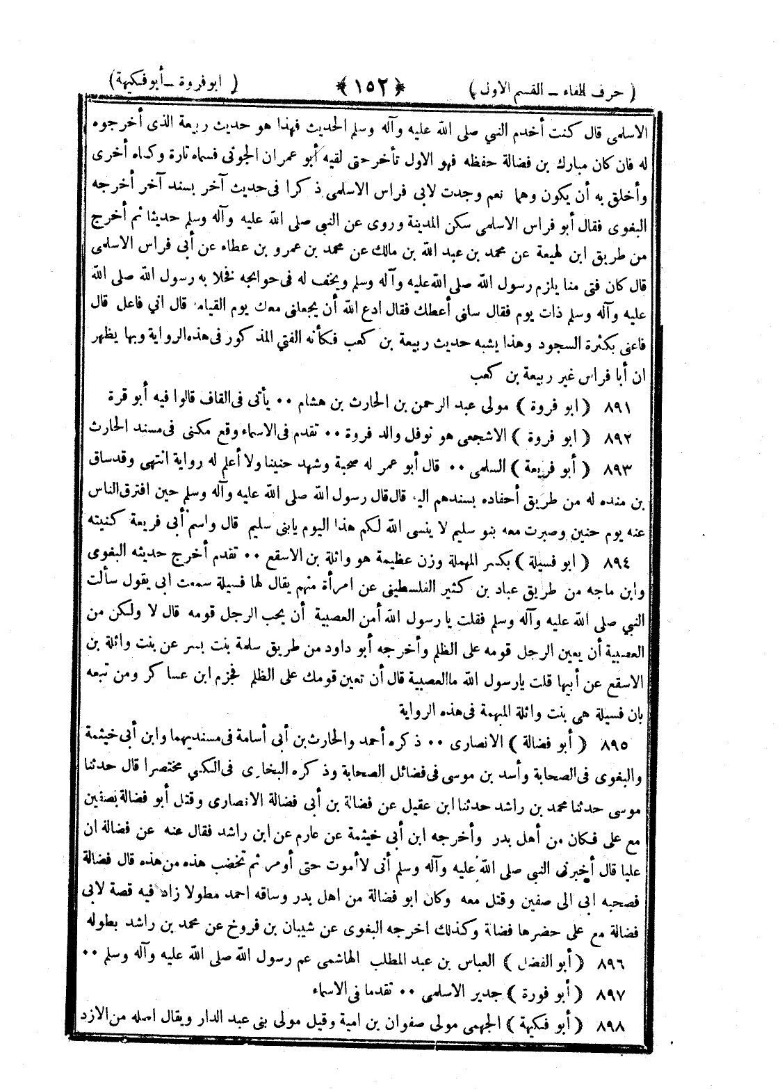 <152> الأسلمي قال كنت أخدم النبي صلى الله عليه وسلم الحديث فهذا هو حديث ربيعة الذي أخرجوه له وإن كان مبارك بن فضالة حفظه فهو الأول تأخر حتى لقيه أبو عمران الجوني فسماه تارة وكناه أخرى وأخلق به أن يكون وهما نعم وجدت لأبي فراس الأسلمي ذكرا في حديث آخر بسند أخرجه البغوي فقال أبو فراس الأسلمي سكن المدينة وروى عن النبي صلى الله عليه وسلم حديثا ثم أخرج من طريق بن لهيعة عن محمد بن عبد الله بن مالك عن محمد بن عمرو بن عطاء عن أبي فراس الأسلمي قال كان فتى منا يلزم رسول الله صلى الله عليه وسلم ويخف له في حوائجه فخلا به رسول الله صلى الله عليه وسلم ذات يوم فقال سلني أعطك فقال ادع الله أن يجعلني معك يوم القيامة قال فأعني بكثرة السجود وهذا يشبه حديث ربيعة بن كعب فكأنه الفتى المذكور في هذه الرواية وبها يظهر أن أبا فراس غير ربيعة بن كعب أبو فروة مولى الحارث بن هشام يأتي في القاف قالوا فيه أبو قرة أبو فروة الأشجعي هو نوفل والد فروة تقدم في الأسماء وقع في الكنى في مسند الحارث أبو فريعة السلمي قال أبو عمر له صحبة وشهد حنينا ولا أعلم له رواية انتهى وقد ساق بن مندة من طريق أحفاده بسند إليه قال قال رسول الله صلى الله عليه وسلم حين افترق الناس عنه يوم حنين وصبرت معه بنو سليم لا ينسى الله لكم هذا اليوم يا بني سليم قال واسم أبي فريعة كنيته أبو فسيلة بكسر المهملة وزن عظيمة هو واثلة بن الأسقع تقدم أخرج حديثه البغوي وابن ماجة من طريق عباد بن كثير الفلسطيني عن امرأة منهم يقال لها فسيلة سمعت أبي يقول سألت النبي صلى الله عليه وسلم فقلت يا رسول الله أمن العصبية أن يحب الرجل قومه قال لا ولكن من العصبية أن يعين الرجل قومه على الظلم وأخرجه أبو داود من طريق سلمة بنت بسر عن بنت واثلة بن الأسقع عن أبيها قالت يا رسول الله ما العصبية قال أن تعين قومك على الظلم فجزم بن عساكر ومن تبعه بأن فسيلة هي بنت واثلة المبهمة في هذه الرواية أبو فضالة الأنصاري ذكره أحمد والحارث بن أبي أسامة في مسنديهما وابن أبي خيثمة والبغوي في الصحابة وأسد بن موسى في فضائل الصحابة وذكره البخاري في الكنى مختصرا قال حدثنا موسى حدثنا محمد بن راشد حدثنا بن عقيل عن فضالة بن أبي فضالة الأنصاري وقتل أبو فضالة بصفين مع علي وكان من أهل بدر وأخرجه بن أبي خيثمة عن عارم عن بن راشد فقال عنه عن فضالة أن عليا قال أخبرني النبي صلى الله عليه وسلم أني لا أموت حتى أؤمر ثم تخضب هذه من هذه قال فضالة فصحبه أبي إلى صفين وقتل معه وكان أبو فضالة من أهل بدر وساقه أحمد مطولا زاد فيه قصة لأبي فضالة مع علي حضرها فضالة وكذلك أخرجه البغوي عن شيبان بن فروخ عن محمد بن راشد بطوله أبو الفضل العباس بن عبد المطلب الهاشمي عم رسول الله صلى الله عليه وسلم أبو فورة حدير الأسلمي تقدما في الأسماء أبو فكيهة الجهمي مولى صفوان بن أمية وقيل مولى بني عبد الدار ويقال أصله من الأزد §