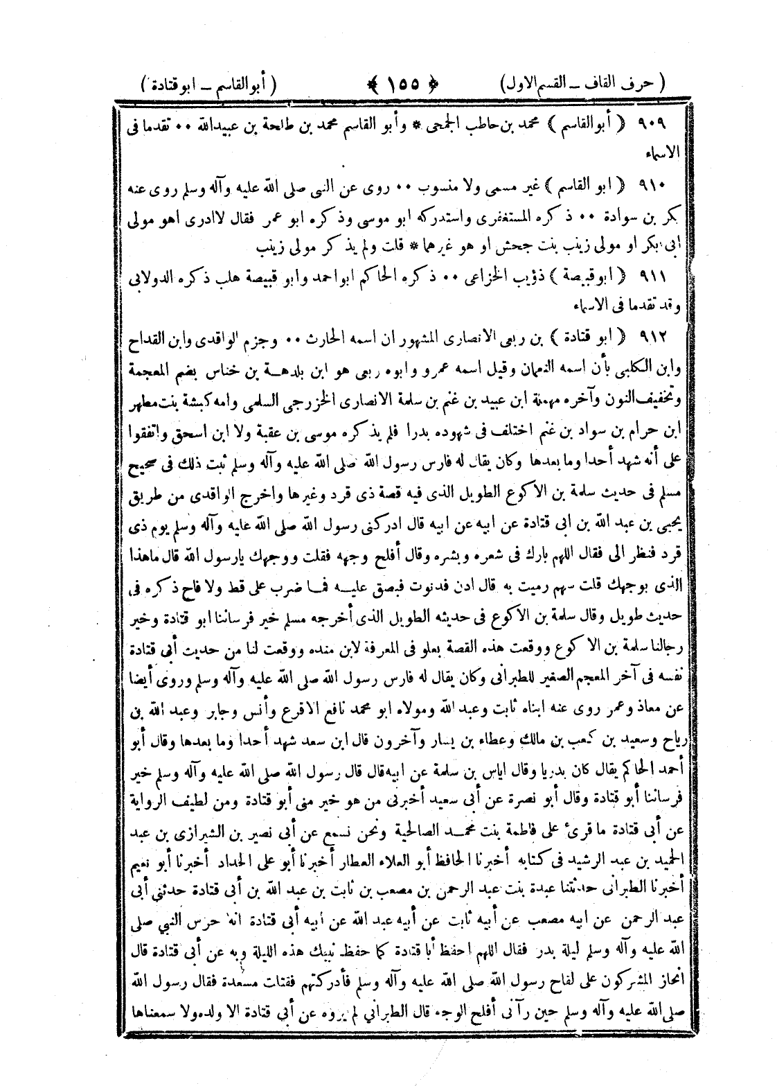 <155> أبو القاسم محمد بن حاطب الجمحي وأبو القاسم محمد بن طلحة بن عبيد الله تقدما في الأسماء أبو القاسم غير مسمى ولا منسوب روى عن النبي صلى الله عليه وسلم روى عنه بكرة بن سوادة ذكره المستغفري واستدركه أبو موسى وذكره أبو عمر فقال لا أدري أهو مولى أبي بكر أو مولى زينب بنت جحش أو هو مولى غيرهما قلت ولم يذكر مولى زينب أبو قبيصة ذؤيب الخزاعي ذكره الحاكم أبو أحمد وأبو قبيصة هلب ذكره الدولابي وقد تقدما في الأسماء أبو قتادة بن ربعي الأنصاري المشهور أن اسمه الحارث وجزم الواقدي وابن القداح وابن الكلبي بأن اسمه النعمان وقيل اسمه عمرو وأبوه ربعي هو بن بلدمة بن خناس بضم المعجمة وتخفيف النون وآخره مهملة بن عبيد بن غنم بن سلمة الأنصاري الخزرجي السلمي وأمه كبشة بنت مطهر بن حرام بن سواد بن غنم اختلف في شهوده بدرا فلم يذكره موسى بن عقبة ولا بن إسحاق واتفقوا على أنه شهد أحدا وما بعدها وكان يقال له فارس رسول الله صلى الله عليه وسلم ثبت ذلك في صحيح مسلم في حديث سلمة بن الأكوع الطويل الذي فيه قصة ذي قرد وغيرها وأخرج الواقدي من طريق يحيى بن عبد الله بن أبي قتادة عن أبيه قال أدركني رسول الله صلى الله عليه وسلم يوم ذي قرد فنظر إلي فقال اللهم بارك في شعره وبشره وقال أفلح وجهه فقلت ووجهك يا رسول الله قال ما هذا الذي بوجهك قلت سهم رميت به قال ادن فدنوت فبصق عليه فما ضرب علي قط ولا فاح ذكره في حديث طويل وقال سلمة بن الأكوع في حديثه الطويل الذي أخرجه مسلم خير فرساننا أبو قتادة وخير رجالنا سلمة بن الأكوع ووقعت هذه القصة بعلو في المعرفه لابن مندة ووقعت لنا من حديث أبي قتادة نفسه في آخر المعجم الصغير للطبراني وكان يقال له فارس رسول الله صلى الله عليه وسلم وروى أيضا عن معاذ وعمر روى عنه ابناه ثابت وعبد الله ومولاه أبو محمد نافع الأقرع وأنس وجابر وعبد الله بن رباح وسعيد بن كعب بن مالك وعطاء بن يسار وآخرون قال بن سعد شهد أحدا وما بعدها وقال أبو أحمد الحاكم يقال كان بدريا وقال إياس بن سلمة عن أبيه قال قال رسول الله صلى الله عليه وسلم خير فرساننا أبو قتادة وقال أبو نضرة عن أبي سعيد أخبرني من هو خير مني أبو قتادة ومن لطيف الرواية عن أبي قتادة ما قرئ على فاطمة بنت محمد الصالحية ونحن نسمع عن أبي نصير بن الشيرازي أخبرنا عبد الحميد بن عبدالرشيد في كتابه أخبرنا الحافظ أبو العلاء العطار أخبرنا أبو علي الحداد أخبرنا أبو نعيم أخبرنا الطبراني حدثتنا عبدة بنت عبد الرحمن بن مصعب بن ثابت بن عبد الله بن أبي قتادة حدثني أبي عبد الرحمن عن أبيه مصعب عن أبيه ثابت عن أبيه عبد الله عن أبيه أبي قتادة أنه حرس النبي صلى الله عليه وسلم ليلة بدر فقال اللهم احفظ أبا قتادة كما حفظ نبيك هذه الليلة وبه عن أبي قتادة قال انحاز المشركون على لقاح رسول الله صلى الله عليه وسلم فأدركتهم فقتلت مسعدة فقال رسول الله صلى الله عليه وسلم حين رآني أفلح الوجه قال الطبراني لم يروه عن أبي قتادة إلا ولده ولا سمعناها §