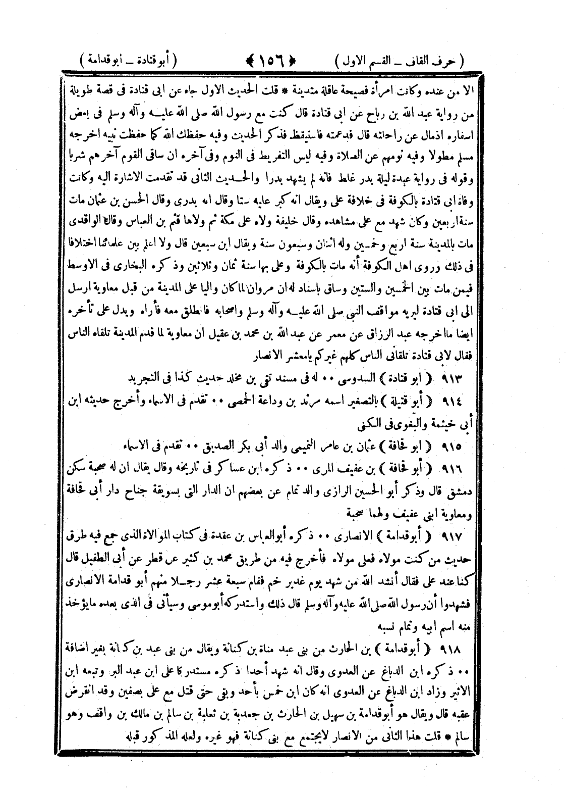 <156> إلا من عنده وكانت امرأة فصيحة عاقلة متدينة قلت الحديث الأول جاء عن أبي قتادة في قصة طويلة من رواية عبد الله بن رباح عن أبي قتادة قال كنت مع رسول الله صلى الله عليه وسلم في بعض أسفاره إذ مال عن راحلته قال فدعمته فاستيقظ فذكر الحديث وفيه حفظك الله كما حفظت نبيه أخرجه مسلم مطولا وفيه نومهم عن الصلاة وفيه ليس التفريط في النوم وفي آخره إن ساقي القوم آخرهم شربا وقوله في رواية عبدة ليلة بدر غلط فإنه لم يشهد بدرا والحديث الثاني قد تقدمت الإشارة إليه وكانت وفاة أبي قتادة بالكوفة في خلافة علي ويقال إنه كبر عليه ستا وقال إنه بدري وقال الحسن بن عثمان مات سنة أربعين وكان شهد مع علي مشاهده وقال خليفة ولاه علي مكة ثم ولاها قثم بن العباس وقال الواقدي مات بالمدينة سنة أربع وخمسين وله اثنتان وسبعون سنة ويقال بن سبعين قال ولا أعلم بين علمائنا اختلافا في ذلك وروى أهل الكوفة أنه مات بالكوفة وعلي بها سنة ثمان وثلاثين وذكره البخاري في الأوسط فيمن مات بين الخمسين والستين وساق بإسناد له أن مروان لما كان واليا على المدينة من قبل معاوية أرسل إلى أبي قتادة ليريه مواقف النبي صلى الله عليه وسلم وأصحابه فانطلق معه فأراه ويدل على تأخره أيضا ما أخرجه عبد الرزاق عن معمر عن عبد الله بن محمد بن عقيل أن معاوية لما قدم المدينة تلقاه الناس فقال لأبي قتادة تلقاني الناس كلهم غيركم يا معشر الأنصار أبو قتادة السدوسي له في مسند بقي بن مخلد حديث كذا في التجريد أبو قتيلة بالتصغير اسمه مرثد بن وداعة الحمصي تقدم في الأسماء وأخرج حديثه بن أبي خيثمة والبغوي في الكنى أبو قحافة عثمان بن عامر التيمي والد أبي بكر الصديق تقدم في الأسماء أبو قحافة بن عفيف المري ذكره بن عساكر في تاريخه وقال يقال إن له صحبة سكن دمشق قال وذكر أبو الحسين الرازي والد تمام عن بعضهم أن الدار التي بسويقة جناح دار أبي قحافة ومعاوية ابني عفيف ولهما صحبة أبو قدامة الأنصاري ذكره أبو العباس بن عقدة في كتاب الموالاة الذي جمع فيه طرق الحديث من كنت مولاه فعلي مولاه فأخرج فيه من طريق محمد بن كثير عن فطر عن أبي الطفيل قال كنا عند علي فقال أنشد الله من شهد يوم غدير خم فقام سبعة عشر رجلا منهم أبو قدامة الأنصاري فشهدوا أن رسول الله صلى الله عليه وسلم قال ذلك واستدركه أبو موسى وسيأتي في الذي بعده ما يؤخذ منه اسم أبيه وتمام نسبه أبو قدامة بن الحارث من بني عبد مناة بن كنانة ويقال من بني عبد بن كنانة بغير إضافة ذكره بن الدباغ عن العدوي وقال إنه شهد أحدا ذكره مستدركا على بن عبد البر وتبعه بن الأثير وزاد بن الدباغ عن العدوي أنه كان بن خمس بأحد وبقي حتى قتل مع علي بصفين وقد انقرض عقبه قال ويقال هو أبو قدامة بن سهل بن الحارث بن جعدبة بن ثعلبة بن سالم بن مالك بن واقف وهو سالم قلت هذا الثاني من الأنصار لا يجتمع مع بني كنانة فهو غيره ولعله المذكور قبله §