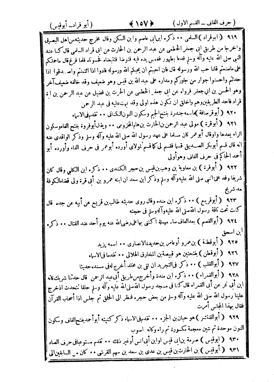 <157> أبو قراد السلمي ذكره بن أبي عاصم وابن السكن وقال مخرج حديثه عن أهل البصرة وأخرجا من طريق أبي جعفر الخطمي عن عبد الرحمن بن الحارث عن أبي قراد السلمي قال كنا عند النبي صلى الله عليه وسلم فدعا بطهور فغمس يده فيه فتوضأ فتتبعناه فحسوناه فلما فرغ قال ما حملكم على ما صنعتم قلنا حب الله ورسوله قال فإن أحببتم أن يحبكم الله ورسوله فأدوا إذا ائتمنتم واصدقوا إذا حدثتم وأحسنوا جوار من جاوركم ومداره على عبد الله بن قيس وهو ضعيف وقد خالفه ضعيف آخر وهو الحسن بن أبي جعفر فرواه عن أبي جعفر الخطمي عن الحارث بن فضيل عن عبد الرحمن بن أبي قراد فأحد الطريقين وهم وأخلق أن تكون هذه أولى وقد نبهت عليه في عبد الرحمن أبو قرصافة اسمه جندرة بفتح الجيم وسكون النون الكناني تقدم في الأسماء أبو قرة مولى عبد الرحمن بن الحارث بن هشام المخزومي ويقال أبو فروة بفتح الفاء وسكون الراء بعدها واو قال أبو عمر كان مسلما على عهد رسول الله صلى الله عليه وسلم وذكر الواقدي عنه أنه قال قسم أبو بكر الصديق قسما فقسم لي كما قسم لمولاي أورده أبو عمر في حرف الفاء وأورده أبو أحمد الحاكم في حرف القاف وهو أولى أبو قرة بن معاوية بن وهب بن قيس بن حجر الكندي ذكره بن الكلبي وقال وكان شريفا وفد على النبي صلى الله عليه وسلم وذكر بن سعد أن ابنه عمرو بن قرة ولي قضاء الكوفة بعد شريح أبو قريع ذكره بن مندة وقال روى حديثه طالب بن قريع عن أبيه عن جده قال كنت تحت ناقة رسول الله صلى الله عليه وسلم في حجته أبو القصم بعد القاف صاد مهملة اكتنى بها علي رضي الله عنه يوم أحد عند القتال ذكره بن إسحاق أبو قطبة بن عمرو أو عامر بن حديدة الأنصاري اسمه يزيد أبو قطن بفتحتين هو قبيصة بن المخارق الهلالي تقدما في الأسماء أبو القلب ذكر في التجريد أن بقي بن مخلد أخرج له في مسنده حديثا أبو القمراء ذكره بن مندة وأخرج من طريق أبي عبد الرحمن قال حدثنا شريك كأنه بن أبي نمر عن أبي القمراء قال كنا في مسجد رسول الله صلى الله عليه وسلم حلقا نتحدث إذ خرج علينا رسول الله صلى الله عليه وسلم من بعض حجره فنظر إلى الحلق ثم جلس إلى أصحاب القرآن فقال بهذا المجلس أمرت أبو القنشر هو حبان بن أبحر تقدم في الأسماء ذكر كنيته أبو أحمد بفتح القاف وسكون النون ثم شين معجمة مكسورة ثم راء وكأنه أصوب أبو قيس صرمة بن أبي قيس أو بن أبي أنس أو غير ذلك تقدم مستوعبا في حرف الصاد أبو قيس بن الحارث بن قيس بن عدي بن سعد بن سهم القرشي كان من السابقين الى §