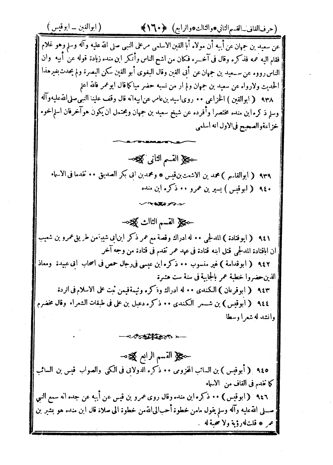 <160> عن سعيد بن جمهان عن أبيه أن مولاه أبا القين الأسلمي مر على النبي صلى الله عليه وسلم وهو غلام فقام اليه عمه فذكره وقال في آخره فكان من أشح الناس وأنكر بن منده زيادة قوله عن أبيه وأن الناس رووه عن سعيد بن جمهان عن أبي القين وقال البغوي أبو القين سكن البصرة ولم يحدث بغير هذا الحديث ولا رواه عن سعيد بن جمهان ولم أر من نسبه حضرميا كما قال أبو عمر فالله أعلم أبو القين الخزاعي روى أسيد بن عامر عن أبيه أنه قال وقف علينا النبي صلى الله عليه وسلم ذكره بن منده مختصرا وأفرده عن شيخ سعيد بن جمهان ويحتمل أن يكون هو آخر فإن أسلم أخو خزاعة والصحيح في الأول أنه أسلمي القسم الثاني أبو القاسم محمد بن الأشعث بن قيس ومحمد بن أبي بكر الصديق تقدما في الأسماء أبو قيس يسير بن عمرو ذكره بن منده القسم الثالث أبو قتادة المدلجي له إدراك وقصة مع عمر ذكر بن أبي شيبة من طريق عمرو بن شعيب أن أبا قتادة المدلجي قتل ابنه قتادة في عهد عمر تقدم في قتادة من وجه آخر أبو قدامة غير منسوب ذكر بن عيسى في رجال حمص في أصحاب أبي عبيدة ومعاذ الذين حضروا خطبة عمر بالجابية في سنة ست عشرة أبو قرعان الكندي له إدراك وذكره وثيمة فيمن ثبت على الإسلام في الردة أبو قيس بن شمر الكندي ذكره دعبل بن علي في طبقات الشعراء وقال مخضرم وأنشد له شعرا وسطا القسم الرابع أبو قيس بن السائب المخزومي ذكره الدولابي في الكنى والصواب قيس بن السائب كما تقدم في القاف من الأسماء أبو قيس ذكره بن منده فقال روى عمرو بن قيس عن أبيه عن جده أنه سمع النبي صلى الله عليه وسلم يقول ما من خطوة أحب الى الله من خطوة إلى صلاة قال بن منده وهو بشير بن عمر قلت له رؤية ولا صحبة له §