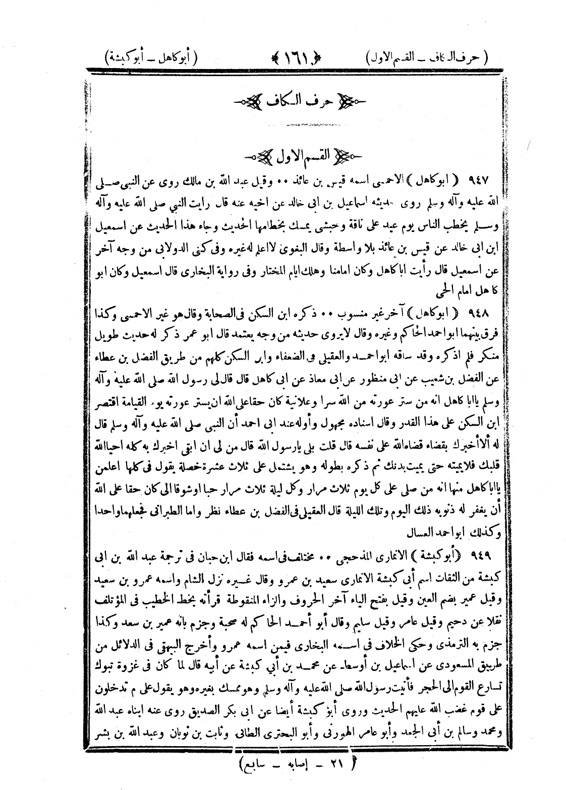 أبو كامل الأحمسي اسمه قيس بن عائذ وقيل عبد الله بن مالك روى عن النبي صلى الله عليه وسلم روى حديثه إسماعيل بن أبي خالد عن أخيه عنه قال رأيت النبي صلى الله عليه وسلم يخطب الناس يوم عيد على ناقة وحبشي يمسك بخطامها الحديث وجاء هذا الحديث عن إسماعيل بن أبي خالد عن قيس بن عائذ بلا واسطة وقال البغوي لا أعلم له غيرة وفي كنى الدولابي من وجه آخر عن إسماعيل قال رأيت أبا كاهل وكان إمامنا وهلك أيام المختار وفي رواية البخاري قال إسماعيل وكان أبو كاهل إمام الحي أبو كاهل آخر غير منسوب ذكره بن السكن في الصحابة وقال هو غير الأحمسي وكذا فرق بينهما أبو أحمد الحاكم وغيره وقال لا يروي حديثه من وجه يعتمد قال أبو عمر ذكر له حديث طويل منكر فلم اذكره وقد ساقه أبو أحمد والعقيلي في الضعفاء وابن السكن كلهم من طريق الفضل بن عطاء عن الفضل بن شعيب عن أبي منظور عن أبي معاذ عن أبي كاهل قال قال رسول الله صلى الله عليه وسلم اعلم يا أبا كاهل أنه من ستر عورته من الله سرا وعلانية كان حقا على الله أن يستر عورته يوم القيامة اقتصر بن السكن على هذا القدر وقال إسناده مجهول وأوله عند أبي أحمد إن النبي صلى الله عليه وسلم قال له ألا أخبرك بقضاء قضاه الله على نفسه قال قلت بلى يا رسول الله قال من لي أن أبقى أخبرك به كله أحيا الله قلبك فلا يميته حتى يميت بدنك ثم ذكره بطوله وهو يشتمل على ثلاث عشرة خصلة يقول في كلها اعلمن يا أبا كاهل منها أنه من صلى علي كل يوم ثلاث مرار وكل ليلة ثلاث مرار حبا أو شوقا الي كان حقا على الله أن يغفر له ذنوبه ذلك اليوم وتلك الليلة قال العقيلي في الفضل بن عطاء نظر وأما الطبراني فجعلهما واحد وكذلك أبو أحمد العسال أبو كبشة الأنماري المذحجي مختلف في اسمه فقال بن حبان في ترجمة عبد الله بن أبي كبشة من الثقات اسم أبي كبشة الأنماري سعيد بن عمر وقال غيره نزل الشام واسمه عمرو بن سعيد وقيل عمير بضم العين وقيل بفتح الياء آخر الحروف والزاي المنقوطة قرأته بخط الخطيب في المؤتلف نقلا عن دحيم وقيل عامر وقيل سليم وقال أبو أحمد الحاكم له صحبة وجزم بأنه عمير بن سعد وكذا جزم به الترمذي وحكى الخلاف في اسمه البخاري فيمن اسمه عمرو وأخرج البيهقي في الدلائل من طريق المسعودي عن إسماعيل بن أوسط عن محمد بن أبي كبشة عن أبيه قال لما كان في غزوة تبوك تسارع القوم الى الحجر فأتيت رسول الله صلى الله عليه وسلم وهو ممسك بعيره وهو يقول علام تدخلون على قوم غضب الله عليهم الحديث وروى أبو كبشة أيضا عن أبي بكر الصديق روى عنه ابناه عبد الله ومحمد وسالم بن أبي الجعد وأبو عامر الهوزني وأبو البحتري الطائي وثابت بن ثوبان وعبد الله بن بسر §