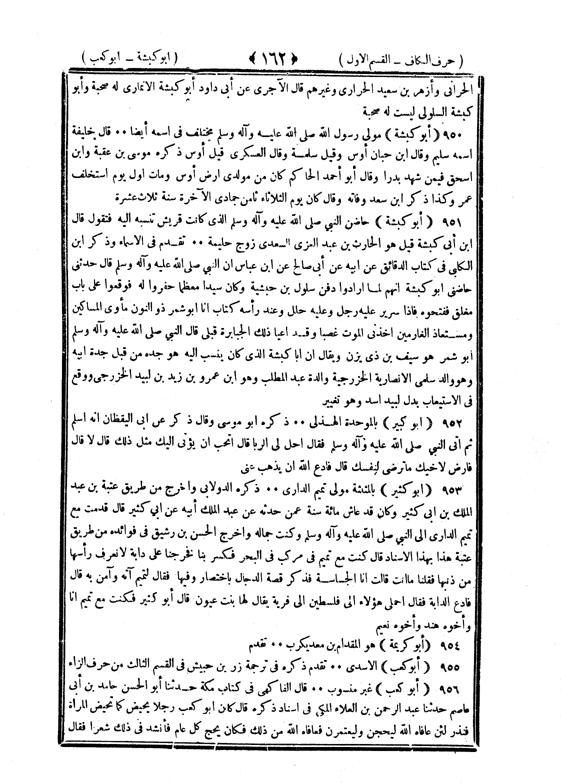 <162> الحبراني وأزهر بن سعيد الحرازي وغيرهم قال الآجري عن أبي داود أبو كبشة الأنماري له صحبة وأبو كبشة البلوي ليست له صحبة أبو كبشة مولى رسول الله صلى الله عليه وسلم مختلف في اسمه أيضا قال خليفة اسمه سليم وقال بن حبان أوس وقيل سلمة وقال العسكري قيل أوس ذكره موسى بن عقبة وابن إسحاق فيمن شهد بدرا وقال أبو أحمد الحاكم كان من مولدي أرض أوس ومات أول يوم استخلف عمر وكذا ذكر بن سعد وفاته وقال كان يوم الثلاثاء من جمادى الآخرة سنة ثلاث عشرة أبو كبشة حاضن النبي صلى الله عليه وسلم الذي كانت قريش تنسبه اليه فتقول قال بن أبي كبشة قيل هو الحارث بن عبد العزي السعدي زوج حليمة تقدم في الأسماء وذكر بن الكلبي في كتاب الدقائق عن أبيه عن أبي صالح عن بن عباس أن النبي صلى الله عليه وسلم قال حدثني حاضني أبو كبشة أنهم لما أرادوا دفن سلول بن حبشية وكان سيدا معظما حفروا له فوقعوا على باب مغلق ففتحوه فإذا سرير عليه رجل وعليه حلل وعند رأسه كتاب أنا أبو شمر ذو النون مأوى المساكين ومستعاذ الغارمين أخذني الموت غصبا وقد أعيا ذلك الجبابرة قبلي قال النبي صلى الله عليه وسلم وأبو شمر هو سيف بن ذي يزن ويقال إن أبا كبشة الذي كان ينسب إليه هو جده من قبل جدة أبيه وهو والد سلمى الأنصارية الخزرجية والدة عبد المطلب وهو بن عمرو بن زيد بن لبيد الخزرجي ووقع في الاستيعاب بدل لبيد أسد وهو تغيير أبو كبير بالموحدة الهذلي ذكره أبو موسى وقال ذكر عن أبي اليقظان أنه أسلم ثم أتى النبي صلى الله عليه وسلم فقال أحل لي الزنا قال أتحب أن يؤتى إليك مثل ذلك قال لا قال فارض لأخيك ما ترضى لنفسك قال فادع الله أن يذهبه عني أبو كثير بالمثلثة مولى تميم الداري ذكره الدولابي وأخرج من طريق عتبة بن عبد الملك بن أبي كثير وكان قد عاش مائة سنة عمن حدثه عن عبد الملك أبيه عن أبي كثير قال قدمت مع تميم الداري الى النبي صلى الله عليه وسلم وكنت حمالا له وأخرج الحسن بن رشيق في فوائده من طريق عتبة هذا بهذا الإسناد قال كنت مع تميم في مركب البحر فكسر بنا فخرجنا على دابة لا نعرف رأسها من ذنبها فقلنا ما أنت قالت أنا الجساسة فذكر قصة الدجال باختصار وفيها فقال لتميم ائته وآمن به قال فادع الدابة فقال احملي هؤلاء إلى فلسطين إلى قرية يقال لها بيت عينون قال أبو كثير فكنت مع تميم أنا وأخو هند وأخوه نعيم أبو كريمة هو المقدام بن معد يكرب تقدم أبو كعب الأسدي تقدم ذكره في ترجمة زر بن حبيش في القسم الثالث من حرف الزاي أبو كعب غير منسوب قال الفاكهي في كتاب مكة حدثنا أبو الحسن حامد بن أبي عاصم حدثنا عبد الرحمن بن العلاء المكي في إسناد ذكره قال كان أبو كعب رجلا يحيض كما تحيض المرأة فنذر لئن عافاه الله ليحجن وليعتمرن فعافاه الله من ذلك فكان يحج كل عام فأنشد في ذلك شعرا فقال §
