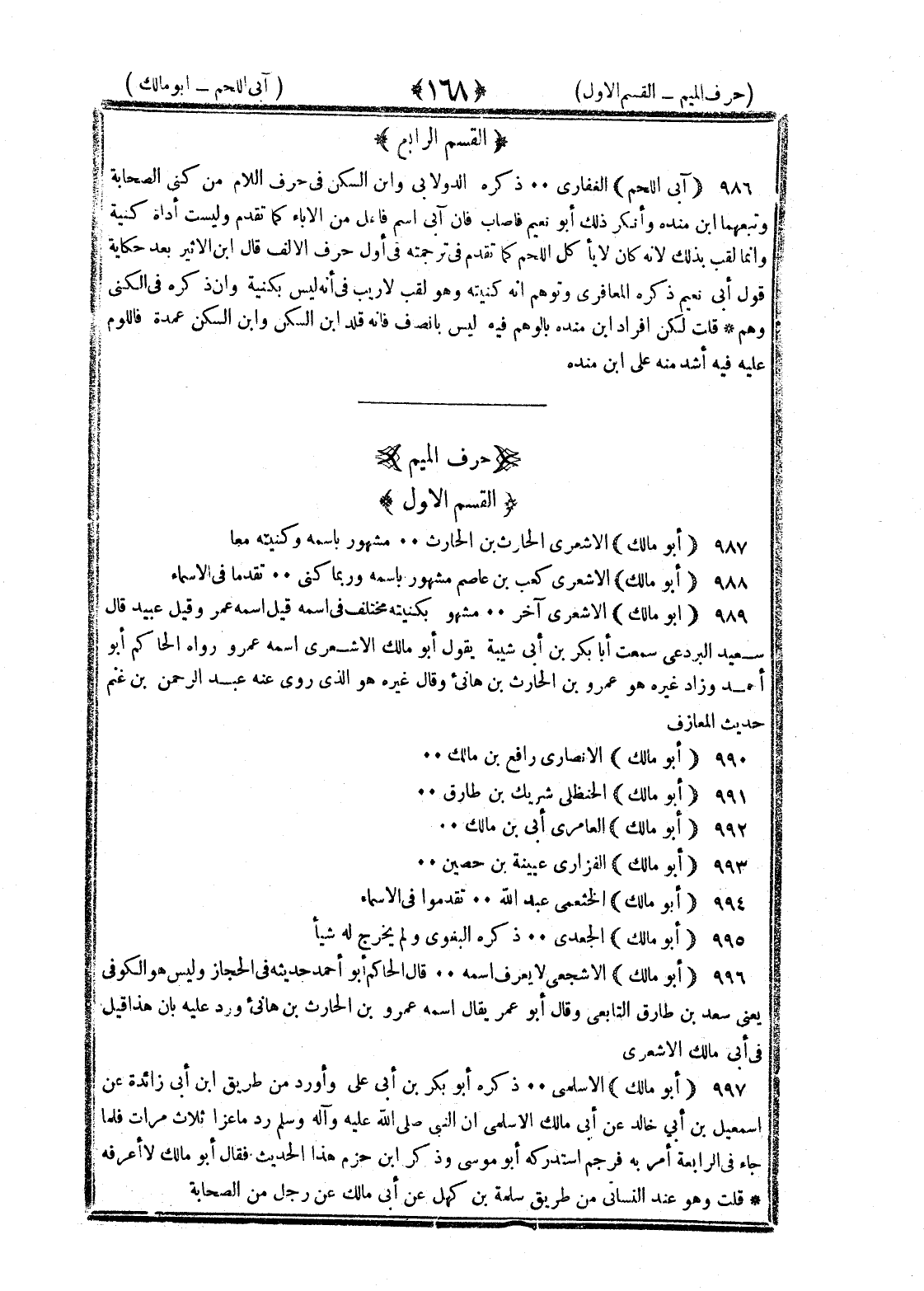 أبو مالك الأشعري الحارث بن الحارث مشهور باسمه وكنيته معا أبو مالك الأشعري كعب بن عاصم مشهور باسمه وربما كنى تقدما في الأسماء قال البغوي يقال له أبو مالك أبو مالك الأشعري آخر مشهور بكنيته مختلف في اسمه قيل اسمه عمرو وقيل عبيد قال سعيد البرذعي سمعت أبا بكر بن أبي شيبة يقول أبو مالك الأشعري اسمه عمرو رواه الحاكم أبو أحمد وزاد غيره هو عمرو بن الحارث بن هانئ وقال غيره هو الذي روى عنه عبد الرحمن بن غنم حديث المعازف أبو مالك الأنصاري رافع بن مالك أبو مالك الحنظلي شريك بن طارق أبو مالك العامري أبي بن مالك أبو مالك الفزاري عيينة بن حصن أبو مالك الخثعمي عبد الله تقدموا في الأسماء أبو مالك الجعدي ذكره البغوي ولم يخرج له شيئا أبو مالك الأشجعي لا يعرف اسمه قال الحاكم أبو أحمد حديثه في الحجاز وليس هو الكوفي يعني سعد بن طارق التابعي وقال أبو عمر اسمه عمرو بن الحارث بن هانئ ورد عليه بأن هذا قيل في أبي مالك الأشعري أبو مالك الأسلمي ذكره أبو بكر بن أبي علي وأورد من طريق بن أبي زائدة عن إسماعيل بن أبي خالد عن أبي مالك الأسلمي أن النبي صلى الله عليه وسلم رد ماعزا ثلاث مرات فلما جاء في الرابعة أمر به فرجم استدركه أبو موسى وذكر بن حزم هذا الحديث فقال أبو مالك لا أعرفه قلت وهو عند النسائي من طريق سلمة بن كهيل عن أبي مالك عن رجل من الصحابة §