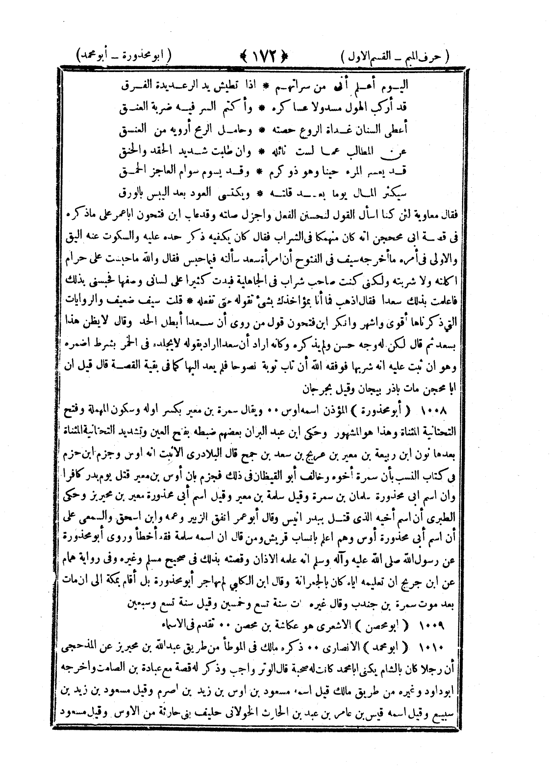 <172> اليوم أعلم أني من سراتهم إذا تطيش يد الرعديدة الفرق قد أركب الهول مسدولا عساكره وأكتم السر فيه ضربة العنق أعطى السنان غداة الروع حصته وعامل الرمح أرويه من العلق عف المطالب عما لست نائله وإن طلبت شديد الحقد والحنق قد يعسر المرء حينا وهو ذو كرم وقد يسوم سواء العاجز الحمق سيكثر المال يوما بعد قلته ويكتسى العود بعد اليبس بالورق فقال معاوية لئن كنا أسأنا القول لنحسنن الفعل وأجزل صلته وقد عاب بن فتحون أبا عمر على ما ذكره في قصة أبي محجن إنه كان منهمكا في الشراب فقال كان يكفيه ذكر حده عليه والسكوت عنه أليق والأولى في أمره ما أخرجه سيف في الفتوح أن امرأة سعد سألته فيم حبس فقال والله ما حبست على حرام أكلته ولا شربته ولكني كنت صاحب شراب في الجاهلية فند كثيرا على لساني وصفها فحبسني بذلك فأعلمت بذلك سعدا فقال اذهب فما أنا بمؤاخذك بشيء تقوله حتى تفعله قلت سيف ضعيف والروايات التي ذكرناها أقوى وأشهر وأنكر بن فتحون قول من روى أن سعدا أبطل عنه الحد وقال لا يظن هذا بسعد ثم قال لكن له وجه حسن ولم يذكر وكأنه أراد أن سعدا أراد بقوله لا يجلده في الخمر بشرط أضمره وهو إن ثبت عليه أنه شربها فوفقه الله أن تاب توبة نصوحا فلم يعد إليها كما في بقية القصة قال قيل إن أبا محجن مات بأذربيجان وقيل بجرجان أبو محذورة المؤذن اسمه أوس ويقال سمرة بن معير بكسر أوله وسكون المهملة وفتح التحتانية المثناة وهذا هو المشهور وحكى بن عبد البر أن بعضهم ضبطه بفتح العين وتشديد التحتانية المثناة بعدها نون بن ربيعة بن معير بن عريج بن سعد بن جمح قال البلاذري الأثبت أنه أوس وجزم بن حزم في كتاب النسب بأن سمرة أخوه وخالف أبو اليقظان في ذلك فجزم بأن أوس بن معير قتل يوم بدر كافرا وأن اسم أبي محذورة سلمان بن سمرة وقيل سلمة بن معير وقيل اسم أبي محذورة معير بن محيريز وحكى الطبري أن اسم أخيه الذي قتل ببدر أنيس وقال أبو عمر اتفق الزبير وعمه وابن إسحاق والمسيبي على أن اسم أبي محذورة أوس وهم أعلم بأنساب قريش ومن قال إن اسمه سلمة فقد أخطأ وروى أبو محذورة عن رسول الله صلى الله عليه وسلم أنه علمه الأذان وقصته بذلك في صحيح مسلم وغيره وفي رواية همام عن بن جريج أن تعليمه إياه كان بالجعرانة وقال بن الكلبي لم يهاجر أبو محذورة بل أقام بمكة إلى أن مات بعد موت سمرة بن جندب وقال غيره مات سنة تسع وخمسين وقيل سنة تسع وسبعين أبو محصن الأشعري هو عكاشة بن محصن تقدم في الأسماء أبو محمد الأنصاري ذكره مالك في الموطأ من طريق عبد الله بن محيريز عن المذحجي أن رجلا كان بالشام يكنى أبا محمد كانت له صحبة قال الوتر واجب وذكر له قصة مع عبادة بن الصامت وأخرجه أبو داود وغيره من طريق مالك قيل اسمه مسعود بن أوس بن زيد بن أصرم وقيل مسعود بن زيد بن سبيع وقيل اسمه قيس بن عامر بن عبد بن الحارث الخولاني حليف بني حارثة من الأوس وقيل مسعود §