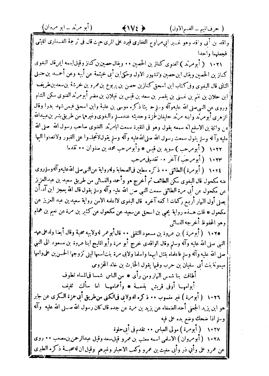 <174> واقد بن أبي واقد وهو غير أبي مراوح الغفاري فيرد على المزي حيث قال في ترجمة الغفاري الليثي فجعلهما واحدا أبو مرثد الغنوي كناز بن الحصين ويقال حصين بن كناز وقيل اسمه أيمن قال البغوي كناز بن الحصين ويقال بن حصن والمشهور الأول وحكى بن أبي خيثمة عن أبيه وعن أحمد بن حنبل الثاني قال البغوي وفي كتاب بن إسحاق كناز بن حصن بن يربوع بن عمرو بن خرشة بن سعد بن طريف بن جلان بن غنم بن غني بن يعصر بن سعد بن قيس بن غيلان بن مضر أبو مرثد الغنوي سكن الشام وروى عن النبي صلى الله عليه وسلم حديثا ذكره موسى بن عقبة وابن إسحاق فيمن شهد بدرا وقال الزهري أبو مرثد وابنه مرثد حليفان لحمزة وحديثه عند مسلم والبغوي وغيرهما من طريق بشر بن عبيد الله عن واثلة بن الأسقع أنه سمعه يقول وهو في المقبرة سمعت أبا مرثد الغنوي صاحب رسول الله صلى الله عليه وسلم يقول سمعت رسول الله صلى الله عليه وسلم يقول لا تجلسوا على القبور ولا تصلوا إليها أبو مرحب سويد بن قيس وأبو مرحب محمد بن صفوان تقدما أبو مرحب آخر تقدم في مرحب أبو مرة الطائفي ذكره مطين في الصحابة وله رواية عن النبي صلى الله عليه وسلم روى عنه مكحول قال البغوي سكن الطائف ثم أخرج هو وأحمد والنسائي من طريق سعيد بن عبد العزيز عن مكحول عن أبي مرة الطائفي سمعت النبي صلى الله عليه وسلم يقول قال الله يعجز بن آدم أن يصلي أول النهار أربع ركعات أكفه آخره قال البغوي لا أعلمه إلا من رواية سعيد بن عبد العزيز عن مكحول قلت هذه رواية يحيى بن إسحاق عن سعيد عن مكحول عن كثير بن مرة عن نعيم بن همام وهو المحفوظ أخرجه النسائي أبو مرة بن عروة بن مسعود الثقفي قال أبو عمر له ولأبيه صحبة وقال أيضا ولد على عهد النبي صلى الله عليه وسلم وقال الواقدي خرج أبو مرة وأبو المليح ابنا عروة بن مسعود إلى النبي صلى الله عليه وسلم فأعلماه بقتل أبيهما وأسلما ولأبي مرة بنت اسمها ليلى تزوجها الحسن بن علي وأمها ميمونة بنت أبي سفيان بن حرب وفيها يقول الحارث بخالد المخزومي أطافت بنا شمس النهار ومن رأى من الناس شمسا في المساء تطوف أبو أمها أوفى قريش بذمة وأعمامها إما سألت ثقيف أبو مرة غير منسوب ذكره الدولابي في الكنى من طريق أبي حمزة السكري عن جابر هو بن يزيد الجعفي أحد الضعفاء عن يزيد بن مرة عن جده قال كان رسول الله صلى الله عليه وسلم إذا ضحك وضع يده على فمه أبو مرة مولى العباس تقدم في أبي حلوة أبو مروان الأسلمي اسمه معتب بن عمرو وقيل سعد وقيل عبد الرحمن بن مصعب روى عن عمر وعلي وأبي ذر وأبي معتب بن عمر وكعب الأحبار وغيرهم وقيل إن له صحبة ذكره §