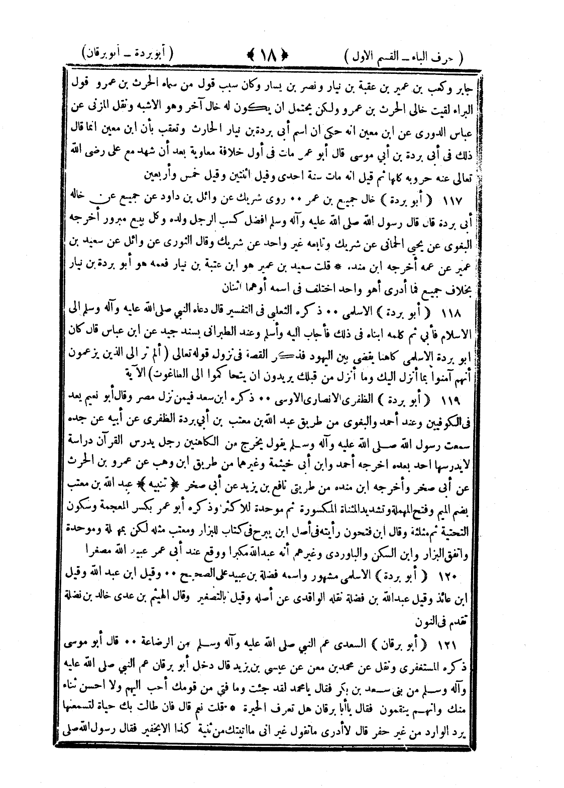 <18> جابر وكعب بن عمير بن عقبة بن نيار ونصر بن يسار وكان سبب من سماه الحارث بن عمرو قول البراء لقيت خالي الحارث بن عمرو ولكن يحتمل أن يكون له خال آخر وهو الأشبه ونقل المزي عن عباس الدوري عن بن معين أنه حكى أن اسم أبي بردة بن نيار الحارث وتعقب بأن بن معين إنما قال ذلك في أبي بردة بن أبي موسى قال أبو عمر مات في أول خلافة معاوية بعد أن شهد مع علي رضي الله عنه حروبه كلها ثم قيل إنه مات سنة إحدى وقيل اثنتين وقيل خمس وأربعين أبو بردة خال جميع بن عمير روى شريك عن وائل بن داود عن جميع عن خاله أبي بردة قال قال رسول الله صلى الله عليه وسلم أفضل كسب الرجل ولده وكل بيع مبرور أخرجه البغوي عن يحيى الحماني عن شريك وتابعه غير واحد عن شريك وقال الثوري عن وائل عن سعيد بن عمير عن عمه أخرجه بن منده قلت سعيد بن عمير هو بن عتبة بن نيار فعمه هو أبو بردة بن نيار بخلاف جميع فما أدري أهو واحد اختلف في اسمه أو هما اثنان أبو بردة الأسلمي ذكره الثعلبي في التفسير قال دعاه النبي صلى الله عليه وسلم إلى الإسلام فأبى ثم كلمه ابناه في ذلك فأجاب إليه وأسلم وعند الطبراني بسند جيد عن بن عباس قال كان أبو بردة الأسلمي كاهنا يقضي بين اليهود فذكر القصة في نزول قوله تعالى ألم تر الى الذين يزعمون أنهم آمنوا بما أنزل إليك وما أنزل من قبلك يريدون أن يتحاكموا الى الطاغوت الآية أبو بردة الظفري الأنصاري الأوسي ذكره بن سعد فيمن نزل مصر وقال أبو نعيم يعد في الكوفيين وعند أحمد والبغوي من طريق عبد الله بن معتب بن أبي بردة الظفري عن أبيه عن جده سمعت رسول الله صلى الله عليه وسلم يقول يخرج من الكاهنين رجل يدرس القرآن دراسة لا يدرسها أحد بعده أخرجه أحمد وابن أبي خيثمة وغيرهما من طريق بن وهب عن عمرو بن الحارث عن أبي صخر وأخرجه بن منده من طريق نافع بن يزيد عن أبي صخر تنبيه عبد الله بن معتب بضم الميم وفتح المهملة وتشديد المثناة المكسورة ثم موحدة للأكثر وذكره أبو عمر بكسر المعجمة وسكون التحتية ثم مثلثة وقال بن فتحون رأيته في أصل بن مفرح من كتاب البزار ومعتب مثله لكن بمهملة وموحدة واتفق البزار وابن السكن والباوردي وغيرهم أنه عبد الله مكبرا ووقع عند أبي عمر عبيد الله مصغرا أبو برزة الأسلمي مشهور واسمه نضلة بن عبيد على الصحيح وقيل بن عبد الله وقيل بن عائذ وقيل عبد الله بن نضلة نقله الواقدي عن أصله وقيل بالتصغير وقال الهيثم بن عدي خالد بن نضلة تقدم في النون أبو برقان السعدي عم النبي صلى الله عليه وسلم من الرضاعة قال أبو موسى ذكره المستغفري ونقل عن محمد بن معن عن عيسى بن يزيد قال دخل أبو برقان عم النبي صلى الله عليه وسلم من بني سعد بن بكر قال يا محمد لقد جئت وما فتى من قومك أحب إليهم ولا أحسن ثناء منك وإنهم يتقممون فقال يا أبا برقان هل تعرف الحيرة قلت نعم قال فإن طالت بك حياة لتسمعنها يرد الوارد من غير خفير قال لا أدري ما تقول غير أني ما أتيتك من ثنية كذا إلا بخفير فقال رسول الله صلى §