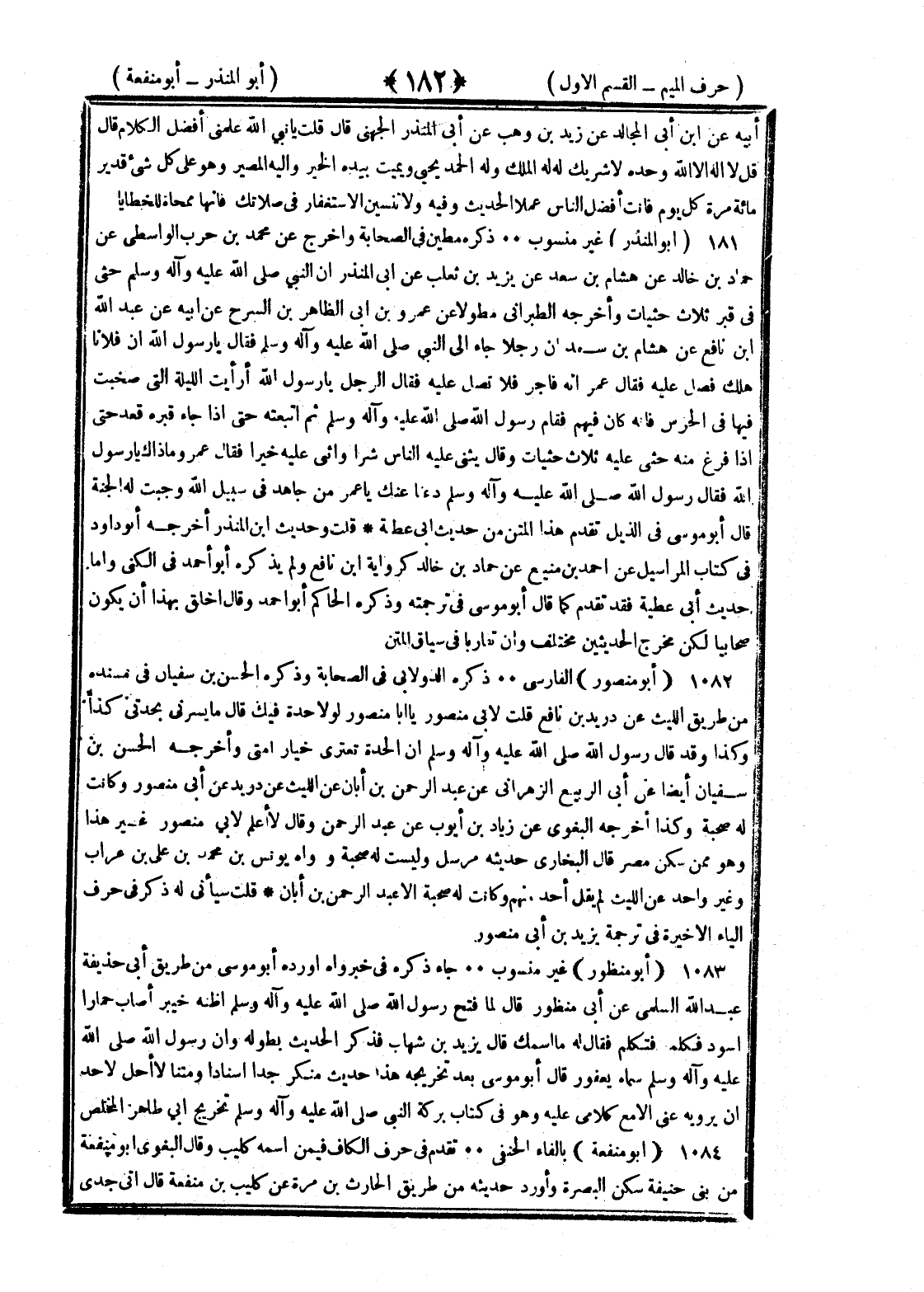 <182> أبيه عن بن أبي المجالد عن زيد بن وهب عن أبي المنذر الجهني قال قلت يا نبي الله علمني أفضل الكلام قال قل لا إله إلا الله وحده لا شريك له له الملك وله الحمد يحيى ويميت بيده الخير إليه المصير وهو على كل شيء قدير مائة مرة كل يوم فأنت أفضل الناس عملا الحديث وفيه ولا تنسين الاستغفار في صلاتك فإنها ممحاة للخطايا أبو المنذر غير منسوب ذكره مطين في الصحابة وأخرج عن محمد بن حرب الواسطي عن حماد بن خالد عن هشام بن سعد عن يزيد بن ثعلب عن أبي المنذر أن النبي صلى الله عليه وسلم حثى في قبره ثلاث حثيات وأخرجه الطبراني مطولا عن عمرو بن أبي الطاهر بن السرح عن أبيه عن عبد الله بن نافع عن هشام بن سعد أن رجلا جاء إلى النبي صلى الله عليه وسلم فقال يا رسول الله إن فلانا هلك فصل عليه فقال عمر إنه فاجر فلا تصل عليه فقال الرجل يا رسول الله أرأيت الليلة التي صبحت فيها في الحرس فإنه كان فيهم فقام رسول الله صلى الله عليه وسلم ثم اتبعته حتى إذا جاء قبره قعد حتى إذا فرغ منه حثى عليه ثلاث حثيات وقال يثني عليه الناس شرا وأثني عليه خيرا فقال عمر وما ذاك يا رسول الله فقال رسول الله صلى الله عليه وسلم دعنا عنك يا عمر من جاهد في سبيل الله وجبت له الجنة قال أبو موسى في الذيل تقدم هذا المتن من حديث أبي عطية قلت وحديث أبي المنذر أخرجه أبو داود في كتاب المراسيل عن أحمد بن منيع عن حماد بن خالد كرواية بن نافع ولم يذكره أبو أحمد في الكنى وأما حديث أبي عطية فقد تقدم كما قال أبو موسى في ترجمته وذكره الحاكم أبو أحمد وقال أخلق بهذا أن يكون صحابيا لكن مخرج الحديثين مختلف وإن تقاربا في سياق المتن أبو منصور الفارسي ذكره الدولابي في الصحابة وذكره الحسن بن سفيان في مسنده من طريق الليث عن دويد بن نافع قلت لأبي منصور يا أبا منصور لولا حدة فيك قال ما يسرني بحدتي كذا وكذا وقد قال رسول الله صلى الله عليه وسلم إن الحدة تعتري خيار أمتي وأخرجه الحسن بن سفيان أيضا عن أبي الربيع الزهراني عن عبد الرحمن بن أبان عن الليث عن دويد عن أبي منصور وكانت له صحبة وكذا أخرجه البغوي عن زياد بن أيوب عن عبد الرحمن وقال لا أعلم لأبي منصور غير هذا وهو ممن سكن مصر وقال البخاري حديثه مرسل وقال أبو عمر يقال إن حديثه مرسل وليست له صحبة قال ورواه يونس بن محمد بن علي بن غراب وغير واحد عن الليث لم يقل أحد منهم وكانت له صحبة إلا عبد الرحمن بن أبان قلت سيأتي له ذكر في حرف الياء الأخيرة في ترجمة يزيد بن أبي منصور أبو منظور غير منسوب جاء ذكره في خبر واه أورده أبو موسى من طريق أبي حذيفة عبد الله بن حبيب الهذلي عن أبي عبد الله السلمي عن أبي منظور قال لما فتح رسول الله صلى الله عليه وسلم أظنه خيبر أصاب حمارا أسود فكلمه فتكلم فقال ما اسمك قال يزيد بن شهاب فذكر الحديث بطوله وأن رسول الله صلى الله عليه وسلم سماه يعفورا قال أبو موسى بعد تخريجه هذا حديث منكر جدا إسنادا ومتنا لا أحل لأحد أن يرويه عني إلا مع كلامي عليه وهو في كتاب تركة النبي صلى الله عليه وسلم تخريج أبي طاهر المخلص أبو منفعة بالفاء الحنفي تقدم في حرف الكاف فيمن اسمه كليب وقال البغوي أبو منفعة من بني حنيفة سكن البصرة وأورد حديثه من طريق الحارث بن مرة عن كليب بن منفعة قال أتى جدي §