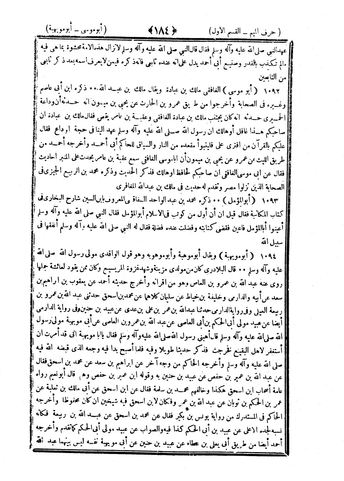 <184> عهد النبي صلى الله عليه وسلم فقال قال النبي صلى الله عليه وسلم لا تزال هذه الأمة متمسكة بما هي فيه ما لم تكذب بالقدر وصنيع أبي أحمد يدل على أنه عنده تابعي فإنه ذكره فيمن لا يعرف اسمه بعد ذكر تابعي من التابعين أبو موسى الغافقي مالك بن عبادة ويقال مالك بن عبد الله ذكره بن أبي عاصم وغيره في الصحابة وأخرجوا من طريق عمرو بن الحارث عن يحيى بن ميمون أنه حدثه أن وداعة الحميري حدثه أنه كان يجتنب مالك بن عبادة الغافقي وعقبة بن عامر يقص فقال مالك بن عبادة إن صاحبكم هذا غافل أو هالك إن رسول الله صلى الله عليه وسلم عهد إلينا في حجة الوداع فقال عليكم بالقرآن من افترى علي فليتبوأ مقعده من النار والسياق للحاكم أبي أحمد وأخرجه أحمد من طريق الليث عن عمرو عن يحيى بن ميمون أن أبا موسى الغافقي سمع عقبة بن عامر يحدث على المنبر أحاديث فقال عن أبي موسى الغافقي إن صاحبكم لحافظ أو هالك فذكر الحديث وذكره محمد بن الربيع الجيزي في الصحابة الذي نزلوا مصر وتقدم له حديث في مالك بن عبد الله المعافري أبو المؤمل ذكره محمد بن عبد الواحد السفاقسي المعروف بابن البنين شارح البخاري في كتاب المكاتبة فقال قيل أول من كوتب في الإسلام أبو المؤمل فقال النبي صلى الله عليه وسلم أعينوا أبا المؤمل فأعين فقضى كتابته وفضلت عنده فضله فقال له النبي صلى الله عليه وسلم أنفقها في سبيل الله أبو مويهبه ويقال أبو موهبه وأبو مهوبه وهو قول الواقدي مولى رسول الله صلى الله عليه وسلم قال البلاذري كان من مولدي مزينه وشهد غزوه المريسيع وكان ممن يقود لعائشه جملها روى عنه عبد الله بن عمرو بن العاص وهو من أقرانه وأخرج حديثه أحمد عن يعقوب بن إبراهيم بن سعد عن أبيه والدارمي وخليفة بن خياط عن سليمان كلاهما عن محمد بن إسحاق حدثني عبد الله بن عمرو بن ربيعه العقيلي وفي روايه الدارمي حدثنا عبد الله بن عمر بن على بن عدى عن عبيد بن حنين وفى روايه الدارمي أيضا عن عبيد مولى أبي الحكم بن أبي العاص عن عبد الله بن عمرو بن العاص عن أبي مويهبه مولى رسول الله صلى الله عليه وسلم قال أهبني رسول الله صلى الله عليه وسلم فقال يا أبا مويهبه إني قد أمرت أن أستغفر لأهل البقيع فخرجت فذكر حديثا طويلا وفيه فلما أصبح بدا به وجعه الذي قبضه الله فيه صلى الله عليه وسلم وأخرجه الحاكم من وجه آخر عن إبراهيم بن سعد عن محمد بن إسحاق فقال عن عبد الله بن عمر بن حفص عن عبيد بن حنين به وقوله بن عمر بن حفص وهم قال أبو نعيم رواه عامه أصحاب بن إسحاق هكذا وخالفهم محمد بن مسلمه فقال عن بن إسحاق عن أبي مالك بن ثعلبة عن عمر بن الحكم بن ثوبان عن عبد الله بن عمرو فكأن لابن إسحاق فيه شيخين إن كان محفوظا وأخرجه الحاكم في المستدرك من رواية يونس بن بكير فقال عن محمد بن إسحاق عن عبد الله بن ربيعة فكأنه نسبه لجده الأعلى عن عبيد بن أبي الحكم كذا فيه والصواب عن عبيد مولى أبي الحكم كما تقدم وأخرجه أحمد أيضا من طريق أبي يعلى بن عطاء عن عبيد بن حنين عن أبي مويهبة نفسه ليس بينهما عبد الله §