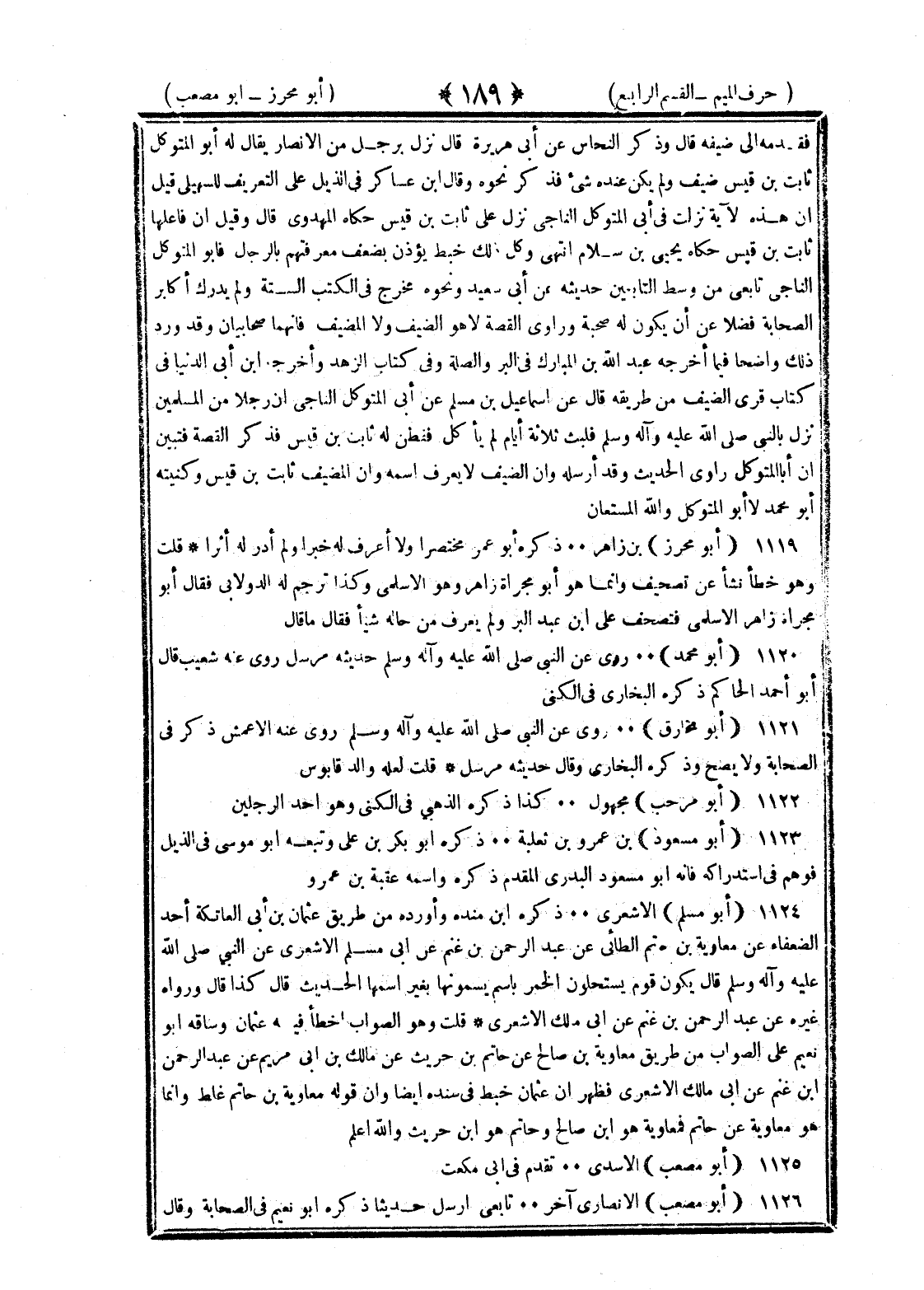 <189> وقدم ما كان عنده إلى ضيفه قال وذكر النحاس عن أبي هريرة قال نزل برجل من الأنصار يقال له أبو المتوكل ثابت بن قيس ضعيف ولم يكن عنده شيء فذكر نحوه وقال بن عساكر في الذيل على التعريف للسهيلي قيل إن هذه الآية نزلت في أبي المتوكل الناجي نزل على ثابت بن قيس حكاه المهدوي قال وقيل إن فاعلها ثابت بن قيس حكاه يحيى بن سلام انتهى وكل ذلك خبط يؤذن بضعف معرفتهم بالرجال فأبو المتوكل الناجي تابعي من وسط التابعين حديثه عن أبي سعيد ونحوه مخرج في الكتب الستة ولم يدرك أكابر الصحابة فضلا عن أن يكون له صحبة وراوي القصة لا هو الضيف ولا المضيف فإنهما صحابيان وقد ورد ذلك واضحا فيما أخرجه عبد الله بن المبارك في البر والصلة وفي كتاب الزهد وأخرجه بن أبي الدنيا في كتاب قرى الضيف من طريقه قال عن إسماعيل بن مسلم عن أبي المتوكل الناجي أن رجلا من المسلمين نزل بالنبي صلى الله عليه وسلم فلبث ثلاثة أيام لم يأكل ففطن له ثابت بن قيس فذكر القصة فتبين أن أبا المتوكل راوي الحديث وقد أرسله وأن الضيف لا يعرف اسمه وأن المضيف ثابت بن قيس وكنيته أبو محمد لا أبو المتوكل والله المستعان أبو محرز بن زاهر ذكره أبو عمر مختصرا ولا أعرف له خبرا ولم أدر لا له أثرا قلت وهو خطأ نشأ عن تصحيف وإنما هو أبو مجزأة زاهر وهو الأسلمي وكذا ترجم له الدولابي فقال أبو مجزأة زاهر الأسلمي فتصحف على بن عبد البر ولم يعرف من حاله شيئا فقال ما قال أبو محمد روى عن النبي صلى الله عليه وسلم حديثه مرسل روى عنه شعيب قال أبو أحمد الحاكم ذكره البخاري في الكنى أبو مخارق روى عن النبي صلى الله عليه وسلم روى عنه الأعمش ذكر في الصحابة ولا يصح وذكره البخاري وقال حديثه مرسل قلت لعله والد قابوس أبو مرحب مجهول كذا ذكره الذهبي في الكنى وهو أحد الرجلين أبو مسعود بن عمرو بن ثعلبة ذكره أبو بكر بن علي وتبعه أبو موسى في الذيل فوهم في استدراكه فإنه أبو مسعود البدري المقدم ذكره واسمه عقبة بن عمرو أبو مسلم الأشعري ذكره بن مندة وأورد من طريق عثمان بن أبي العاتكة أحد الضعفاء عن معاوية بن حاتم الطائي عن عبد الرحمن بن غنم عن أبي مسلم الأشعري عن النبي صلى الله عليه وسلم قال يكون قوم يستحلون الخمر باسم يسمونها بغير اسمها الحديث قال وكذا قال ورواه غيره عن عبد الرحمن بن غنم عن أبي مالك الأشعري قلت وهو الصواب أخطأ فيه عثمان وساقه أبو نعيم على الصواب من طريق معاوية بن صالح عن حاتم بن حريث عن مالك بن أبي مريم عن عبد الرحمن بن غنم عن أبي مالك الأشعري فظهر أن عثمان خبط في سنده أيضا وأن قوله معاوية بن حاتم غلط وإنما هو معاوية عن حاتم معاوية هو بن حريث والله أعلم أبو مصعب الأسدي تقدم في أبي مكعت أبو مصعب الأنصاري آخر تابعي أرسل حديثا ذكره أبو نعيم في الصحابة وقال §