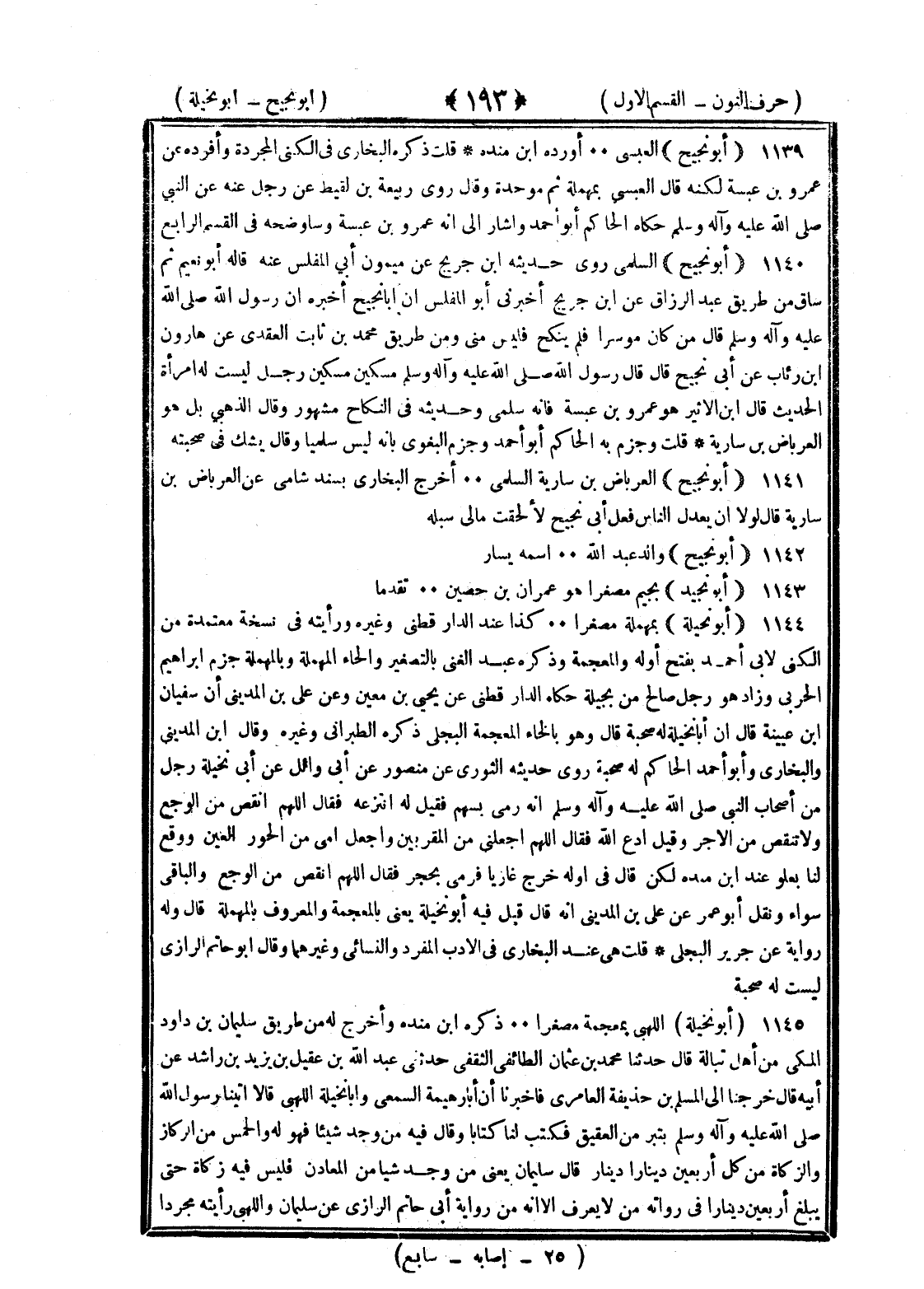 <193> أبو نجيح العبسي أورده بن منده قلت ذكره البخاري في الكنى المجردة وأفرده عن عمرو بن عبسة لكنه قال العبسي بمهملة ثم موحدة وقال روى ربيعة بن لقيط عن رجل عنه عن النبي صلى الله عليه وسلم حكاه الحاكم أبو أحمد وأشار إلى أنه عمرو بن عبسة وسأوضحه في القسم الرابع أبو نجيح السلمي روى حديثه بن جريج عن ميمون عن أبي المغلس عنه قاله أبو نعيم ثم ساق من طريق عبد الرزاق عن بن جريج أخبرني أبو المغلس أن أبا نجيح أخبره أن رسول الله صلى الله عليه وسلم قال من كان موسرا فلم ينكح فليس مني ومن طريق محمد بن ثابت العقدي عن هارون بن رئاب عن أبي نجيح قال قال رسول الله صلى الله عليه وسلم مسكين مسكين رجل ليست له امرأة الحديث قال بن الأثير وهو عمرو بن عنبسة فإنه سلمي وحديثه في النكاح مشهور وقال الذهبي بل هو العرباض بن سارية قلت وجزم به الحاكم أبو أحمد وجزم البغوي بأنه ليس سلميا وقال يشك في صحبته أبو نجيح العرباض بن سارية السلمي أخرج البخاري بسند شامي عن العرباض بن سارية قال لولا أن يقول الناس فعل أبي نجيح لألحقت مالي سبله أبو نجيح والد عبد الله اسمه يسار أبو نجيد بجيم مصغرا هو عمران بن حصين تقدما أبو نحيلة بمهملة مصغرا كذا عند الدارقطني وغيره ورايته في نسخة معتمدة من الكنى لأبي أحمد بفتح أوله والمعجمة وذكره عبد الغني بالتصغير والحاء المهملة وبالمهملة جزم إبراهيم الحربي وزاد هو رجل صالح من بجيلة حكاه الدارقطني عن يحيى بن معين وعن علي بن المديني أن سفيان بن عيينة قال إن أبا نخيلة له صحبة قال وهو بالخاء المعجمة البجلي ذكره الطبراني وغيره وقال بن المديني والبخاري وأبو أحمد الحاكم له صحبة روى حديثه الثوري عن منصور عن أبي وائل عن أبي نخيلة رجل من أصحاب النبي صلى الله عليه وسلم أنه رمى بسهم فقيل له انتزعه فقال اللهم أنقص من الوجع ولا تنقص من الأجر وقيل له ادع الله فقال اللهم اجعلني من المقربين واجعل أمي من الحور العين ووقع لنا بعلو عند بن منده لكن قال في أوله خرج غازيا فرمى بحجر فقال اللهم أنقص من الوجع والباقي سواء ونقل أبو عمر عن علي بن المديني أنه قال قيل فيه أبو نخيلة يعني بالمعجمة والمعروف بالمهملة قال وله رواية عن جرير البجلي قلت هي عند البخاري في الأدب المفرد والنسائي وغيرهما وقال أبو حاتم الرازي ليست له صحبة أبو نخيلة اللهبي بمعجمة مصغرا ذكره بن منده وأخرج له من طريق سليمان بن داود المكي من أهل تبالة قال حدثنا محمد بن عثمان الطائفي الثقفي حدثني عبد الله بن عقيل بن يزيد بن راشد عن أبيه قال خرجنا الى المسلم بن حذيفة العامري فأخبرنا أن أبا رهيمة السمعي وأبا نخيلة اللهبي قالا أتينا رسول الله صلى الله عليه وسلم بتبر من العقيق فكتب لنا كتابا وقال فيه من وجد شيئا فهو له والخمس من الركاز والزكاة من كل أربعين دينارا دينار قال سليمان يعني من وجد شيئا من المعادن فليس فيه زكاة حتى يبلغ أربعين دينارا في رواته من لا يعرف إلا أنه من رواية أبي حاتم الرازي عن سليمان واللهبي رأيته مجودا §