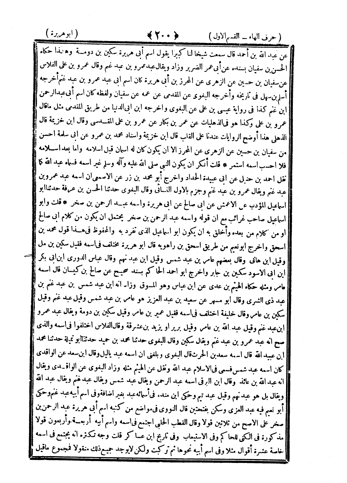 <200> عن عبد الله بن أحمد قال سمعت شيخا لنا كبيرا يقول اسم أبي هريرة سكين بن دومة وهذا حكاه الحسن بن سفيان بسنده عن أبي عمر الضرير وزاد ويقال عبد عمرو بن غنم وقال عمرو بن علي الفلاس عن سفيان بن حسين عن الزهري عن المحرر بن أبي هريرة كان اسم أبي عبد عمرو بن عبد غنم أخرجه أسلم بن سهل في تاريخه وأخرجه البغوي عن المقدمي عن عمه سفيان ولفظه كان اسم أبي هريرة عبد الرحمن بن غنم كذا في رواية عيسى بن علي عن البغوي وأخرجه بن أبي الدنيا من طريق المقدمي مثل ما قال عمرو بن علي وكذا هو في الذهليات عن عمر بن بكار عن عمرو بن علي المقدسي وقال بن خزيمة قال الذهلي هذا أوضح الروايات عندنا على القلب قال بن خزيمة وإسناد محمد بن عمرو عن أبي سلمة أحسن من سفيان بن حسين عن الزهري عن المحرر إلا أن يكون كان له اسمان قبل إسلامه وأما بعد إسلامه فلا أحسب اسمه استمر قلت أنكر أن يكون النبي صلى الله عليه وسلم غير اسمه فسماه عبد الرحمن كما نقل أحمد بن حنبل عن أبي عبيدة الحداد وأخرج أبو محمد بن زيد عن الأصمعي أن اسمه عبد عمرو بن عبد غنم ويقال عمرو بن عبد غنم وجزم بالأول النسائي وقال البغوي حدثنا الحسن بن عرفة حدثنا أبو إسماعيل المؤدب عن الأعمش عن أبي صالح عن أبي هريرة واسمه عبد الرحمن بن صخر قلت وأبو إسماعيل صاحب غرائب مع أن قوله واسمه عبد الرحمن بن صخر يحتمل أن يكون من كلام أبي صالح أو من كلام من بعده وأخلق به أن يكون أبو إسماعيل الذي تفرد به والمحفوظ في هذا قول محمد بن إسحاق وأخرج أبو نعيم من طريق إسحاق بن راهويه قال أبو هريرة مختلف في اسمه فقيل سكين بن مل وقيل بن هانئ وقال بعضهم عمر بن عبد شمس وقيل بن عبد نهم وقال عباس الدوري عن أبي بكر بن أبي الأسود سكين بن جابر وأخرج أبو أحمد الحاكم بسند صحيح عن صالح بن كيسان قال اسمه عامر ومثله حكاه الهيثم بن عدي عن بن عباس وهو المسوق وزاد انه بن عبد شمس بن عبد غنم بن عبد ذي الشري وقال أبو مسهر عن سعيد بن عبد العزيز هو عامر بن عبد شمس وقيل عبد غنم وقيل سكين بن عامر وقال خليفة اختلف في اسمه فقيل عمير بن عامر وقيل سكين بن دومة ويقال عبد عمرو بن عبد غنم وقيل عبد الله بن عامر وقيل برير أو يزيد بن عشرقة وقال الفلاس اختلفوا في اسمه والذي صح أنه عبد عمرو بن عبد غنم ويقال سكين وقال البغوي حدثنا محمد بن حميد حدثنا أبو نميلة حدثنا محمد بن عبيد الله قال اسمه سعد بن الحارث قال البغوي وبلغني أن اسمه عبد ياليل وقال بن سعد عن الواقدي كان اسمه عبد شمس فسمى في الإسلام عبد الله ونقل عن الهيثم مثله وزاد البغوي عن الواقدي ويقال إنه عبد الله بن عائذ وقال بن البرقي اسمه عبد الرحمن ويقال عبد شمس ويقال عبد غنم ويقال عبد الله ويقال بل هو عبد نهم وقيل عبد تيم وحكى بن منده في أسمائه عبد بغير إضافة وفي اسم أبيه عبد غنم وحكى أبو نعيم فيه عبد العزى وسكن بفتحتين قال النووي في مواضع من كتبه اسم أبي هريرة عبد الرحمن بن صخر على الأصح من ثلاثين قولا وقال القطب الحلبي اجتمع في اسمه واسم أبيه أربعة وأربعون قولا مذكورة في الكنى للحاكم وفي الاستيعاب وفي تاريخ بن عساكر قلت وجه تكثره أنه يجتمع في اسمه خاصة عشرة أقوال مثلا وفي اسم أبيه نحوها ثم تركبت ولكن لا يوجد جميع ذلك منقولا فمجموع ما قيل §