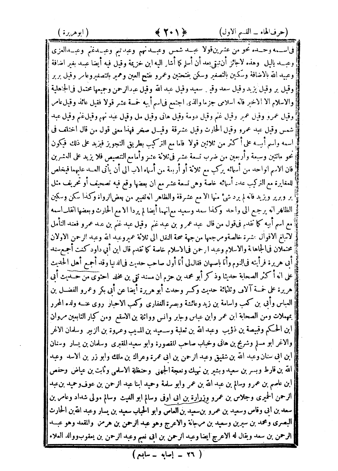 <201> في اسمه وحده نحو من عشرين قولا عبد شمس وعبد نهم وعبد تيم وعبد غنم وعبد العزى وعبد ياليل وهذه لا جائز أن تبقى بعد أن أسلم كما أشار إليه بن خزيمة وقيل فيه أيضا عبيد بغير إضافة وعبيد الله بالإضافة وسكين بالتصغير وسكن بفتحتين وعمرو بفتح العين وعمير بالتصغير وعامر وقيل برير وقيل بر وقيل يزيد وقيل سعد وقيل سعيد وقيل عبد الله وقيل عبد الرحمن وجميعها محتمل في الجاهلية والإسلام إلا الأخير فإنه إسلامي جزما والذي اجتمع في اسم أبيه خمسة عشر قولا فقيل عائذ وقيل عامر وقيل عمرو وقيل عمير وقيل غنم وقيل دومة وقيل هانئ وقيل مل وقيل عبد نهم وقيل عبد غنم وقيل عبد شمس وقيل عبد عمرو وقيل الحارث وقيل عشرقة وقيل صخر فهذا معنى قول من قال اختلف في اسمه واسم أبيه على أكثر من ثلاثين قولا فأما مع التركيب بطريق التجويز فيزيد على ذلك نحو مائتين وسبعة وأربعين من ضرب تسعة عشر في ثلاثة عشر وأما مع التنصيص فلا يزيد على العشرين فإن الاسم الواحد من أسمائه يركب مع ثلاثة أو أربعة من أسماء الأب إلى أن يأتي العد عليهما فيخلص للمغايرة مع التركيب عدد أسمائه خاصة وهي تسعة عشر مع أن بعضها وقع فيه تصحيف أو تحريف مثل بر وبرير ويزيد فإنه لم يرد شيئا منها إلا مع عشرقة والظاهر أنه تغيير من بعض الرواة وكذا سكن وسكين والظاهر أنه يرجع إلى واحد وكذا سعد وسعيد مع أنهما أيضا لم يردا إلا مع الحارث وبعضها انقلب اسم مع أبيه كما تقدم في قوله من قال عبد عمرو بن عبد غنم وقيل عن غنم بن عبد عمرو فعند التأمل لا تبلغ الأقوال عشرة خالصة ومزجها من جهة صحة النقل إلى ثلاثة عمير وعبد الله وعبد الرحمن الأولان محتملان في الجاهلية والإسلام وعبد الرحمن في الإسلام خاصة كما تقدم قال بن أبي داود كنت أجمع سند أبي هريرة فرأيته في النوم وأنا بأصبهان فقال لي أنا أول صاحب حدثت في الدنيا وقد أجمع أهل الحديث على أنه أكثر الصحابة حديثا وذكر أبو محمد بن حزم أن مسند بقي بن مخلد احتوى من حديث أبي هريرة على خمسة آلاف وثلاثمائة حديث وكسر وحدث أبو هريرة أيضا عن أبي بكر وعمر والفضل بن العباس وأبي بن كعب وأسامة بن زيد وعائشة وبصرة الغفاري وكعب الأحبار روى عنه ولده المحرر بمهملات ومن الصحابة بن عمر وابن عباس وجابر وأنس وواثلة بن الأسقع ومن كبار التابعين مروان بن الحكم وقبيصة بن ذؤيب وعبد الله بن ثعلبة وسعيد بن المسيب وعروة بن الزبير وسلمان الإغر والإغر أبو مسلم وشريح بن هانئ وخباب صاحب المقصورة وأبو سعيد المقبري وسليمان بن يسار وسنان بن أبي سنان وعبد الله بن شقيق وعبد الرحمن بن أبي عمرة وعراك بن مالك وأبو رزين الأسدي وعبد الله بن قارظ وبسر بن سعيد وبشير بن نهيك وبعجة الجهني وحنظلة الأسلمي وثابت بن عياض وحفص بن عاصم بن عمرو وسالم بن عبد الله بن عمر وأبو سلمة وحميد ابنا عبد الرحمن بن عوف وحميد بن عبد الرحمن الحميري وخلاس بن عمرو وزرارة بن أبي أوفى وسالم أبو الغيث وسالم مولى شداد وعامر بن سعد بن أبي وقاص وسعيد بن عمرو بن سعيد بن العاص وأبو الحباب سعيد بن يسار وعبد الله بن الحارث البصري ومحمد بن سيرين وسعيد بن مرجانة والأعرج وهو عبد الرحمن بن هرمز والمقعد وهو عبد الرحمن بن سعيد ويقال له الأعرج أيضا وعبد الرحمن بن أبي نعيم وعبد الرحمن بن يعقوب والد العلاء §