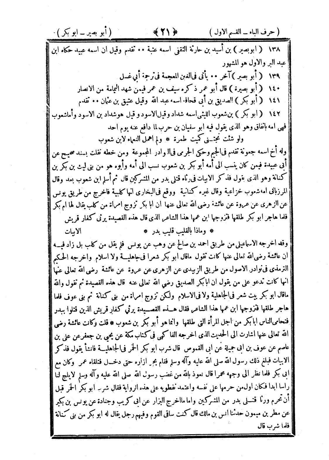 <21> أبو بصير بن أسيد بن جارية الثقفي اسمه عتبة تقدم وقيل إن اسمه عبيد حكاه بن عبد البر والأول هو المشهور أبو بصير آخر يأتي في الغين المعجمة في ترجمة أبي غسل أبو بصيرة قال أبو عمر ذكره سيف بن عمر فيمن شهد اليمامة من الأنصار أبو بكر الصديق بن أبي قحافة اسمه عبد الله وقيل عتيق بن عثمان تقدم أبو بكر بن شعوب الليثي اسمه شداد وقيل الأسود وقيل هو شداد بن الأسود وأما شعوب فهي أمه باتفاق وهو الذي يقول فيه أبو سفيان بن حرب لما دافع عنه يوم أحد ولو شئت نجتني كميت طمرة ولم أحمل النعماء لابن شعوب وله أخ اسمه جعونة تقدم في الجيم وحكى الجرمي في النوادر المجموعة ومن خطه نقلت بسند صحيح عن أبي عبيدة فيمن كان ينسب الى أمه أبو بكر بن شعوب نسب الى أمه وأبوه هو من بني ليث بن بكر بن كنانة وهو الذي يقول فذكر الأبيات في رثاء قتلى بدر من المشركين قال ثم أسلم بن شعوب بعد وقال المرزباني أمه شعوب خزاعية وقال غيره كنانية ووقع في البخاري أنها كلبية فأخرج من طريق يونس عن الزهري عن عروة عن عائشة رضي الله عنها أن أبا بكر تزوج امرأة من كلب يقال لها أم بكر فلما هاجر أبو بكر طلقها فتزوجها بن عمها هذا الشاعر الذي قال هذه القصيدة يرثي كفار قريش وماذا بالقليب قليب بدر الأبيات وقد أخرجه الإسماعيلي من طريق أحمد بن صالح عن وهب عن بن يونس فلم يقل من كلب بل زاد فيه ان عائشة رضي الله عنها كانت تقول ما قال أبو بكر شعرا في جاهلية ولا إسلام وأخرجه الحكيم الترمذي في نوادر الأصول من طريق الزبيدي عن الزهري عن عروة عن عائشة رضي الله عنها أنها كانت تدعو على من يقول إن أبا بكر الصديق رضي الله عنه قال هذه القصيدة ثم تقول والله ما قال أبو بكر بيت شعر في الجاهلية ولا في الإسلام ولكن تزوج امرأة من بني كنانة ثم بنى عوف فلما هاجر طلقها فتزوجها بن عمها هذا الشاعر فقال هذه القصيدة يرثي كفار قريش الذين قتلوا ببدر فتحامى الناس أبا بكر من أجل المرأة التي طلقها وإنما هو أبو بكر بن شعوب قلت وكانت عائشة أشارت الى الحديث الذي أخرجه الفاكهي في كتاب مكة عن يحيى بن جعفر عن علي بن عاصم عن عوف بن أبي جميلة عن أبي القموص قال شرب أبو بكر الخمر في الجاهلية فأنشأ يقول فذكر الأبيات فبلغ ذلك رسول الله صلى الله عليه وسلم فقام يجر إزاره حتى دخل فتلقاه عمر وكان مع أبي بكر فلما نظر الى وجهه محمرا قال نعوذ بالله من غضب رسول الله صلى الله عليه وسلم والله لا يلج لنا رأسا أبدا فكان أول من حرمها على نفسه واعتمد نفطويه على هذه الرواية فقال شرب أبو بكر الخمر قبل أن تحرم ورثى قتلى بدر من المشركين وأما ما أخرج البزار عن أبي كريب وجنادة عن يونس بن بكير عن مطر بن ميمون حدثنا أنس بن مالك قال كنت ساقي القوم وفيهم رجل يقال له أبو بكر من بني كنانة فلما شرب قال §