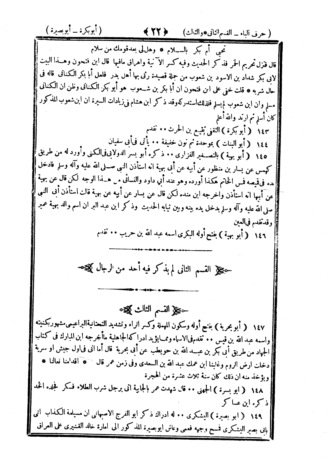 <22> تحيى أم بكر بالسلام وهل لي بعد قومك من سلام يحدثنا الرسول بأن سنحيى وكيف حياة أصداء وهام قال فنزل تحريم الخمر فذكر الحديث وفيه كسر الآنية وإهراق ما فيها قال بن فتحون وهذا البيت لأبي بكر شداد بن الأسود بن شعوب من جملة قصيدة رثى بها أهل بدر فلعل أبا بكر الكناني تمثل بها في حال شربه قلت خفي على بن فتحون أن أبا بكر بن شعوب هو أبو بكر الكناني وظن أن الكناني مسلم وأن بن شعوب لم يسلم فلذلك استدركه وقد ذكر بن هشام في زيادات السيرة أن بن شعوب المذكور كان أسلم ثم ارتد والله أعلم أبو بكرة الثقفي نفيع بن الحارث تقدم أبو البنات بموحدة ثم نون خفيفة يأتي في أبي سفيان أبو بهيسة بالتصغير الفزاري ذكره أبو بشر الدولابي في الكنى وأورد له من طريق كهمس عن يسار بن منظور عن أبي بهيسة أنه استأذن النبي صلى الله عليه وسلم فأدخل يده في قميصه فمس الخاتم هكذا أورده وهو عند أبي داود والنسائي من هذا الوجه لكن قال عن بهيسة عن أبيها أنه استأذن وأخرجه بن منده لكن قال عن يسار عن أبيه عن بهيسة قالت استأذن أبي النبي صلى الله عليه وسلم يدخل يده بينه وبين ثيابه الحديث وذكر ان عبد البر أن اسم والد بهيسة عمير وقد تقدم في العين أبو بهية بفتح أوله البكري اسمه عبد الله بن حرب تقدم القسم الثاني لم يذكر فيه أحد من الرجال القسم الثالث أبو بحرية بفتح أوله وسكون المهملة وكسر الراء وتشديد التحتانية التراغمي مشهور بكنيته واسمه عبد الله بن قيس تقدم في الأسماء ومما يؤيد إدراكه الجاهلية ما أخرجه بن المبارك في كتاب الجهاد من طريق أبي بكر بن عبد الله بن حويطب عن أبي بحرية قال أما إني في أول جيش أو سرية دخلت أرض الروم وغلبنا بن عمك عبد الله بن السعدي وفي زمن عمر قال قدامنا ثقالنا ويؤخذ منه أن ذلك كان سنة ثلاث عشرة من الهجرة أبو بسرة الجهني قال شهدت عمر بالجابية أتى برجل شرب الطلاء فسكر فجلده الحد ذكره بن عساكر أبو بصيرة اليشكري له إدراك ذكر أبو الفرج الأصبهاني أن مسيلمة الكذاب أتى بأبي بصيرة اليشكري فمسح وجهه فعمى وعاش أبو بصيرة المذكور الى إمارة خالد القشيري على العراق §