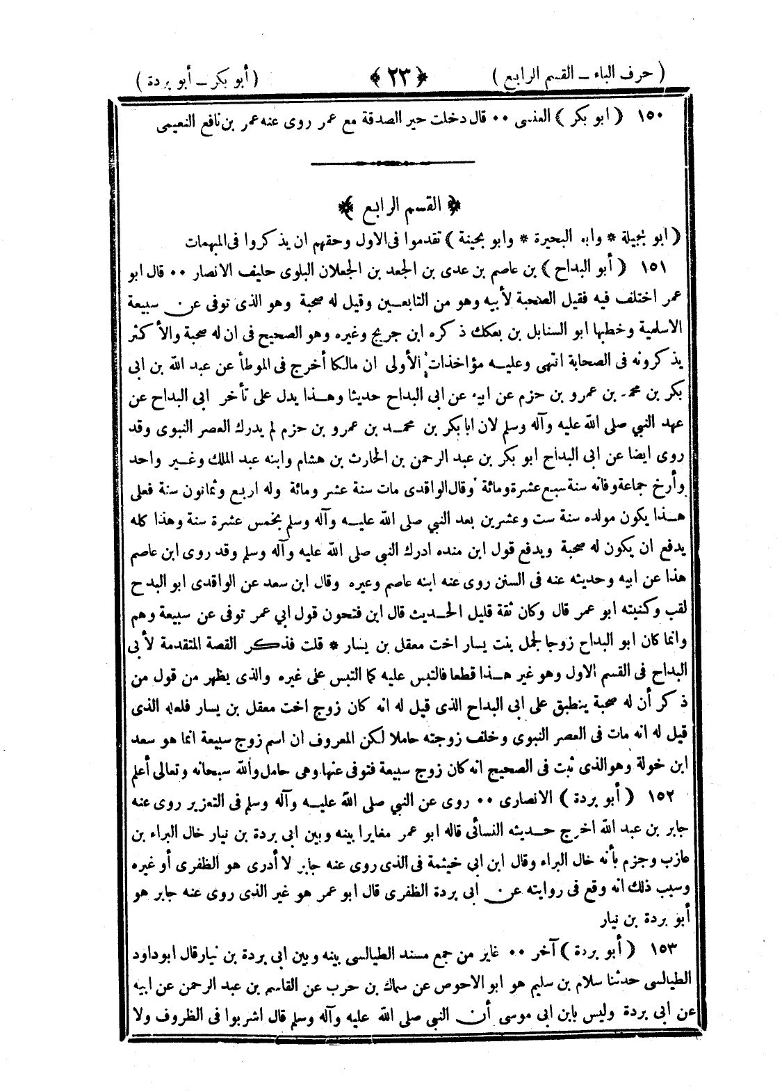 <23> أبو بكر العنسي قال دخلت حير الصدقة مع عمر روى عنه عمر بن نافع النعيمي القسم الرابع أبو بجيلة وأبو البجير وأبو بحينة تقدموا في الأول وحقهم أن يذكروا في المبهمات أبو البداح بن عاصم بن عدي بن الجد بن العجلان البلوي حليف الأنصار قال أبو عمر اختلف فيه فقيل الصحبة لأبيه وهو من التابعين وقيل له صحبة وهو الذي توفي عن سبعية الأسلمية وخطبها أبو السنابل بن بعكك ذكره بن جريج وغيره وهو الصحيح في أن له صحبة والأكثر يذكرونه في الصحابة انتهى وعليه مؤاخذات الأولى أن مالكا أخرج في الموطأ عن عبد الله بن أبي بكر بن محمد بن عمرو بن جزم عن أبيه عن أبي البداح حديثا وهذا يدل على تأخر أبي البداح عن عهد النبي صلى الله عليه وسلم لأن أبا بكر بن محمد بن عمرو بن حزم لم يدرك العصر النبوي وقد روى أيضا عن أبي البداح أبو بكر بن عبد الرحمن بن الحارث بن هشام وابنه عبد الملك وغير واحد وأرخ جماعة وفاته سنة سبع عشرة ومائة وقال الواقدي مات سنة عشر ومائة وله أربع وثمانون سنة فعلى هذا يكون مولده سنة ست وعشرين بعد النبي صلى الله عليه وسلم بخمس عشرة سنة وهذا كله يدفع أن يكون له صحبة ويدفع قول بن منده أدرك النبي صلى الله عليه وسلم وقد روى بن عاصم هذا عن أبيه وحديثه عنه في السنن روى عنه ابنه عاصم وغيره وقال بن سعد عن الواقدي أبو البداح لقب وكنيته أبو عمرو قال وكان ثقة قليل الحديث قال بن فتحون قول أبي عمر توفي عن سبيعة وهم إنما كان أبو البداح زوجا لجمل بنت يسار أخت معقل بن يسار قلت فذكر القصة المتقدمة لأبي البداح في القسم الأول وهو غير هذا قطعا فالتبس عليه كما التبس على غيره والذي يظهر من قول من ذكر أن له صحبة ينطبق على أبي البداح الذي قيل له إنه كان زوج أخت معقل بن يسار فلعله الذي قيل له إنه مات في العصر النبوي وخلف زوجته حاملا لكن المعروف أن اسم زوج سبيعة إنما هو سعد بن خولة وهو الذي ثبت في الصحيح أنه كان زوج سبيعة فتوفي عنها وهي حامل والله سبحانه وتعالى أعلم أبو بردة الأنصاري روى عن النبي صلى الله عليه وسلم في التعزير روى عنه جابر بن عبد الله أخرج حديثه النسائي قاله أبو عمر مغايرا بينه وبين أبي بردة بن نيار خال البراء بن عازب وجزم بأنه خال البراء وقال بن أبي خيثمة في الذي روى عنه جابر لا أدري هو الظفري أو غيره وسبب ذلك أنه وقع في روايته عن أبي بردة الظفري قال أبو عمر هو غير الذي روى عنه جابر هو أبو بردة بن نيار أبو بردة آخر غاير من جمع مسند الطيالسي بينه وبين أبي بردة بن نيار قال أبو داود الطيالسي حدثنا سلام بن سليم هو أبو الأحوص عن سماك بن حرب عن القاسم بن عبد الرحمن عن أبيه عن أبي بردة وليس بابن أبي موسى أن النبي صلى الله عليه وسلم قال اشربوا في الظروف ولا §