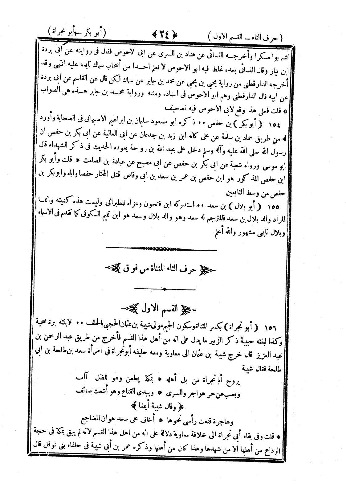 <24> تشربوا مسكرا وأخرجه النسائي عن هناد بن السري عن أبي الأحوص فقال في روايته عن أبي بردة بن نيار وقال النسائي بعده غلط فيه أبو الأحوص لا نعلم أحدا من أصحاب سماك تابعه عليه انتهى وقد أخرجه الدارقطني من رواية يحيى بن يحيى عن محمد بن جابر عن سماك لكن قال عن القاسم عن أبي بردة عن أبيه قال الدارقطني وهم أبو الأحوص في إسناده ومتنه ورواية محمد بن جابر هذه هي الصواب قلت فعلى هذا وقع لأبي الأحوص فيه تصحيف أبو بكر بن حفص ذكره أبو مسعود سليمان بن إبراهيم الأصبهاني في الصحابة وأورد له من طريق حماد بن سلمة عن علي كأنه بن زيد بن جدعان عن أبي العالية عن أبي بكر بن حفص أن رسول الله صلى الله عليه وسلم دخل على عبد الله بن رواحة يعوده الحديث في ذكر الشهداء قال أبو موسى ورواه شعبة عن أبي بكر بن حفص عن أبي مصبح عن عبادة بن الصامت قلت وأبو بكر بن حفص المذكور هو بن حفص بن عمر بن سعد بن أبي وقاص قتل المختار حفصا وأباه وأبو بكر بن حفص من وسط التابعين أبو بلال بن سعد استدركه بن فتحون وعزاه للطبراني وليست هذه كنيته وإنما المراد والد بلال بن سعد فالمترجم له سعد وهو والد بلال وسعد هو بن تميم السكوني كما تقدم في الأسماء وبلال تابعي مشهور والله أعلم