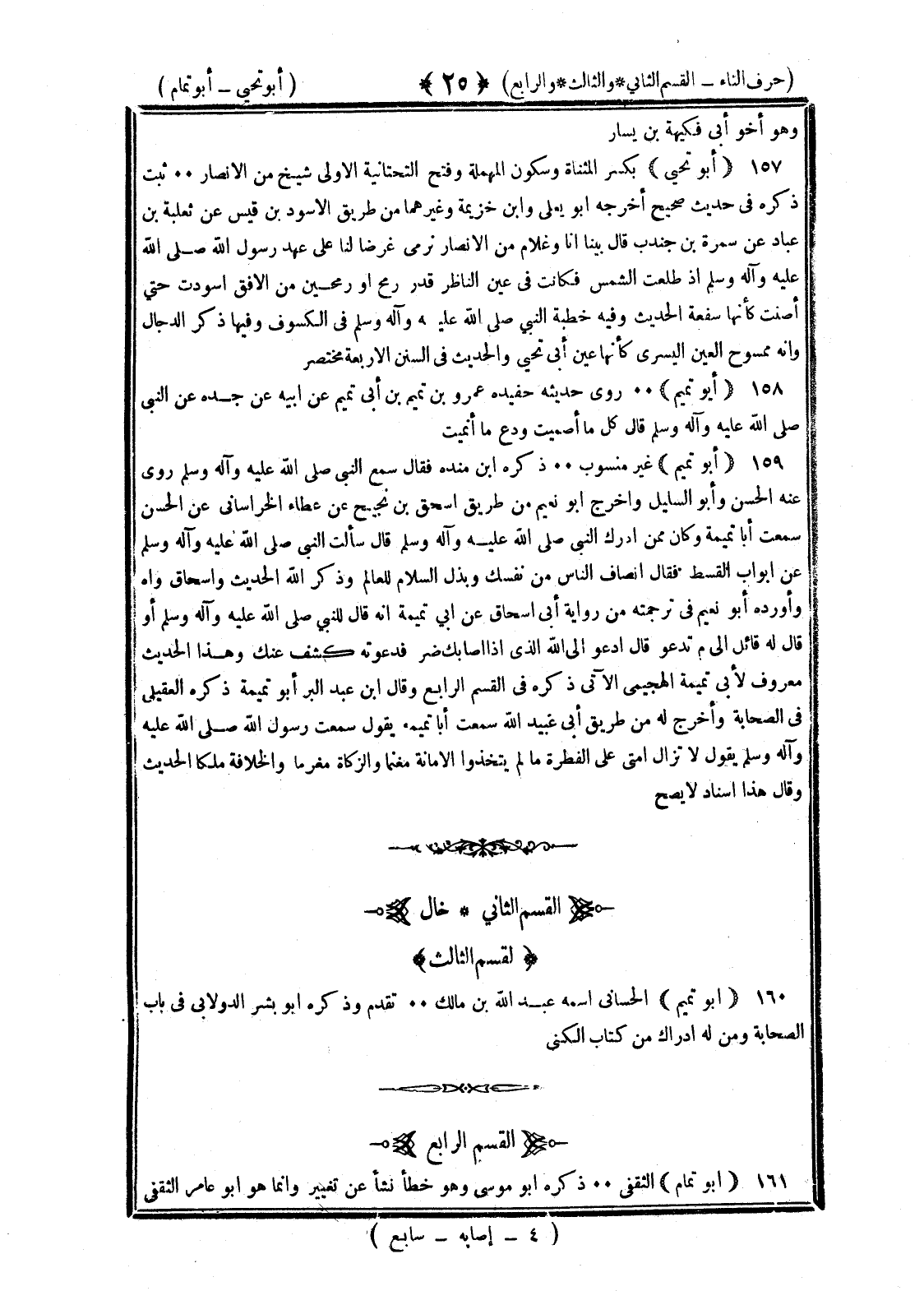 <25> وهو أخو أبي فكيهة بن يسار أبو تحيى بكسر المثناة وسكون المهملة وفتح التحتانية الأولى شيخ من الأنصار ثبت ذكره في حديث صحيح أخرجه أبو يعلى وابن خزيمة وغيرهما من طريق الأسود بن قيس عن ثعلبة بن عباد عن سمرة بن جندب قال بينا أنا غلام من الأنصار نرمي غرضا لنا على عهد رسول الله صلى الله عليه وسلم إذ طلعت الشمس فكانت في عين الناظر قدر رمح أو رمحين من الأفق اسودت حتى آضت كأنها تنومة الحديث وفيه خطبة النبي صلى الله عليه وسلم في الكسوف وفيها ذكر الدجال وأنه ممسوح العين اليسري كأنها عين أبي تحيى شيخ بينه وبين حجرة عائشة والحديث في السنن الأربعة مختصر أبو تميم روى حديثه حفيده عمرو بن تميم بن أبي تميم عن أبيه عن جده عن النبي صلى الله عليه وسلم قال كل ما أصميت ودع ما أنميت أبو تميمة غير منسوب ذكره بن منده فقال سمع النبي صلى الله عليه وسلم روى عنه الحسن وأبو السليل وأخرج أبو نعيم من طريق إسحاق بن نجيح عن عطاء الخراساني عن الحسن سمعت أبا تميمة وكان ممن أدرك النبي صلى الله عليه وسلم قال سألت النبي صلى الله عليه وسلم عن أبواب القسط فقال إنصاف الناس من نفسك وبذل السلام للعالم وذكر الله الحديث وإسحاق واه وأورده أبو نعيم في ترجمته من رواية أبي إسحاق عن أبي تميمة أنه قال للنبي صلى الله عليه وسلم أو قال له قائل إلام تدعو قال أدعو إلى الله الذي إذا أصابك ضر فدعوته كشف عنك وهذا الحديث معروف لأبي تميمة الهجيمي الآتي ذكره في القسم الرابع وقال بن عبد البر أبو تميمة ذكره العقيلي في الصحابة وأخرج له من طريق أبي عبيد الله سمعت أبا تميمة يقول سمعت رسول الله صلى الله عليه وسلم يقول لا تزال أمتي على الفطرة ما لم يتخذوا الأمانة مغنما والزكاة مغرما والخلافة ملكا الحديث وقال هذا إسناد لا يصح القسم الثاني خال القسم الثالث أبو تميم الجيشاني اسمه عبد الله بن مالك تقدم وذكره أبو بشر الدولابي في باب الصحابة ومن له إدراك من كتاب الكنى القسم الرابع أبو تمام الثقفي ذكره أبو موسى وهو خطأ نشأ عن تغيير وإنما هو أبو عامر الثقفي §