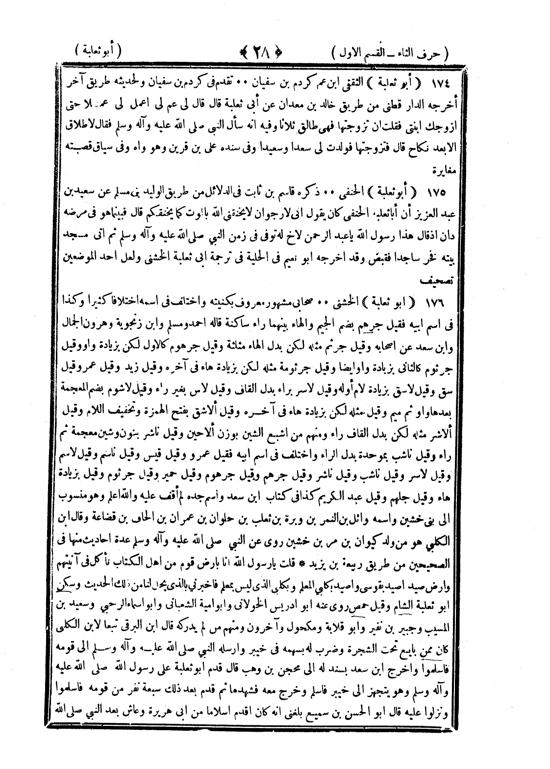<28> أبو ثعلبة الثقفي بن عم كردم بن سفيان تقدم في كردم بن سفيان ولحديثه طريق آخر أخرجه الدارقطني من طريق خالد بن معدان عن أبي ثعلبة قال قال لي عم لي اعمل عملا حتى أزوجك ابنتي فقلت إن تزوجتها فهي طالق ثلاثا وفيه أنه سأل النبي صلى الله عليه وسلم فقال لا طلاق إلا بعد نكاح قال فتزوجتها فولدت لي سعدا وسعيدا وفي سنده على بن قرين وهو واه وفي سياق قصته مغايرة أبو ثعلبة الحنفي ذكره قاسم بن ثابت في الدلائل من طريق الوليد بن مسلم عن سعيد بن عبد العزيز أن أبا ثعلبة الحنفي كان يقول إني لأرجو ألا يخنقني الله بالموت كما يخنقكم قال فبينما هو في صرحة داره إذ قال هذا رسول الله يا عبد الرحمن لأخ له توفي في زمن النبي صلى الله عليه وسلم ثم أتى مسجد بيته فخر ساجدا فقبض وقد أخرجه أبو نعيم في الحلية في ترجمة أبي ثعلبة الخشني ولعل أحد الموضعين تصحيف أبو ثعلبة الخشني صحابي مشهور معروف بكنيته واختلف في اسمه اختلافا كثيرا وكذا في اسم أبيه فقيل جرهم بضم الجيم والهاء بينهما راء ساكنة قاله أحمد ومسلم وابن زنجويه وهارون الحمال وابن سعد عن أصحابه وقيل جرثم مثله لكن بدل الهاء مثلثة وقيل جرهوم كالأول لكن بزيادة واو وقيل جرثوم كالثاني بزيادة واو أيضا وقيل جرثومة مثله لكن بزيادة هاء في آخره وقيل زيد وقيل عمر وقيل سق وقيل لاسق بزيادة لام أوله وقيل لاسر براء بدل القاف وقيل لاس بغير راء وقيل لا شوم بضم المعجمة بعدها واو ثم ميم وقيل مثله لكن بزيادة هاء في آخره وقيل الأشق بفتح الهمزة وتخفيف اللام وقيل الأشر مثله لكن بدل القاف راء ومنهم من أشبع الشين بوزن ألاحين وقيل ناشر بنون وشين معجمة ثم راء وقيل ناشب بموحدة بدل الراء وقيل غرنوق واختلف في اسم أبيه فقيل عمرو وقيل قيس وقيل ناسم وقيل لاسم وقيل لاسر وقيل ناشب وقيل ناشر وقيل جرهم وقيل جرهوم وقيل حمير وقيل جرثوم وقيل بزيادة هاء وقيل جلهم وقيل عبد الكريم كذا في كتاب بن سعد واسم جده لم أقف عليه والله أعلم وهو منسوب إلى بني خشين واسمه وائل بن النمر بن وبرة بن تغلب بن حلوان بن عمران بن الحاف بن قضاعة وقال بن الكلبي هو من ولد ليوان بن مر بن خشين روى عن النبي صلى الله عليه وسلم عدة أحاديث منها في الصحيحين من طريق ربيعة بن يزيد قلت يا رسول الله إنا بأرض قوم من أهل الكتاب نأكل في آنيتهم وأرض صيد أصيد بقوسي وأصيد بكلبي المعلم وبكلبي الذي ليس بمعلم فأخبرني بالذي يحل لنا من ذلك الحديث وسكن أبو ثعلبة الشام وقيل حمص روى عنه أبو إدريس الخولاني وأبو أمية الشعباني وأبو أسماء الرحبي وسعيد بن المسيب وجبير بن نفير وأبو قلابة ومكحول وآخرون ومنهم من لم يدركه قال بن البرقي تبعا لابن الكلبي كان ممن بايع تحت الشجرة وضرب له بسهمه في خيبر وأرسله النبي صلى الله عليه وسلم إلى قومه فأسلموا وأخرج بن سعد بسند له إلى محجن بن وهب قال قدم أبو ثعلبة على رسول الله صلى الله عليه وسلم وهو يتجهز إلى خيبر فأسلم وخرج معه فشهدها ثم قدم بعد ذلك سبعة نفر من قومه فأسلموا ونزلوا عليه قال أبو الحسن بن سميع بلغني أنه كان أقدم إسلاما من أبي هريرة وعاش بعد النبي صلى الله §