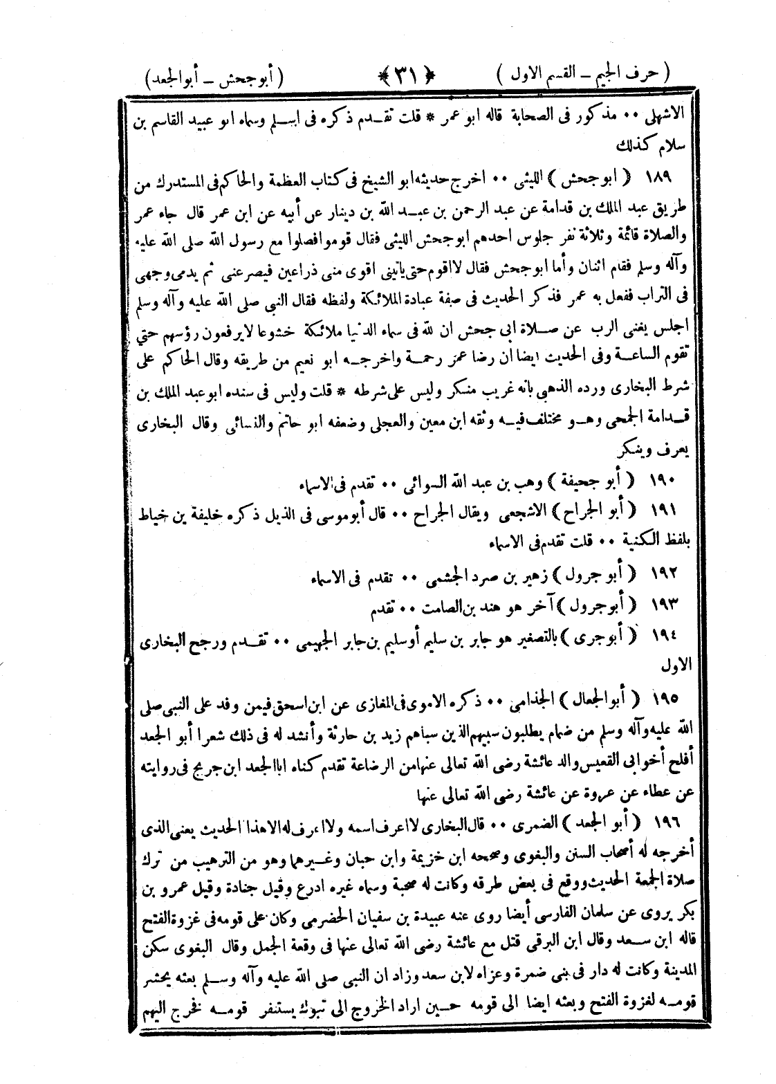 <31> الأشهلي مذكور في الصحابة قاله أبو عمر قلت تقدم ذكره في أسلم وسماه أبو عبيد القاسم بن سلام كذلك أبو جحش الليثي أخرج حديثه أبو الشيخ في كتاب العظمة والحاكم في المستدرك من طريق عبد الملك بن قدامة عن عبد الرحمن بن عبد الله بن دينار عن أبيه عن بن عمر قال جاء عمر والصلاة قائمة وثلاثة نفر جلوس أحدهم أبو جحش الليثي فقال قوموا فصلوا مع رسول الله صلى الله عليه وسلم فقام اثنان وأما أبو جحش فقال لا أقوم حتى يأتيني أقوى مني ذراعين فيصرعني حتى يدمي وجهي في التراب ففعل به عمر فذكر الحديث في صفة عباد الملائكة ولفظه فقال النبي صلى الله عليه وسلم اجلس يغني الرب عن صلاة أبي جحش إن لله في سماء الدنيا ملائكة خشوعا لا يرفعون رءوسهم حتى تقوم الساعة وفي الحديث أيضا إن رضا عمر رحمة وأخرجه أبو نعيم من طريقه وقال الحاكم على شرط البخاري ورده الذهبي بأنه غريب منكر وليس على شرطه قلت وليس في سنده إلا عبد الملك بن قدامة الجمحي وهو مختلف فيه وثقه بن معين والعجلي وضعفه أبو حاتم والنسائي وقال البخاري يعرف وينكر أبو جحيفة وهب بن عبد الله السوائي تقدم في الأسماء أبو الجراح الأشجعي ويقال الجراح قال أبو موسى في الذيل ذكره خليفة بن خياط بلفظ الكنية قلت تقدم في الأسماء أبو جرول زهير بن صرد الجشمي تقدم في الأسماء جرول آخر هو هند بن الصامت تقدم أبو جري بالتصغير هو جابر بن سليم أو سليم بن جابر الهجيمي تقدم ورجح البخاري الأول أبو الجعال الجذامي ذكره الأموي في المغازي عن بن إسحاق فيمن وفد على النبي صلى الله عليه وسلم من ضمام يطلبون سبيهم الذين سباهم زيد بن حارثة وأنشد له في ذلك شعرا أبو الجعد أفلح أخو أبي القعيس والد عائشة رضي الله عنها من الرضاعة تقدم كناه أبا الجعد بن جريج في روايته عن عطاء عن عروة عن عائشة رضي الله عنها أبو الجعد الضمري قال البخاري لا أعرف اسمه ولا أعرف له إلا هذا الحديث يعني الذي أخرجه له أصحاب السنن والبغوي وصححه بن خزيمة وابن حبان وغيرهما وهو من الترهيب من ترك صلاة الجمعة الحديث ووقع في بعض طرقه وكانت له صحبة وسماع غيره أدرع وقيل جنادة وقيل عمرو بن بكر يروي عن سلمان الفارسي أيضا روى عنه عبيدة بن سفيان الحضرمي وكان على قومه في غزوة الفتح قاله بن سعد وقال بن البرقي قتل مع عائشة رضي الله عنها في وقعة الجمل وقال البغوي سكن المدينة وكانت له دار في بني ضمرة وعزاه لابن سعد وزاد أن النبي صلى الله عليه وسلم بعثه يحشر قومه لغزو الفتح وبعثه أيضا إلى قومه حين أراد الخروج إلى تبوك يستنفر قومه فخرج إليهم §