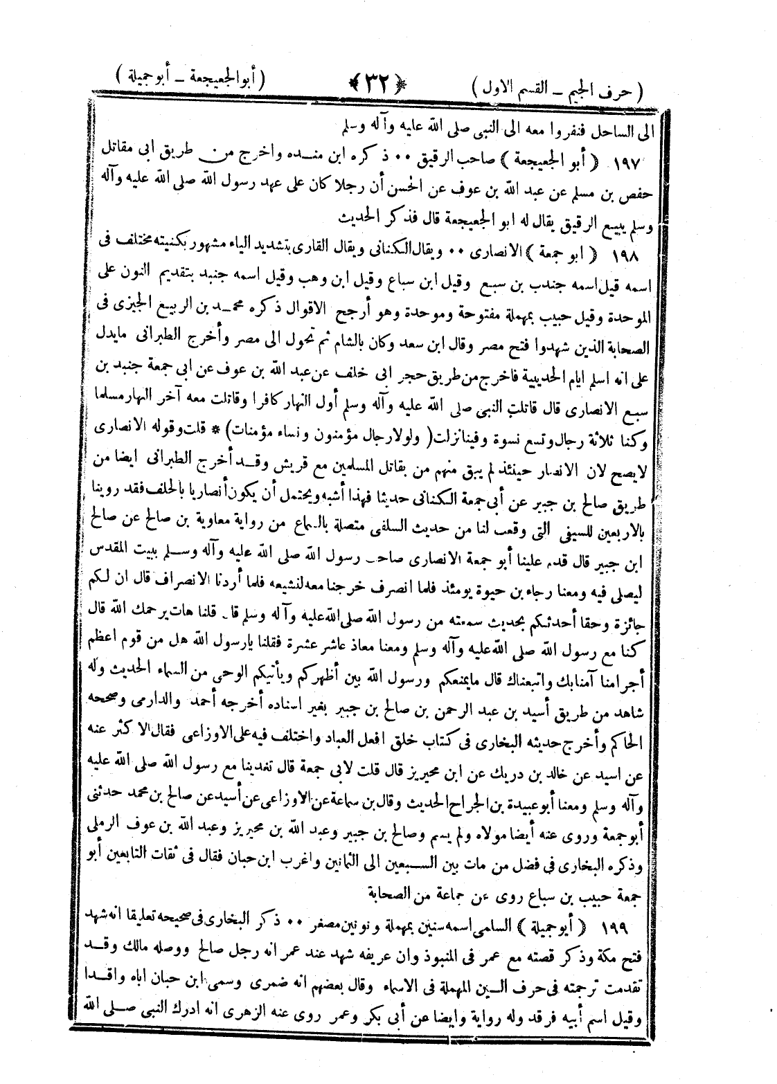 <32> إلى الساحل فنفروا معه إلى النبي صلى الله عليه وسلم أبو الجعيجعة صاحب الرقيق ذكره بن منده وأخرج من طريق أبي مقاتل حفص بن مسلم عن عبد الله بن عوف عن الحسن أن رجلا كان على عهد رسول الله صلى الله عليه وسلم يبيع الرقيق يقال له أبو الجعيجعة قال فذكر الحديث أبو جمعة الأنصاري ويقال الكناني ويقال القاري بتشديد الياء مشهور بكنيته مختلف في اسمه قيل اسمه جندب بن سبع وقيل بن سباع وقيل بن وهب وقيل اسمه جنبد بتقديم النون على الموحدة وقيل حبيب بمهملة مفتوحة وموحدة وهو أرجح الأقوال ذكره محمد بن الربيع الجيزي في الصحابة الذين شهدوا فتح مصر وقال بن سعد وكان بالشام ثم تحول إلى مصر وأخرج الطبراني ما يدل على أنه أسلم أيام الحديبية فأخرج من طريق حجر أبي خلف عن عبد الله بن عوف عن أبي جمعة جنبد بن سبع الأنصاري قال قاتلت النبي صلى الله عليه وسلم أول النهار كافرا وقاتلت معه آخر النهار مسلما وكنا ثلاثة رجال وتسع نسوة وفينا نزلت ولولا رجال مؤمنون ونساء مؤمنات قلت وقوله الأنصاري لا يصح لأن الأنصار حينئذ لم يبق منهم من يقاتل المسلمين مع قريش وقد أخرج الطبراني أيضا من طريق صالح بن جبير عن أبي جمعة الكناني حديثا فهذا أشبه ويحتمل أن يكون أنصاريا بالحلف فقد روينا في الأربعين للنسفي التي وقعت لنا من حديث السلفي متصلة بالسماع من رواية معاوية بن صالح عن صالح بن جبير قال قدم علينا أبو جمعة الأنصاري صاحب رسول الله صلى الله عليه وسلم ببيت المقدس ليصلي فيه ومعنا رجاء بن حيوة يومئذ فلما انصرف خرجنا معه لنشيعه فلما أردنا الانصراف قال إن لكم جائزة وحقا أحدثكم بحديث سمعته من رسول الله صلى الله عليه وسلم قال قلنا هات يرحمك الله قال كنا مع رسول الله صلى الله عليه وسلم ومعنا معاذ عاشر عشرة فقلنا يا رسول الله هل من قول أعظم أجرا منا آمنا بك واتبعناك قال ما يمنعكم ورسول الله بين أظهركم ويأتيكم الوحي من السماء الحديث وله شاهد من طريق أسيد بن عبد الرحمن عن صالح بن جبير بغير إسناده أخرجه أحمد والدارمي وصححه الحاكم وأخرج حديثه البخاري في كتاب خلق أفعال العباد واختلف فيه على الأوزاعي فقال الأكثر عنه عن أسيد عن خالد بن دريك عن بن محيريز قال قلت لأبي جمعة قال تغدينا مع رسول الله صلى الله عليه وسلم ومعنا أبو عبيدة بن الجراح الحديث وقال بن شماسة عن الأوزاعي عن أسيد عن صالح بن محمد حدثني أبو جمعة وروى عنه أيضا مولاه ولم يسم وصالح بن جبير وعبد الله بن محيريز هو عبد الله بن عوف الرملي وذكره البخاري في فضل من مات بين السبعين إلى الثمانين وأغرب بن حبان فقال في ثقات التابعين أبو جمعة حبيب بن سباع روى عن جماعة من الصحابة أبو جميلة السلمي اسمه سنين بمهملة ونونين مصغرا ذكر البخاري في تصحيحه تعليقا أنه شهد فتح مكة وذكر قصته مع عمر في المنبوذ وأن عريفه شهد عند عمر أنه رجل صالح ووصله مالك وقد تقدمت ترجمته في حرف السين المهملة في الأسماء وقال بعضهم أنه ضمري وسمي بن حبان أباه واقدا وقيل اسم أبيه فرقد وله رواية أيضا عن أبي بكر وعمر روى عنه الزهري أنه أدرك النبي صلى الله §