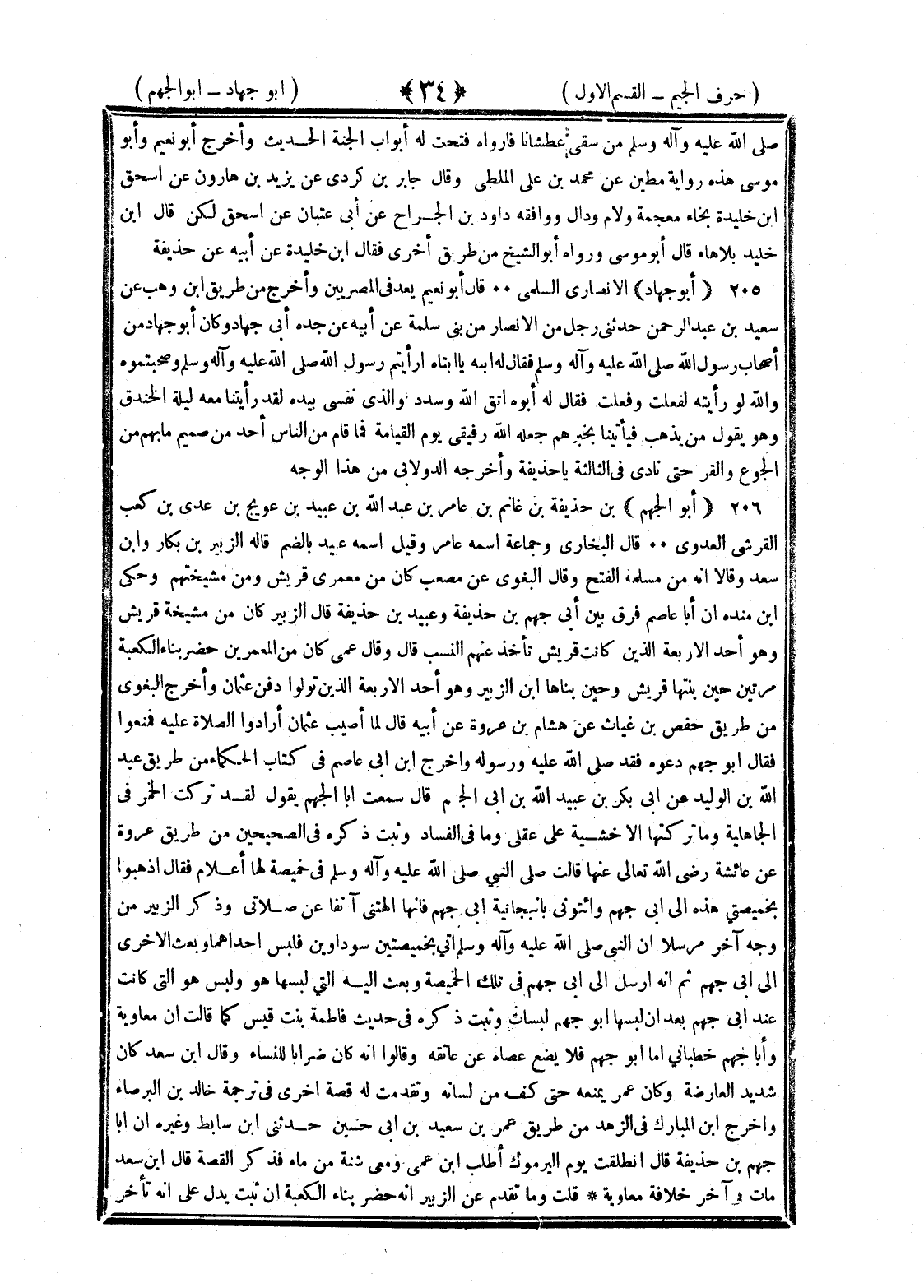 <34> صلى الله عليه وسلم من سقى عطشان فأرواه فتحت له أبواب الجنة الحديث وأخرجه أبو نعيم وأبو موسى هذه رواية مطين عن محمد بن علي الملطي وقال جابر بن كردي عن يزيد بن هارون عن إسحاق بن خليدة بخاء معجمة ولام ودال ووافقه داود بن الجراح عن أبي غسان عن إسحاق لكن قال بن خليد بلا هاء قال أبو موسى ورواه أبو الشيخ من طريق أخرى فقال بن خليدة عن أبيه عن حذيفة أبو جهاد الأنصاري السلمي قال أبو نعيم يعد في المصريين وأخرج من طريق بن وهب عن سعيد بن عبد الرحمن حدثني رجل من الأنصار من بني سلمة عن أبيه عن جده أبي جهاد وكان أبو جهاد من أصحاب رسول الله صلى الله عليه وسلم فقال له ابنه يا أبتاه رأيتم رسول الله صلى الله عليه وسلم وصحبتموه والله لو رأيته لفعلت وفعلت فقال له أبوه اتق الله وسدد فوالذي نفسي بيده لقد رأيتنا معه ليلة الخندق وهو يقول من يذهب فيأتينا بخبرهم جعله الله رفيقي يوم القيامة فما قام من الناس أحد من صميم ما بهم من الجوع والقر حتى نادى في الثالثة يا حذيفة وأخرجه الدولابي من هذا الوجه أبو الجهم بن حذيفة بن غانم بن عامر بن عبد الله بن عبيد بن عويج بن عدي بن كعب القرشي العدوي قال البخاري وجماعة اسمه عامر وقيل اسمه عبيد بالضم قاله الزبير بن بكار وابن سعد وقالا إنه من مسلمة الفتح وقال البغوي عن مصعب كان من معمري قريش ومن مشيختهم وحكى بن منده أن أبا عاصم فرق بين أبي جهم بن حذيفة وعبيد بن حذيفة قال الزبير كان من مشيخة قريش وهو أحد الأربعة الذين كانت قريش تأخذ عنهم النسب قال وقال عمي كان من المعمرين حضر بناء الكعبة مرتين حين بنتها قريش وحين بناها بن الزبير وهو أحد الأربعة الذين تولوا دفن عثمان وأخرج البغوي من طريق حفص بن غياث عن هشام بن عروة عن أبيه قال لما أصيب عثمان أرادوا الصلاة عليه فمنعوا فقال أبو الجهم دعوه فقد صلى الله عليه وسلم ورسوله وأخرج بن أبي عاصم في كتاب الحكماء من طريق عبد الله بن الوليد عن أبي بكر بن عبيد الله بن أبي الجهم قال سمعت أبا الجهم يقول لقد تركت الخمر في الجاهلية وما تركتها إلا خشية على عقلي وما فيها من الفساد وثبت ذكره في الصحيحين من طريق عروة عن عائشة رضي الله عنها قالت صلى النبي صلى الله عليه وسلم في خميصة لها أعلام فقال اذهبوا بخميصتي هذه إلى أبي جهم وائتوني بأنبجانية أبي جهم فإنما ألهتني آنفا علن صلاتي وذكر الزبير من وجه آخر مرسلا أن النبي صلى الله عليه وسلم أتى بخميصتين سوداوين فلبس إحداهما وبعث الأخرى إلى أبي جهم ثم إنه أرسل إلى أبي جهم في تلك الخميصة وبعث إليه التي لبسها هو ولبس هو التي كانت عند أبي جهم بعد أن لبسها أبو جهم لبسات وثبت ذكره في حديث فاطمة بنت قيس لما قالت إن معاوية وأبا جهم خطباني أما أبو جهم فلا يضع عصاه عن عاتقه وقالوا إنه كان ضرا بالنساء وقال بن سعد كان شديد العارضة وكان عمر يمنعه حتى كف من لسانه وتقدمت له قصة أخرى في ترجمة خالد بن البرصاء وأخرج بن المبارك في الزهد من طريق عمر بن سعيد بن أبي حسين حدثني بن سابط وغيره أن أبا جهم بن حذيفة قال انطلقت يوم اليرموك أطلب بن عمي ومعي شنة من ماء فذكر القصة قال بن سعد مات في آخر خلافة معاوية قلت وما تقدم عن الزبير أنه حضر بناء الكعبة إن ثبت يدل على أنه تأخر §