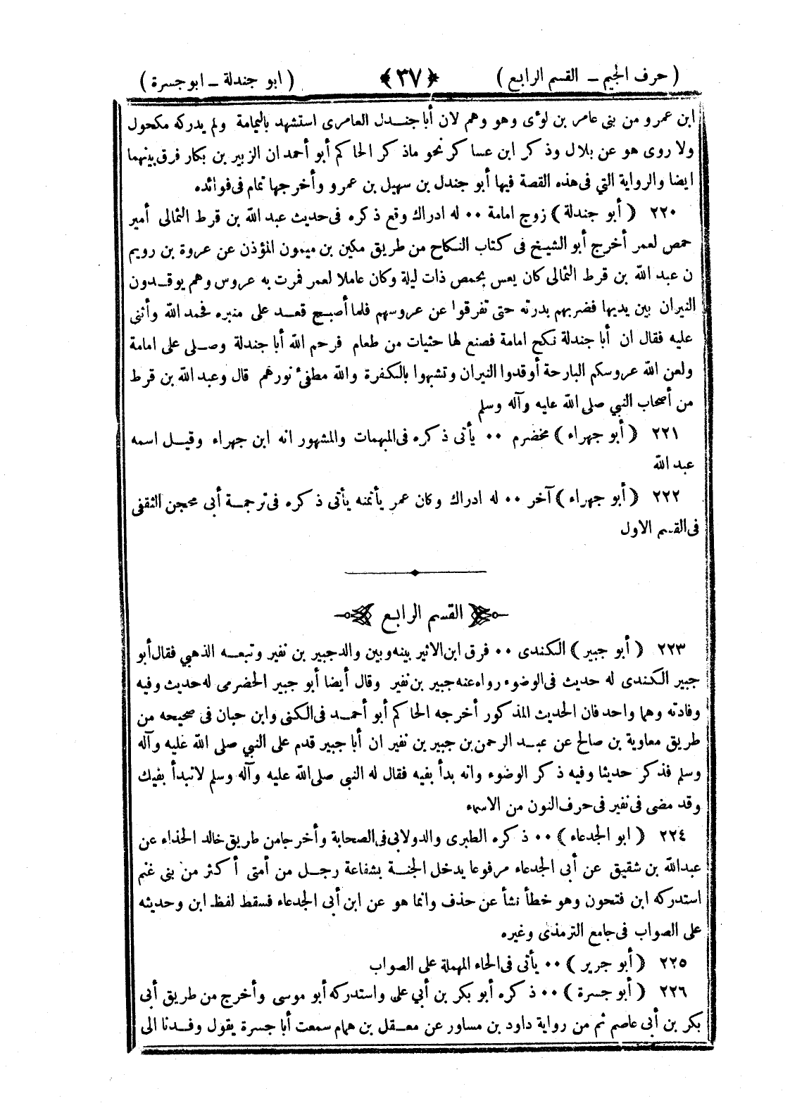<37> بن عمرو من بني عامر بن لؤي وهو وهم لأن أبا جندل العامري استشهد باليمامة ولم يدركه مكحول ولا روى هو عن بلال وذكر بن عساكر نحو ما ذكر الحاكم أبو أحمد أن الزبير بن بكار فرق بينهما أيضا والرواية التي في هذه القصة فيها أبو جندل بن سهيل بن عمرو وأخرجها تمام في فوائده أبو جندلة زوج أمامة له إدراك وقع ذكره في حديث عبد الله بن قرط الثمالي أمير حمص لعمر أخرج أبو الشيخ في كتاب النكاح من طريق مسكين بن ميمون المؤذن عن عروة بن رويم أن عبد الله بن قرط الثمالي كان يعس بحمص ذات ليلة وكان عاملا لعمر فمرت به عروس وهم يوقدون النيران بين يديها فضربهم بدرته حتى تفرقوا عن عروسهم فلما أصبح قعد على منبره فحمد الله وأثنى عليه فقال إن أبا جندلة نكح أمامة فصنع لها حثيات من طعام فرحم الله أبا جندلة وصلى على أمامة ولعن الله عروسكم البارحة أوقدوا النيران وتشبهوا بالكفرة والله مطفىء نورهم قال وعبد الله بن قرط من أصحاب النبي صلى الله عليه وسلم أبو جهراء مخضرم يأتي ذكره في المبهمات والمشهور أنه بن جهراء وقيل اسمه عبد الله أبو جهراء آخر له إدراك وكان عمر يأتمنه يأتي ذكره في ترجمة أبي محجن الثقفي في القسم الأول القسم الرابع أبو جبير الكندي فرق بن الأثير بينه وبين والد جبير بن نفير وتبعه الذهبي فقال أبو جبير الكندي له حديث في الوضوء رواه عنه جبير بن نفير وقال أيضا أبو جبير الحضرمي له حديث وفيه وفادته وهما واحد فإن الحديث المذكور أخرجه الحاكم أبو أحمد في الكنى وابن حبان في صحيحه من طريق معاوية بن صالح عن عبد الرحمن بن جبير بن نفير أن أبا جبير قدم على النبي صلى الله عليه وسلم فذكر حديثه وفيه ذكر الوضوء وأنه بدأ بفيه فقال له النبي صلى الله عليه وسلم لا تبدأ بفيك وقد مضى في نفير في حرف النون من الأسماء أبو الجدعاء ذكره الطبري والدولابي في الصحابة وأخرجا من طريق خالد الحذاء عن عبد الله بن شقيق عن أبي الجدعاء مرفوعا يدخل الجنة بشفاعة رجل من أمتي أكثر من بني تميم استدركه بن فتحون وهو خطأ نشأ عن حذف وإنما هو عن بن أبي الجدعاء فسقط لفظ بن وحديثه على الصواب في جامع الترمذي وغيره أبو جرير يأتي في الحاء المهملة على الصواب أبو جسرة ذكره أبو بكر بن أبي علي واستدركه أبو موسى وأخرج من طريق أبي بكر بن أبي عاصم ثم من رواية داود بن مساور عن معقل بن همام سمعت أبا جسرة يقول وفدنا إلى §
