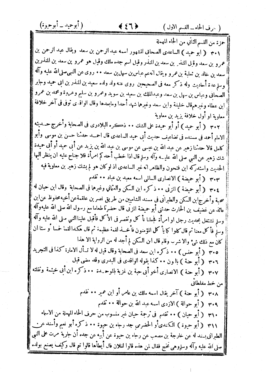 <46> حمزة من القسم الثاني من الحاء المهملة أبو حميد الساعدي الصحابي المشهور اسمه عبد الرحمن بن سعد ويقال عبد الرحمن بن عمرو بن سعد وقيل المنذر بن سعد بن المنذر وقيل اسم جده مالك وقيل هو عمرو بن سعد بن المنذر بن سعد بن خالد بن ثعلبة بن عمرو ويقال إنه عم سهل بن سعد روى عن النبي صلى الله عليه وسلم عدة أحاديث وله ذكر معه في الصحيحين روى عنه ولد ولده سعيد بن المنذر بن أبي حميد وجابر الصحابي وعباس بن سهل بن سعد وعبد الملك بن سعيد بن سويد وعمرو بن سليم وعروة ومحمد بن عمرو بن عطاء وغيرهم قال خليفة وابن سعد وغيرهما شهد أحدا وما بعده وقال الواقدي توفي في آخر خلافة معاوية أو أول خلافة يزيد بن معاوية أبو حميد أو أبو حميدة على الشك ذكره البلاذري في الصحابة وأخرج حديثه الإمام أحمد في مسنده في تضاعيف حديث أبي حميد الساعدي قال أحمد حدثنا حسن بن موسى وأبو كامل قالا حدثنا زهير عن عبد الله بن عيسى عن موسى بن عبد بن يزيد عن أبي حميد أو أبي حميدة شك زهير عن النبي صلى الله عليه وسلم قال إذا خطب أحدكم امرأة فلا جناح عليه أن ينظر إليها الحديث واستدركه بن فتحون والظاهر أنه غير الساعدي إذ لو كان هو لم يشك زهير بن معاوية فيه أبو حميضة الأنصاري السالمي اسمه معبد بن عباد تقدم أبو حميضة المزني ذكره بن السكن والعثماني وغيرهما في الصحابة وقال بن حبان له صحبة وأخرج بن السكن والطبراني في مسند الشاميين من طريق نصر بن علقمة عن أخيه محفوظ عن بن عائذ عن غضيف بن الحارث حدثني أبو حميضة المزني قال حضرنا طعاما مع رسول الله صلى الله عليه وسلم وهو يشتغل بحديث رجل أو أمرأة فجعلنا نأكل ونقصر في الأكل فأقبل علينا النبي صلى الله عليه وسلم فأكل معنا ثم قال كلوا كما يأكل المؤمنون فأخذ لقمة عظيمة ثم قال هكذا لقما خمسا أو ستا إن كان مع ذلك شيء وإلا شرب وقام قال بن السكن لم أجد له من الرواية إلا هذا أبو حنش ذكره بن سعد في الصحابة وقال قيل له لا تسأل الإمارة كذا في التجريد أبو حنة بالنون كذا يقوله الواقدي وقد مضى قبل أبو حنة الأنصاري أخو أبي حبة بن غزية بالموحدة ذكره بن أبي خيثمة ونقلته من خط مغلطاي أبو حنة آخر يقال اسمه مالك بن عامر أو بن عمير تقدم أبو حوالة الأزدي اسمه عبد الله بن حوالة تقدم أبو حيان تقدم في ترجمة حيان غير منسوب من حرف الحاء المهملة من الأسماء أبو حيوة الكندي أو الحضرمي جد رجاء بن حيوة ذكره أبو نعيم وأسند عن الطبراني بسند له عن خارجة بن مصعب عن رجاء بن حيوة عن أبيه عن جده أن جارية مرت على النبي صلى الله عليه وسلم وهي تحج فقال لمن هذه قالوا لفلان قال أيطؤها قالوا نعم قال وكيف يصنع بولده §