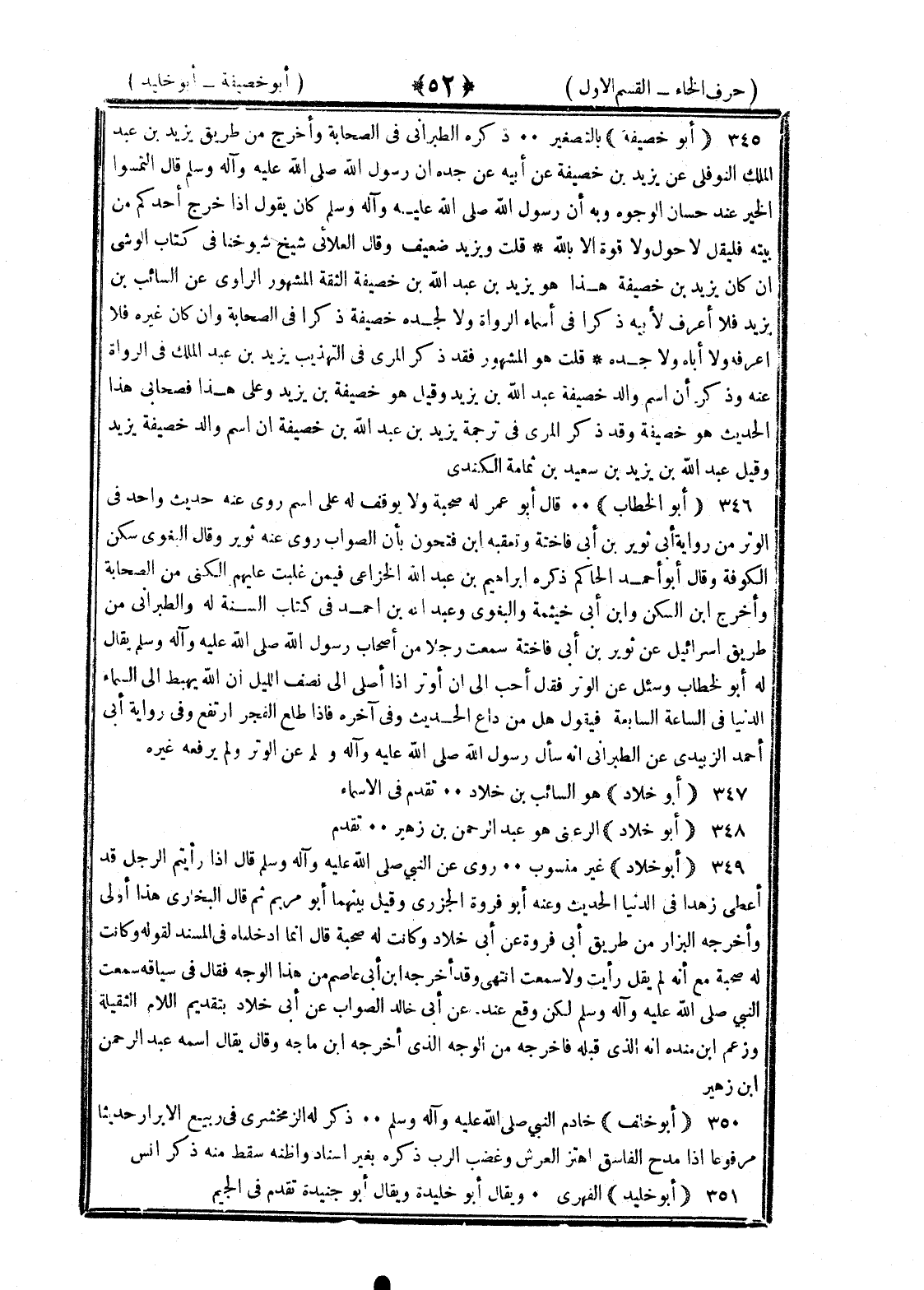 <52> أبو خصيفة بالتصغير ذكره الطبراني في الصحابة وأخرج من طريق يزيد بن عبد الملك النوفلي عن يزيد بن خصيفة عن أبيه عن جده أن رسول الله صلى الله عليه وسلم قال التمسوا الخير عند حسان الوجوه وبه أن رسول الله صلى الله عليه وسلم كان يقول إذا خرج أحدكم من بيته فليقل لا حول ولا قوة إلا بالله قلت ويزيد ضعيف وقال العلائي شيخ شيوخنا في كتاب الوشى إن كان يزيد بن خصيفة هذا هو يزيد بن عبد الله بن خصيفة الثقة المشهور الراوي عن السائب بن يزيد فلا أعرف لأبيه ذكرا في أسماء الرواة ولا لجده خصيفة ذكرا في الصحابة إن كان غيره فلا أعرفه ولا أباه ولا جده قلت هو المشهور فقد ذكر المزي في التهذيب يزيد بن عبد الملك في الرواة عنه وذكر أن اسم والد خصيفة عبد الله بن يزيد وقيل هو خصيفة بن يزيد وعلي هذا فصحابي هذا الحديث هو خصيفة وقد ذكر المزي في ترجمة يزيد بن عبد الله بن خصيفة أن اسم والد خصيفة يزيد وقيل عبد الله بن يزيد بن سعيد بن ثمامة الكندي أبو الخطاب قال أبو عمر له صحبة ولا يوقف له على اسم روى عنه حديث واحد في الوتر من رواية أبي ثوير بن أبي فاختة وتعقبه بن فتحون بأن الصواب روى عنه ثوير وقال البغوي سكن الكوفة وقال أبو أحمد الحاكم ذكره إبراهيم بن عبد الله الخزاعي فيمن غلبت عليهم الكنى من الصحابة وأخرج بن السكن وابن أبي خيثمة والبغوي وعبد الله بن أحمد في كتاب السنة له والطبراني من طريق إسرائيل عن ثوير بن أبي فاختة سمعت رجلا من أصحاب رسول الله صلى الله عليه وسلم يقال له أبو الخطاب وسئل عن الوتر فقال أحب الي أن أوتر إذ أصلي الى نصف الليل إن الله يهبط الى السماء الدنيا في الساعة السابعة فيقول هل من داع الحديث وفي آخره فإذا طلع الفجر ارتفع وفي رواية أبي أحمد الزبيري عن الطبراني أنه سأل رسول الله صلى الله عليه وسلم عن الوتر ولم يرفعه غيره أبو خلاد هو السائب بن خلاد تقدم في الأسماء أبو خلاد الرعيني هو عبد الرحمن بن زهير تقدم أبو خلاد غير منسوب روى عن النبي صلى الله عليه وسلم قال إذا رأيتم الرجل قد أعطي زهدا في الدنيا الحديث وعنه أبو فروة الجزري وقيل بينهما أبو مريم ثم قال البخاري هذا أولى وأخرجه البزار من طريق أبي فروة عن أبي خلاد وكانت له صحبة قال إنما أدخلناه في المسند لقوله وكانت له صحبة مع أنه لم يقل رأيت ولا سمعت انتهى وقد أخرجه بن أبي عاصم من هذا الوجه فقال في سياقه سمعت النبي صلى الله عليه وسلم لكن وقع عنده عن أبي خالد والصواب عن أبي خلاد بتقديم اللام الثقيلة وزعم بن مندة أنه الذي قبله فأخرجه بن ماجة وقال يقال اسمه عبد الرحمن بن زهير أبو خلف خادم النبي صلى الله عليه وسلم ذكر له الزمخشري في ربيع الأبرار حديثا مرفوعا إذا مدح المنافق اهتز العرش وغضب الرب ذكره بغير إسناد وأظنه سقط منه ذكر أنس أبو خليد الفهري ويقال أبو خليدة ويقال أبو جنيدة تقدم في الجيم §