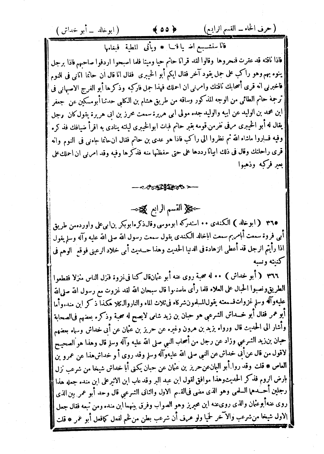 <55> فإنا سنشبع أضيافنا وتأتي المطي فنعتامها فإذا ناقته قد عقرت فنحروها وقالوا لقد قرانا حاتم حيا وميتا فلما أصبحوا أردفوا صاحبهم فإذا برجل ينوه بهم وهو راكب على جمل يقود آخر فقال أيكم أبو الخيبري فقال أنا قال إن حاتما أتاني في النوم فأخبرني أنه قرى أصحابك ناقتك وأمرني أن أحملك فهذا جمل فاركبه وذكرها أبو الفرج الأصبهاني في ترجمة حاتم الطائي من الوجه المذكور وساقه من طريق هشام بن الكلبي حدثنا أبو مسكين عن جعفر بن محمد بن الوليد عن أبيه والوليد جده مولى أبي هريرة سمعت محرز بن أبي هريرة يقول كان رجل يقال له أبو الخيبري مر في نفر من قومه بقبر حاتم فبات أبو الخيبري ليلته ينادي به أقرأ ضيافك فذكره وفيه فساروا ما شاء الله ثم نظروا الى راكب فإذا هو عدي بن حاتم فقال إن حاتما جاءني في النوم وأنه قرى راحلتك وقال في ذلك أبياتا رددها علي حتى حفظتها منه فذكرها وفيه وقد أمرني أن أحملك على بعير فركبه وذهبوا القسم الرابع أبو خالد الكندي استدركه أبو موسى وقال ذكره أبو بكر بن أبي علي وأورده من طريق أبي فروة سمعت أبا مريم سمعت أبا خالد الكندي سمعت رسول الله صلى الله عليه وسلم يقول إذا رأيتم الرجل قد أعطى الزهادة في الدنيا الحديث وهذا حديث أبي خلاد الرعيني فوقع الوهم في كنيته ونسبه أبو خداش له صحبة روى عنه أبو عثمان قال كنا في غزوة فنزل الناس منزلا فقطعوا الطريق ونصبوا الحبال على العلاء فلما رأى ما صنعوا قال سبحان الله لقد غزوت مع رسول الله صلى الله عليه وسلم غزوات فسمعته يقول المسلمون شركاء في ثلاث الماء والنار والكلأ هكذا ذكر بن منده وأما أبو عمر فقال أبو خداش الشرعبي هو حبان بن زيد شامي لا يصح له صحبة وذكره بعضهم في الصحابة وأشار الى الحديث وساق قال ورواه يزيد بن هارون وغيره عن حريز بن عثمان عن أبي خداش وسماه بعضهم حبان بن زيد الشرعبي وزاد عن رجل من أصحاب النبي صلى الله عليه وسلم قال وهذا هو الصحيح لا قول من قال عن أبي خداش عن النبي صلى الله عليه وسلم وقد روى أبو خداش هذا عن عمرو بن العاص قلت وقد رواه أبو اليمان عن حريز بن عثمان عن حبان يكنى أبا خداش أن شيخا من شرعب نزل بأرض الروم فذكر الحديث وهذا موافق لقول بن عبد البر وقد عاب بن الأثير على بن مندة جعله هذا رجلين أحدهما السلمي وهو الذي مضى في القسم الأول والثاني الشرعبي قال وحد أبو عمر بين الذي روى عنه أبو عثمان والذي روى عنه بن محيريز وهو الصواب وفرق بينهما بن منده ومن تبعه فقال جعل الأول شيخا من شرعب والآخر لخميا ولو عرف أن شرعب بطن من لخم لفعل كما فعل أبو عمر قلت §