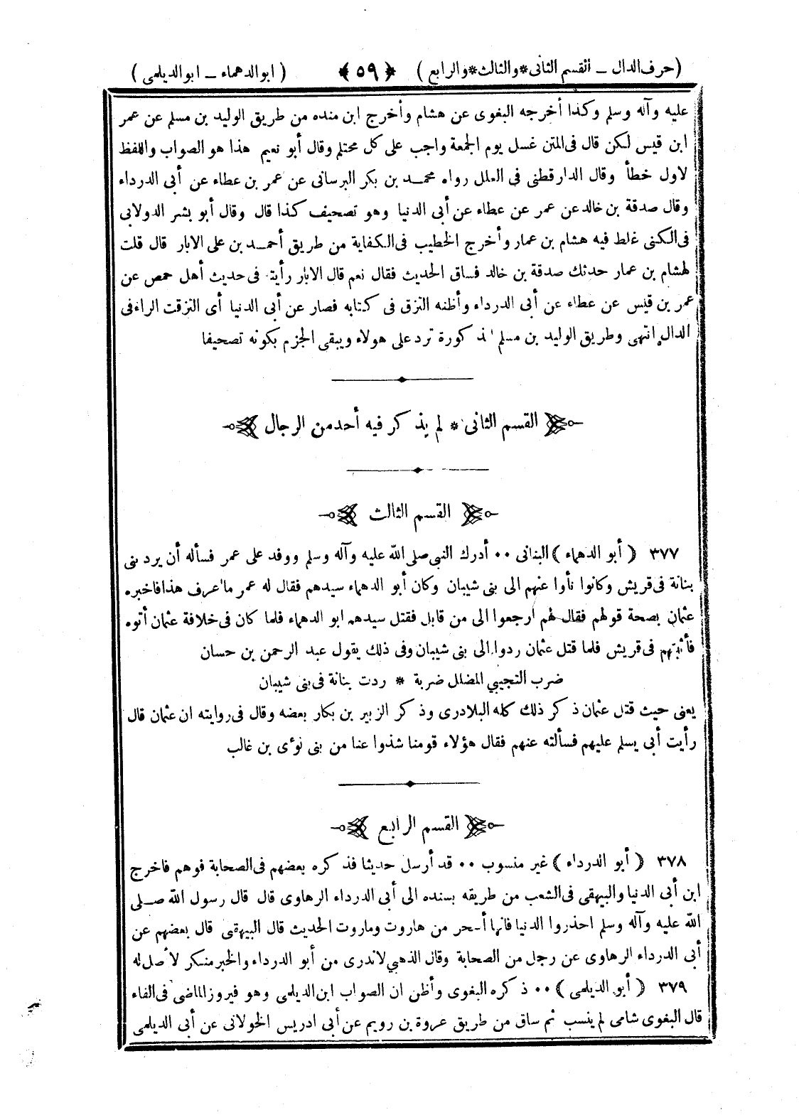 <59> عليه وسلم وكذا أخرجه البغوي عن هشام وأخرج بن مندة من طريق الوليد بن مسلم عن عمر بن قيس لكن قال في المتن غسل الجمعة واجب على كل محتلم وقال أبو نعيم هذا هو الصواب واللفظ الأول خطأ وقال الدارقطني في العلل رواه محمد بن بكر البرساني عن عمر بن عطاء عن أبي الدرداء وقال صدقة بن خالد عن عمر عن عطاء عن أبي الدنيا وهو تصحيف كذا قال وقال أبو بشر الدولابي في الكنى غلط فيه هشام بن عمار وأخرج الخطيب في الكفاية من طريق أحمد بن علي الأبار قال قلت لهشام بن عمار حدثك صدقة بن خالد فساق الحديث فقال نعم قال الأبار رأيته في حديث أهل حمص عن عمر بن قيس عن عطاء عن أبي الدرداء وأظنه التزق في كتابه فصار عن أبي الدنيا أي التزقت الراء في الدال انتهى وطريق الوليد بن مسلم المذكورة ترد على هؤلاء ويبقى الجزم بكونه تصحيفا القسم الثاني لم يذكر فيه أحد من الرجال القسم الثالث أبو الدهماء البناني أدرك النبي صلى الله عليه وسلم ووفد على عمر فسأله أن يرد بني بنانة في قريش وكانوا نأوا عنهم الى بني شيبان وكان أبو الدهماء سيدهم فقال له عمر ما أعرف هذا فأخبره عثمان بصحة قولهم فقال لهم ارجعوا الي من قابل فقتل سيدهم بن الدهماء فلما كان في خلافة عثمان أتوه فأثبتهم في قريش فلما قتل عثمان ردوا الى بني شيبان وفي ذلك يقول عبد الرحمن بن حسان ضرب التجيبي المضلل ضربة ردت بنانة في بني شيبان يعني حيث قتل عثمان ذكر ذلك كله البلاذري وذكر الزبير بن بكار بعضه وقال في روايته إن عثمان قال رأيت أبي يسلم عليهم فسألته عنهم فقال هؤلاء قومنا شدوا عنا من بني لؤي بن غالب القسم الرابع أبو الدرداء غير منسوب قد أرسل حديثا فذكره بعضهم في الصحابة فوهم فأخرج بن أبي الدنيا والبيهقي في الشعب من طريقه بسنده الى أبي الدرداء الرهاوي قال قال رسول الله صلى الله عليه وسلم احذروا الدنيا فإنها أسحر من هارون وماروت الحديث قال البيهقي قال بعضهم عن أبي الدرداء الرهاوي عن رجل من الصحابة وقال الذهبي لا ندري من أبو الدرداء والخبر منكر لا أصل له أبو الديلمي ذكره البغوي وأظن أن الصواب بن الديلمي وهو فيروز الماضي في الفاء قال البغوي شامي لم ينسب ثم ساق من طريق عروة بن رويم عن أبي إدريس الخولاني عن أبي الديلمي §