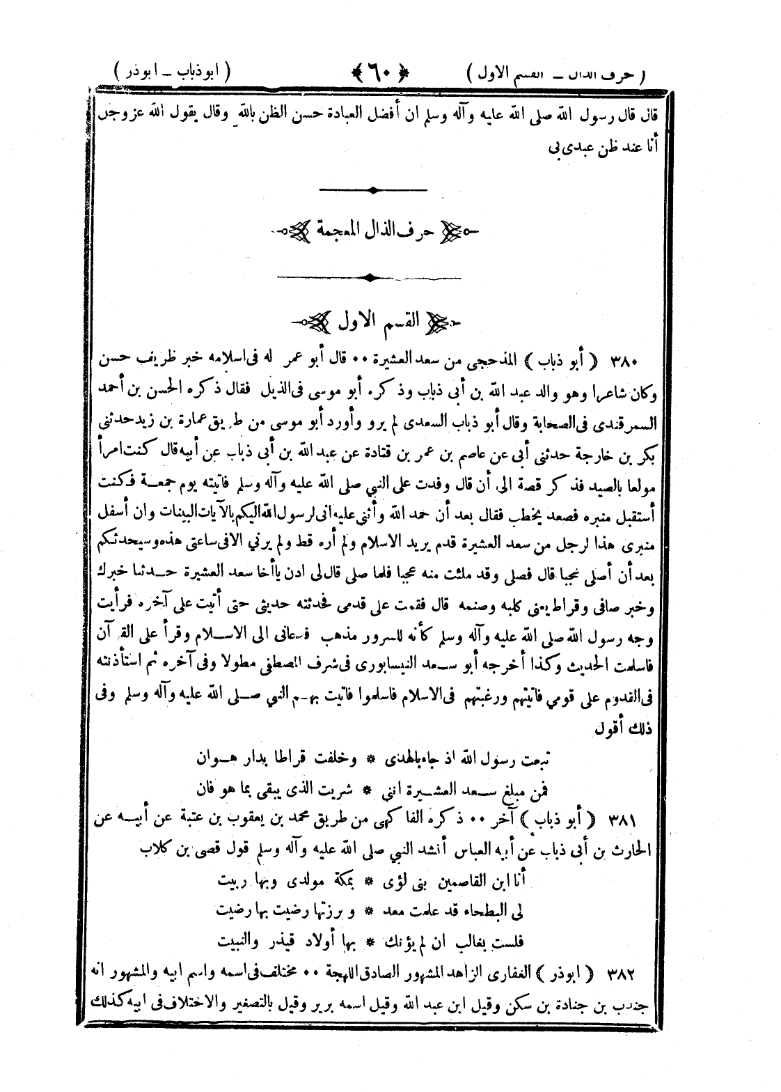 أبو ذباب المذحجي من سعد العشيرة قال أبو عمر له في إسلامه خبر ظريف حسن وكان شاعرا وهو والد عبد الله بن أبي ذباب وذكره أبو موسى في الذيل فقال ذكره الحسن بن أحمد السمرقندي في الصحابة وقال أبو ذباب السعدي لم يزد وأورد أبو موسى من طريق عمارة بن زيد حدثني بكر بن خارجة حدثني أبي عن عاصم بن عمر بن قتادة عن عبد الله بن أبي ذباب عن أبيه قال كنت امرأ مولعا بالصيد فذكر قصة الى أن قال وفدت على النبي صلى الله عليه وسلم فأتيته يوم جمعة فكنت أستقبل منبره فصعد يخطب فقال بعد أن حمد الله وأثنى عليه إني لرسول الله إليكم بالآيات البينات وإن أسفل منبري هذا لرجل من سعد العشيرة قدم يريد الإسلام ولم أره قط ولم يرني إلا في ساعتي هذه وسيحدثكم بعد أن أصلي عجبا قال فصلى وقد مليت منه عجبا فلما صلى قال لي ادن يا أخا سعد العشيرة حدثنا خبرك وخبر صافي وقراط يعني كلبه وصنمه قال فقمت على قدمي فحدثته حديثي حتى أتيت على آخره فرأيت وجه رسول الله صلى الله عليه وسلم كأنه للسرور مذهب فدعاني الى الإسلام وقرأ علي القرآن فأسلمت الحديث وكذا أخرجه أبو سعد النيسابوري في شرف المصطفى مطولا وفي آخره ثم استأذنته في القدوم على قومي فأتيتهم ورغبتهم في الإسلام فأسلموا فأتيت بهم النبي صلى الله عليه وسلم وفي ذلك أقول تبعت رسول الله إذ جاء بالهدى وخلفت قراطا بدار هوان فمن مبلغ سعد العشيرة أنني شريت الذي يبقى بما هو فان أبو ذباب آخر ذكره الفاكهي من طريق محمد بن يعقوب بن عتبة عن أبيه عن الحارث بن أبي ذباب عن أبيه العباس أنشد النبي صلى الله عليه وسلم قول قصي بن كلاب أنا بن العاصمين بني لؤي بمكة مولدي وبها ربيت لي البطحاء قد علمت معد وبرزتها رضيت بها رضيت فلست بغالب إن لم تأمل بها أولاد قيذر والنبيت أبو ذر الغفاري الزاهد المشهور الصادق اللهجة مختلف في اسمه واسم أبيه والمشهور أنه جندب بن جنادة بن سكن وقيل بن عبد الله وقيل اسمه بربر وقيل بالتصغير والاختلاف في أبيه كذلك §