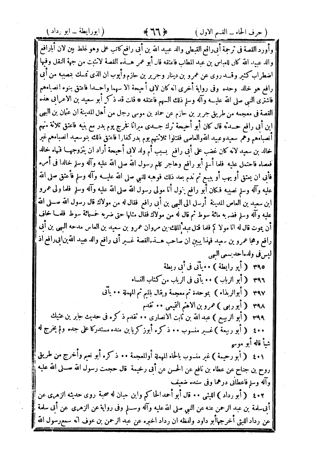 <66> وأورد القصة في ترجمة أبي رافع القبطي والد عبد الله بن أبي رافع كاتب علي وهو غلط بين لأن أبا رافع والد عبيد الله كان للعباس بن عبد المطلب فأعتقه قال أبو عمر هذه قصة لا تثبت من جهة النقل وفيها اضطراب كثير وقد روى عن عمرو بن دينار وجرير بن أبي حازم وأيوب أن الذي تمسك بنصيبه من أبي رافع هو خالد وحده وفي رواية أخرى انه كان لأبي أحيحة إلا سهما واحدا فأعتق بنوه أنصباءهم فاشترى النبي صلى الله عليه وسلم ذلك السهم فأعتقه قلت قد ذكر أبو سعيد بن الأعرابي هذه القصة في معجمه من طريق جرير بن حازم عن حماد بن موسى رجل من أهل المدينة أن عثمان بن البهي بن أبي رافع حدثه قال كان أبو أحيحة جدي ترك ميراثا فخرج يوم بدر مع بنيه فأعتق ثلاثة منهم أنصباءهم وهم سعيد وعبيد الله والعاصي فقتلوا ثلاثتهم يوم بدر كفارا فأعتق ذلك بنو سعيد أنصباءهم غير خالد بن سعيد لأنه كان غضب على أبي رافع بسبب أم ولد لأبي أحيحة أراد أن يتزوجها فنهاه خالد فعصاه فاحتمل عليه فلما أسلم أبو رافع وهاجر كلم رسول الله صلى الله عليه وسلم خالدا في أمره فأبى أن يعتق أو يهب أو يبيع ثم ندم بعد ذلك فوهبه للنبي صلى الله عليه وسلم فأعتق صلى الله عليه وسلم نصيبه فكان أبو رافع يقول أنا مولى رسول الله صلى الله عليه وسلم فلما ولي عمرو بن سعيد بن العاص المدينة أرسل إلى البهي بن أبي رافع فقال له من مولاك قال رسول الله صلى الله عليه وسلم فضربه مائة سوط ثم قال له من مولاك فقال مثلها حتى ضربه خمسمائة سوط فلما خاف أن يموت قال أنا مولاكم فلما قتل عبد الملك بن مروان عمرو بن سعيد بن العاص مدحه البهي بن أبي رافع وهجا عمرو بن سعيد فهذا يبين أن صاحب هذه القصة غير أبي رافع والد عبد الله بن أبي رافع إذ ليس في ولده أحد يسمى البهي أبو رائطة يأتي في أبي ريطة أبو الرباب يأتي في الرباب من كتاب النساء أبو الربذاء بموحدة ثم معجمة ويقال بالميم ثم بالمهملة يأتي أبو ربعي عمرو بن الأهتم التميمي تقدم أبو الربيع عبد الله بن ثابت الأنصاري تقدم ذكره في حديث جابر بن عتيك أبو ربيعة غير منسوب ذكره أبو زكريا بن مندة مستدركا على جده ولم يخرج له شيئا قاله أبو موسى أبو رحيمة غير منسوب بالحاء المهملة أو المعجمة ذكره أبو نعيم وأخرج من طريق روح بن جناح عن عطاء بن نافع عن الحسن عن أبي رحيمة قال حجمت رسول الله صلى الله عليه وسلم فأعطاني درهما وفي سنده ضعيف أبو رداد الليثي قال أبو أحمد الحاكم وابن حبان له صحبة روى حديثه الزهري عن أبي سلمة بن عبد الرحمن عنه عن النبي صلى الله عليه وسلم وفي رواية عن الزهري عن أبي سلمة عن رداد الليثي أخرجها أبو رداد ولفظه إن ردادا أخبره عن عبد الرحمن بن عوف أنه سمع رسول الله §