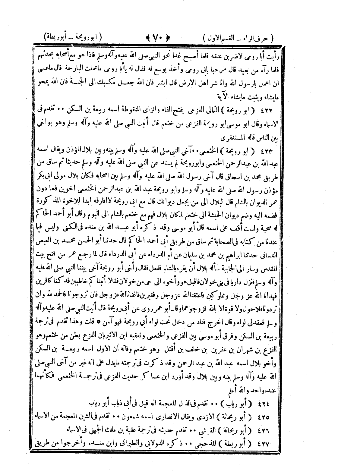 <70> رأيت أبا رومي لأضربن عنقه فلما أصبح غدا نحو النبي صلى الله عليه وسلم فإذا هو مع أصحابه يحدثهم فلما رآه من بعيد قال مرحبا بأبي رومي وأخذ يوسع فقال له يا أبا رومي ما عملت البارحة قال ما عسى أن أعمل يا رسول الله أنا شر أهل الأرض قال أبشر فإن الله جعل مكسبك إلى الجنة فإن الله يمحو ما يشاء ويثبت ما يشاء أبو رويحة الثمالي الفزعي بفتح الفاء والزاي المنقوطة اسمه ربيعة بن السكن تقدم في الأسماء وقال أبو موسى أبو رويحة الفزعي من خثعم قال أتيت النبي صلى الله عليه وسلم وهو يواخي بين الناس قاله المستغفري أبو رويحة الخثعمي آخى النبي صلى الله عليه وسلم بينه وبين بلال المؤذن ويقال اسمه عبد الله بن عبد الرحمن الخثعمي وأبو رويحة لم يسند عن النبي صلى الله عليه وسلم حديثا ثم ساق من طريق محمد بن إسحاق قال آخى رسول الله صلى الله عليه وسلم بين أصحابه فكان بلال مولى أبي بكر مؤذن رسول الله صلى الله عليه وسلم وأبو رويحة عبد الله بن عبد الرحمن الخثعمي أخوين فلما دون عمر الديوان بالشام قال لبلال إلى من تجعل ديوانك قال مع أبي رويحة لا أفارقه أبدا للأخوة المذكورة فضمه إليه وضم ديوان الحبشة إلى خثعم لمكان بلال فهم مع خثعم بالشام إلى اليوم وقال أبو أحمد الحاكم له صحبة ولست أقف على اسمه قال أبو موسى وقد ذكره أبو عبد الله بن مندة في الكنى وليس فيما عندنا من كتابه في الصحابة ثم ساق من طريق أبي أحمد الحاكم قال حدثنا أبو الحسن محمد بن العيص الغساني حدثنا إبراهيم بن محمد بن سليمان عن أم الدرداء عن أبي الدرداء قال لما رجع عمر من فتح بيت المقدس وسار إلى الجابية سأله بلال أن يقره بالشام ففعل فقال وأخي أبو رويحة آخى بيننا النبي صلى الله عليه وسلم فنزل داريا في بني خولان فأقبل هو وأخوه إلى حي من خولان فقال أتيناكم خاطبين قد كنا كافرين فهدانا الله عز وجل ومملوكين فأعتقنا الله عز وجل وفقيرين فأغنانا الله عز وجل فإن تزوجونا فالحمد لله وإن تردونا فلا حول ولا قوة إلا بالله فزوجوهما وقال أبو عمر روى عن أبي رويحة قال أتيت النبي صلى الله عليه وسلم فعقد لي لواء وقال اخرج فناد من دخل تحت لواء أبي رويحة فهو آمن قلت وهذا تقدم في ترجمة ربيعة بن السكن وفرق أبو موسى بين الفزعي والخثعمي وتعقبه بن الأثير بأن الفزع بطن من خثعم وهو الفزع بن شهران بن عفرس بن حلف بن أفتل وهو خثعم وفاته أن الأول اسمه ربيعة بن السكن وأخو بلال اسمه عبد الله بن عبد الرحمن وقد ذكرت في ترجمته ما يدل على أنه غير من آخى النبي صلى الله عليه وسلم بينه وبين بلال وقد أورد بن عساكر حديث الفزعي في ترجمة الخثعمي فكأنهما عنده واحد والله أعلم أبو رثاب تقدم في الذال المعجمة أنه قيل في أبي ذئاب أبو رئاب أبو ريحانة الأزدي ويقال الأنصاري اسمه شمعون تقدم في الشين المعجمة من الأسماء أبو ريحانة القرشي تقدم حديثه في ترجمة عقبة بن مالك الجهني في الأسماء أبو ريطة المذحجي ذكره الدولابي والطبراني وابن مندة وأخرجوا من طريق §