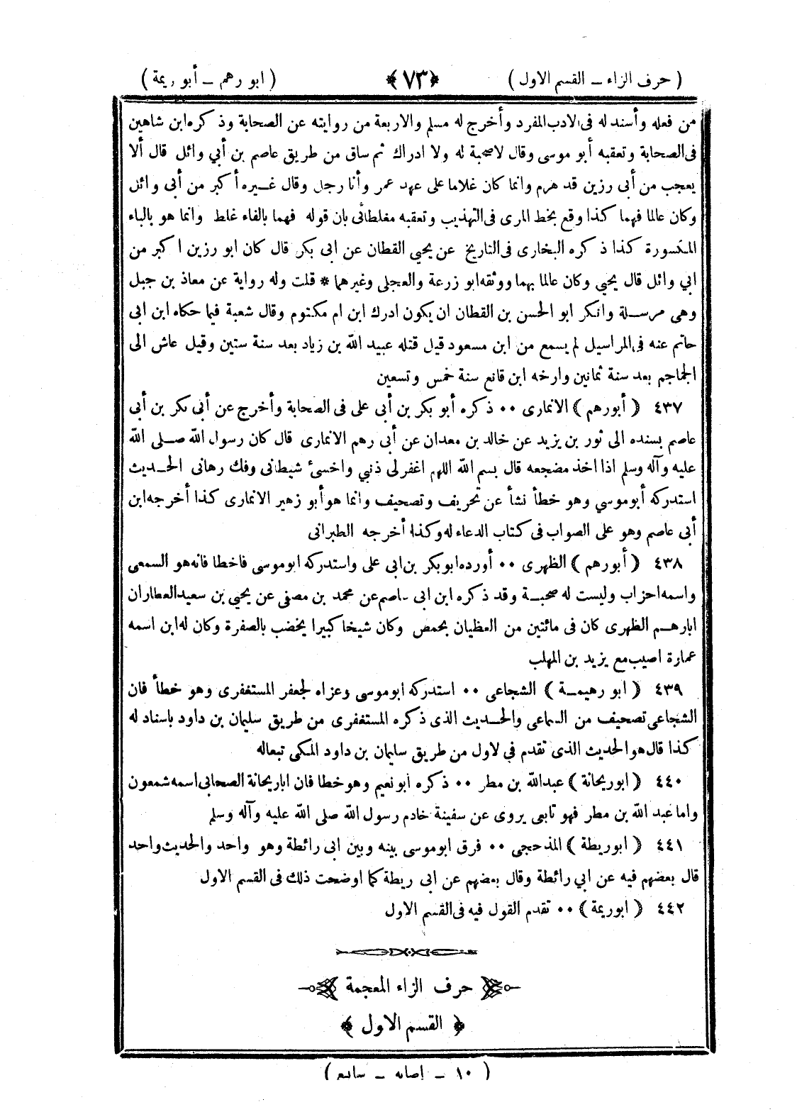 <73> من فعله وأسند له في الأدب المفرد وأخرج له مسلم والأربعة من روايته عن الصحابة وذكره بن شاهين في الصحابة وتعقبه أبو موسى وقال لا صحبة له ولا إدراك ثم ساق من طريق عاصم بن أبي وائل قال ألا يعجب من أبي رزين قد هرم وإنما كان غلاما على عهد عمر وأنا رجل وقال غيره كان أكبر من أبي وائل وكان عالما فهما كذا وقع بخط المزي في التهذيب وتعقبه مغلطاي بأن قوله فهما بالفاء غلط وإنما هو بالباء المكسورة كذا ذكره البخاري في التاريخ عن يحيى القطان عن أبي بكر قال كان أبو رزين أكبر من أبي قال يحيى وكان عالما بهما ووثقه أبو زرعة والعجلي وغيرهما قلت وله رواية عن معاذ بن جبل وهي مرسلة وأنكر أبو الحسن بن القطان أن يكون أدرك بن أم مكتوم وقال شعبة فيما حكاه بن أبي حاتم عنه في المراسيل لم يسمع من بن مسعود قيل قتله عبيد الله بن زياد بعد سنة ستين وقيل عاش إلى الجماجم بعد سنة ثمانين وأرخه بن قانع سنة خمس وتسعين أبو رهم الأنماري ذكره أبو بكر بن أبي علي في الصحابة وأخرج عن أبي بكر بن أبي عاصم بسنده إلى ثور بن زيد عن خالد بن معدان عن أبي رهم الأنماري قال كان رسول الله صلى الله عليه وسلم إذا أخذ مضجعه قال بسم الله اللهم اغفر لي ذنبي وأخسىء شيطاني وفك رهاني الحديث استدركه أبو موسى وهو خطأ نشأ عن تحريف وتصحيف وإنما هو أبو زهير الأنماري كذا أخرجه بن أبي عاصم وهو على الصواب في كتاب الدعاء له وكذا أخرجه الطبراني أبو رهم الظهري أورده أبو بكر بن أبي علي واستدركه أبو موسى فأخطأ فإنه هو السمعي واسمه أحزاب وليست له صحبة وقد ذكره بن أبي عاصم عن محمد بن مصفى عن يحيى بن سعيد العطار أن أبا رهم الظهري كان في مائتين من العطاء بحمص وكان شيخا كبيرا يخضب بالصفرة وكان له بن اسمه عمارة أصيب مع يزيد بن المهلب أبو رهيمة الشجاعي استدركه أبو موسى وعزاه لجعفر المستغفري وهو خطأ فإن الشجاعي تصحيف من السماعي والحديث الذي ذكره المستغفري من طريق سليمان بن داود بإسناد له كذا قال هو الحديث الذي تقدم في الأول من طريق سليمان بن داود المكي تبعا له أبو ريحانة عبد الله بن مطر ذكره أبو نعيم وهو خطأ فإن أبا ريحانة الصحابي اسمه شمعون وأما عبد الله بن مطر فهو تابعي يروي عن سفينة خادم رسول الله صلى الله عليه وسلم أبو ريطة المذحجي فرق أبو موسى بينه وبين أبي رائطة وهو واحد والحديث الواحد قال بعضهم فيه عن أبي رائطة وقال بعضهم عن أبي ريطة كما أوضحت ذلك في القسم الأول أبو ريمة تقدم القول فيه في القسم الأول