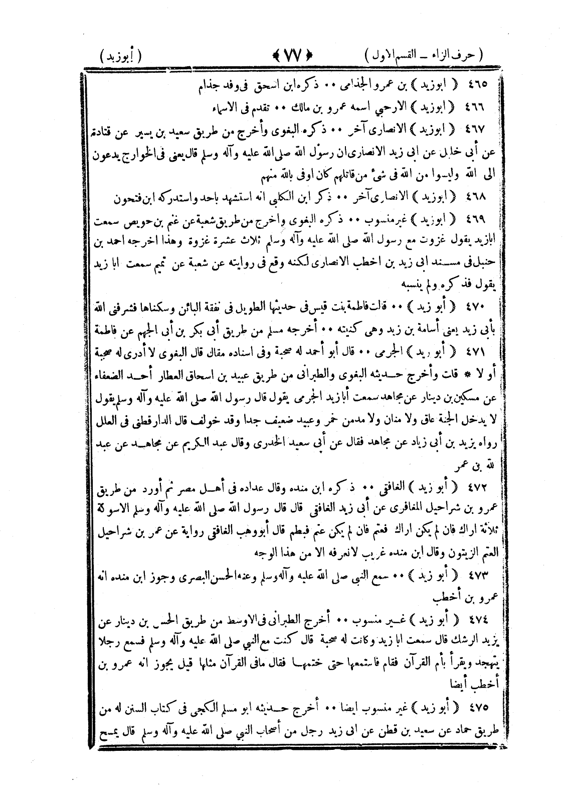 <77> أبو زيد بن عمرو الجذامي ذكره بن إسحاق في وفد جذام أبو زيد الأرحبي اسمه عمرو بن مالك تقدم في الأسماء أبو زيد الأنصاري آخر ذكره البغوي وأخرج من طريق سعيد بن بشير عن قتادة عن أبي الخليل عن أبي زيد الأنصاري أن رسول الله صلى الله عليه وسلم قال يعني في الخوارج يدعون الى الله وليسوا من الله في شيء من قاتلهم كان أوفى بالله منهم أبو زيد الأنصاري آخر ذكر بن الكلبي أنه استشهد بأحد واستدركه بن فتحون أبو زيد غير منسوب ذكره البغوي وأخرج من طريق شعبة عن غنم بن حويص سمعت أبا زيد يقول غزوت مع رسول الله صلى الله عليه وسلم ثلاث عشرة غزوة وأخرجه أحمد بن حنبل في مسند أبي زيد بن أخطب الأنصاري لكنه وقع في روايته عن شعبة عن تميم سمعت أبا زيد يقول فذكره ولم ينسبه أبو زيد قالت فاطمة بنت قيس في حديثها الطويل في نفقة البائن وسكناها فشرفني الله بأبي زيد يعني أسامة بن زيد وهي كنيته أخرجه مسلم من طريق أبي بكر بن أبي الجهم عن فاطمة أبو زيد الجرمي قال أبو أحمد له صحبة وفي إسناده مقال قال البغوي لا أدري له صحبة أم لا قلت وأخرج حديثه البغوي والطبراني من طريق عبيد بن إسحاق العطار أحد الضعفاء عن مسكين بن دينار عن مجاهد سمعت أبا زيد الجرمي يقول قال رسول الله صلى الله عليه وسلم لا يدخل الجنة عاق ولا منان ولا مدمن خمر وعبيد ضعيف جدا وقد خولف قال الدارقطني في العلل رواه يزيد بن أبي زياد عن مجاهد فقال عن أبي سعيد الخدري وقال عبد الكريم عن مجاهد عن عبد الله بن عمرو أبو زيد الغافقي ذكره بن منده وقال عداده في أهل مصر ثم أورد من طريق عمرو بن شراحيل المعافري عن أبي زيد الغافقي قال قال رسول الله صلى الله عليه وسلم الأسوكة ثلاثة أراك فإن لم يكن أراك فعنم فإن لم يكن عنم فبطم قال أبو وهب الغافقي راوية عن عمرو بن شراحيل العنم الزيتون وقال بن منده غريب لا نعرفه إلا من هذا الوجه أبو زيد سمع النبي صلى الله عليه وسلم وعنه الحسن البصري وجوز بن منده أن عمرو بن أخطب أبو زيد غير منسوب أخرج الطبراني في الأوسط من طريق الحسن بن دينار عن يزيد الرشك قال سمعت أبا زيد وكانت له صحبة قال كنت مع النبي صلى الله عليه وسلم فسمع رجلا يتهجد ويقرأ بأم القرآن فقام فاستمعها حتى ختمها فقال ما في القرآن مثلها قيل يجوز أنه عمرو بن أخطب أيضا أبو زيد غير منسوب أيضا أخرج حديثه أبو مسلم الكجي في كتاب السنن له من طريق حماد عن سعيد بن قطن عن أبي زيد رجل من أصحاب النبي صلى الله عليه وسلم قال يمسح §