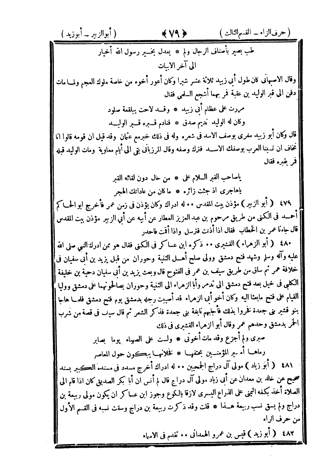 <79> طب بصير بأصناف الرجال ولم يعدل بخير رسول الله أخيار الى آخر الأبيات وقال الأصبهاني كان طول أبي زبيد ثلاثة عشرة شبرا وكان أعور أخوه من خاصة ملوك العجم ولما مات دفن الى قبر الوليد بن عقبة فمر بهما أشجع السلمي فقال مررت على عظام أبي زبيد وقد لاحت ببلقعة صلود وكان له الوليد نديم صدق فنادم قبره قبر الوليد قال وكان أبو زبيد مغري بوصف الأسد في شعره وله في ذلك خبر مع عثمان وقد قيل إن قومه قالوا إنا نخاف أن تسبنا العرب بوصفك الأسد فترك وصفه وقال المرزباني بقي الى أيام معاوية ومات الوليد قبله فمر بقبره فقال يا صاحب القبر السلام على من حال دون لقائه القبر يا هاجري إذ جئت زائره ما كان من عاداتك الهجر أبو الزبير مؤذن ببيت المقدس له إدراك وكان يؤذن في زمن عمر فأخرج أبو أحمد الحاكم في الكنى من طريق مرحوم بن عبد العزيز العطار عن أبيه عن أبي الزبير مؤذن بيت المقدس قال جاءنا عمر بن الخطاب فقال إذا أذنت فترسل وإذا أقمت فاحدم أبو الزهراء القشيري ذكره بن عساكر في الكنى فقال هو ممن أدرك النبي صلى الله عليه وسلم وشهد فتح دمشق وولي صلح أهل الثنية وحوران من قبل يزيد بن أبي سفيان في خلافة عمر ثم ساق من طريق سيف بن عمر في الفتوح قال وبعث يزيد بن أبي سفيان دحية بن خليفة الكلبي في خيل بعد فتح دمشق الى تدمر وأبا الزهراء الى الثنية وحوران يصالحونها على دمشق ووليا القيام على فتح ما بعثا اليه وكان أخو أبي الزهراء قد أصيبت رجله بدمشق يوم فتح دمشق فلما هاجى بنو قشير بني جعدة فخروا بذلك فأجابهم نابغة بني جعدة فذكر الشعر ثم قال سيف في قصة من شرب الخمر بدمشق وحدهم عمر وقال أبو الزهراء القشيري في ذلك صبري ولم أجزع وقد مات إخوتي ولست على الصهباء يوما بصابر رماها أمير المؤمنين بحتفها فخلانها يبكون حول المعاصر أبو زياد مولى آل دراج الجمحيين له إدراك أخرج مسدد في مسنده الكبير بسند صحيح عن خالد بن معدان عن أبي زياد مولى آل دراج قال لم أنس أن أبا بكر الصديق كان إذا قام إلى الصلاة أخذ بكفه اليمنى على الذراع اليسرى لازقا بالكوع وجوز بن عساكر أن يكون مولى ربيعة بن دراج ولم يسق نسب ربيعة هذا قلت وقد ذكرت ربيعة بن دراج وسقت نسبه في القسم الأول من حرف الراء أبو زيد قيس بن عمرو الهمداني تقدم في الأسماء §