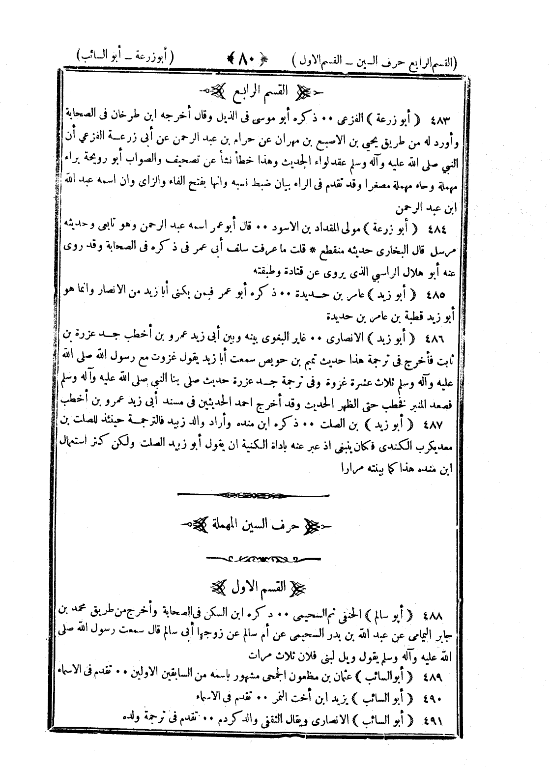 <80> القسم الرابع أبو زرعة الفزعي ذكره أبو موسى في الذيل وقال أخرجه بن طرخان في الصحابة وأورد له من طريق يحيى بن الأصبع بن مهران عن حرام بن عبد الرحمن عن أبي زرعة الفزعي أن النبي صلى الله عليه وسلم عقد لواء الحديث وهذا خطأ نشأ عن تصحيف والصواب أبو رويحة براء مهملة مصغرا وقد تقدم في الراء بيان ضبط نسبه وأنها بفتح الفاء والزاي وأن اسمه عبد الله بن عبد الرحمن أبو زرعة مولى المقداد بن الأسود قال أبو عمر اسمه عبد الرحمن وهو تابعي وحديثه مرسل قال البخاري حديثه منقطع قلت ما عرفت سلف أبي عمر في ذكره في الصحابة وقد روى عنه أبو هلال الراسبي الذي يروي عن قتادة وطبقته أبو زيد عامر بن حديدة ذكره أبو عمر فيمن يكنى أبا زيد من الأنصار وإنما هو أبو زيد قطبة بن عامر بن حديدة أبو زيد الأنصاري غاير البغوي بينه وبين أبي زيد عمرو بن أخطب جد عروة بن ثابت فأخرج في ترجمة هذا حديث تميم بن حويص سمعت أبا زيد يقول غزوت مع رسول الله صلى الله عليه وسلم ثلاث عشرة غزوة وفي ترجمة جد عزرة حديث صلى بنا النبي صلى الله عليه وسلم فصعد المنبر فخطب حتى الظهر الحديث وقد أخرج أحمد الحديثين في مسند أبي زيد عمرو بن أخطب أبو زبيد بن الصلت ذكره بن منده وأراد والد زبيد فالترجمة حينئذ للصلت بن معد يكرب الكندي فكان ينبغي إذ عبر عنه بأداة الكنية أن يقول أبو زبيد الصلت ولكن كثر استعمال بن منده هذا كما بينته مرارا