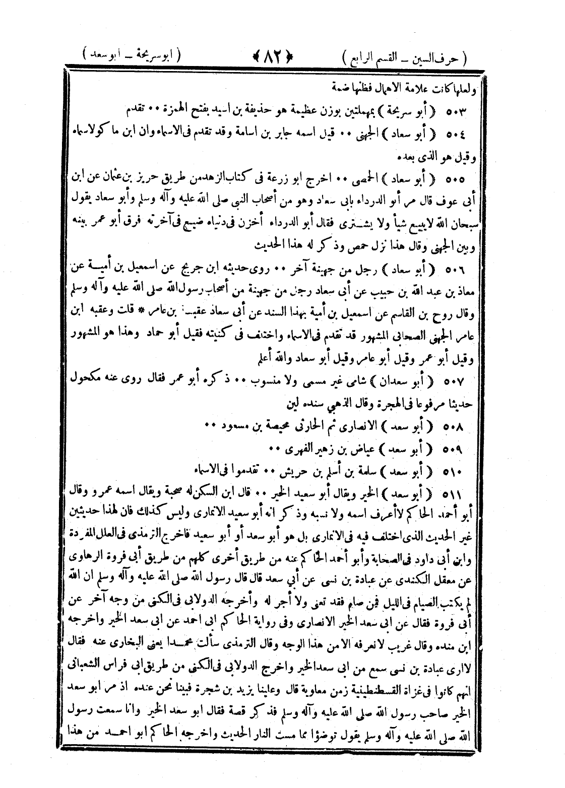 <82> ولعلها كانت علامة الإهمال فظنها ضمة أبو سريحة بمهملتين بوزن عظيمة هو حذيفة بن أسيد بفتح الهمزة تقدم أبو سعاد الجهني قيل اسمه جابر بن أسامة وقد تقدم في الأسماء وأن بن ماكولا سماه وقيل هو الذي بعده أبو سعاد الحمصي أخرج أبو زرعة في كتاب الزهد من طريق حريز بن عثمان عن بن أبي عوف قال مر أبو الدرداء بأبي سعاد وهو من أصحاب النبي صلى الله عليه وسلم وأبو سعاد يقول سبحان الله لا يبيع شيئا ولا يشتري فقال أبو الدرداء أخزن في دنياه ضيع في آخرته فرق أبو عمر بينه وبين الجهني وقال هذا نزل حمص وذكر له هذا الحديث أبو سعدان شامي غير مسمى ولا منسوب ذكره أبو عمر فقال روى عنه مكحول حديثا مرفوعا في الهجرة وقال الذهبي سنده لين أبو سعد الأنصاري ثم الحارثي محيصة بن مسعود أبو سعد عياض بن زهير الفهري أبو سعد عياض بن زهير الفهري أبو سعد سلمة بن أسلم بن حريش تقدموا في الأسماء أبو سعد الخير ويقال أبو سعيد الخير قال بن السكن له صحبة ويقال اسمه عمرو وقال أبو أحمد الحاكم لا أعرف اسمه ولا نسبه وذكر أنه أبو سعيد الأنماري وليس كذلك فإن لهذا حديثين غير الحديث الذي اختلف فيه في الأنماري بل هو أبو سعد أو أبو سعيد فأخرج الترمذي في العلل المفردة وابن أبي داود في الصحابة وأبو أحمد الحاكم عنه من طريق أخرى كلهم من طريق أبي فروة الرهاوي عن معقل الكندي عن عبادة بن نسي عن أبي سعيد قال قال رسول الله صلى الله عليه وسلم إن الله لم يكتب الصيام في الليل فمن صام فقد تعني ولا أجر له وأخرجه الدولابي في الكنى من وجه آخر عن أبي فروة فقال عن أبي سعد الخير الأنصاري وفي رواية الحاكم أبي أحمد عن أبي سعد الخير وأخرجه بن منده وقال غريب لا نعرفه إلا من هذا الوجه وقال الترمذي سألت محمدا يعني البخاري عنه فقال لا أرى عبادة بن نسي سمع من أبي سعد الخير وأخرج الدولابي في الكنى من طريق فراس الشعباني أنهم كانوا في غزاة القسطنطينية زمن معاوية قال وعلينا يزيد بن شجرة فبينا نحن عنده إذ مر أبو سعد الخير صاحب رسول الله صلى الله عليه وسلم فذكر قصة فقال أبو سعد الخير وأنا سمعت رسول الله صلى الله عليه وسلم يقول توضؤوا مما مست النار الحديث وأخرجه الحاكم أبو أحمد من هذا §