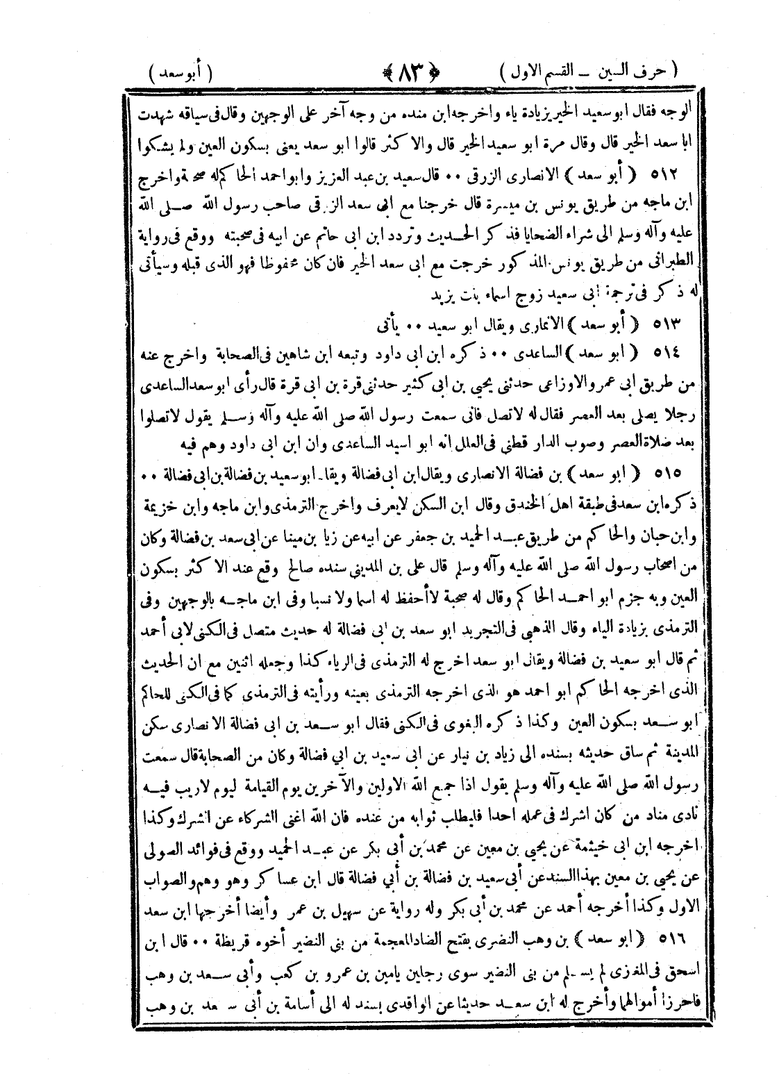<83> الوجه فقال أبو سعيد بزيادة ياء وأخرجه بن منده من وجه آخر على الوجهين وقال في سياقه شهدت أبا سعد الخير قال وقال مرة أبو سعيد الخير قال والأكثر قالوا أبو سعد يعني بسكون العين ولم يشكوا أبو سعد الأنصاري الزرقي قال سعيد بن عبد العزيز وأبو أحمد الحاكم له صحبة وأخرج بن ماجة من طريق يونس بن ميسرة قال خرجنا مع أبي سعد الزرقي صاحب رسول الله صلى الله عليه وسلم الى شراء الضحايا فذكر الحديث وتردد بن أبي حاتم عن أبيه في صحبته ووقع في رواية الطبراني من طريق يونس المذكور خرجت مع أبي سعد الخير فإن كان محفوظا فهو الذي قبله وسيأتي له ذكر في ترجمة أبو سعيد زوج أسماء بنت يزيد أبو سعد الأنماري ويقال أبو سعيد يأتي أبو سعد الساعدي ذكره بن أبي داود وتبعه بن شاهين في الصحابة وأخرج عنه من طريق أبي عمرو الأوزاعي حدثني يحيى بن أبي كثير حدثني قرة بن أبي قرة قال رأى أبو سعد الساعدي رجلا يصلي بعد العصر فقال له لا تصل فإني سمعت رسول الله صلى الله عليه وسلم يقول لا تصلوا بعد صلاة العصر وصوب الدارقطني في العلل أنه أبو أسيد الساعدي وأن بن أبي داود وهم فيه أبو سعد بن فضالة الأنصاري ويقال بن أبي فضالة ويقال أبو سعيد بن فضالة بن أبي فضالة ذكره بن سعد في طبقة أهل الخندق وقال بن السكن لا يعرف وأخرج الترمذي وابن ماجة وابن خزيمة وابن حبان والحاكم من طريق عبد الحميد بن جعفر عن أبيه عن زياد بن مينا عن أبي فضالة وكان من أصحاب رسول الله صلى الله عليه وسلم قال علي بن المديني سنده صالح وقع عند الأكثر بسكون العين وبه جزم أبو أحمد الحاكم وقال له صحبة لا أحفظ له اسما ولا نسبا وفي بن ماجة بالوجهين وفي الترمذي بزيادة الياء وقال الذهبي في التجريد أبو سعد بن أبي فضالة له حديث متصل في الكنى لأبي أحمد ثم قال أبو سعيد بن فضالة ويقال أبو سعد أخرج له الترمذي في الرياء كذا وجعله اثنين مع أن الحديث الذي أخرجه الحاكم أبو أحمد هو الذي أخرجه الترمذي بعينه ورأيته في الترمذي كما في الكنى للحاكم أبو سعد بسكون العين وكذا ذكره البغوي في الكنى فقال أبو سعد بن أبي فضالة الأنصاري سكن المدينة ثم ساق حديثه بسنده الى زياد بن نيار عن أبي سعيد بن أبي فضالة وكان من الصحابة قال سمعت رسول الله صلى الله عليه وسلم يقول إذا جمع الله الأولين والآخرين يوم القيامة ليوم لا ريب فيه نادى مناد من كان أشرك في عمله أحدا فليطلب ثوابه من عنده فإن الله أغنى الشركاء عن الشرك وكذا أخرجه بن أبي خيثمة عن يحيى بن معين عن محمد بن أبي بكر عن عبد الحميد ووقع في الفوائد للصولي عن يحيى بن معين بهذا السند عن أبي سعيد بن فضالة بن أبي فضالة قال بن عساكر وهو وهم والصواب الأول وكذا أخرجه أحمد عن محمد أبي بكر وله رواية عن سهيل بن عمرو أيضا أخرجها بن سعد أبو سعد بن وهب النضري بفتح الضاد المعجمة من بني النضير إخوة قريظة قال بن إسحاق في المغازي لم يسلم من بني النضير سوى الرجلين يامين بن عمرو بن كعب وأبي سعد بن وهب فأحرزا أموالهما وأخرج له بن سعد حديثا عن الواقدي بسند له إلى أسامة بن أبي سعد بن وهب §