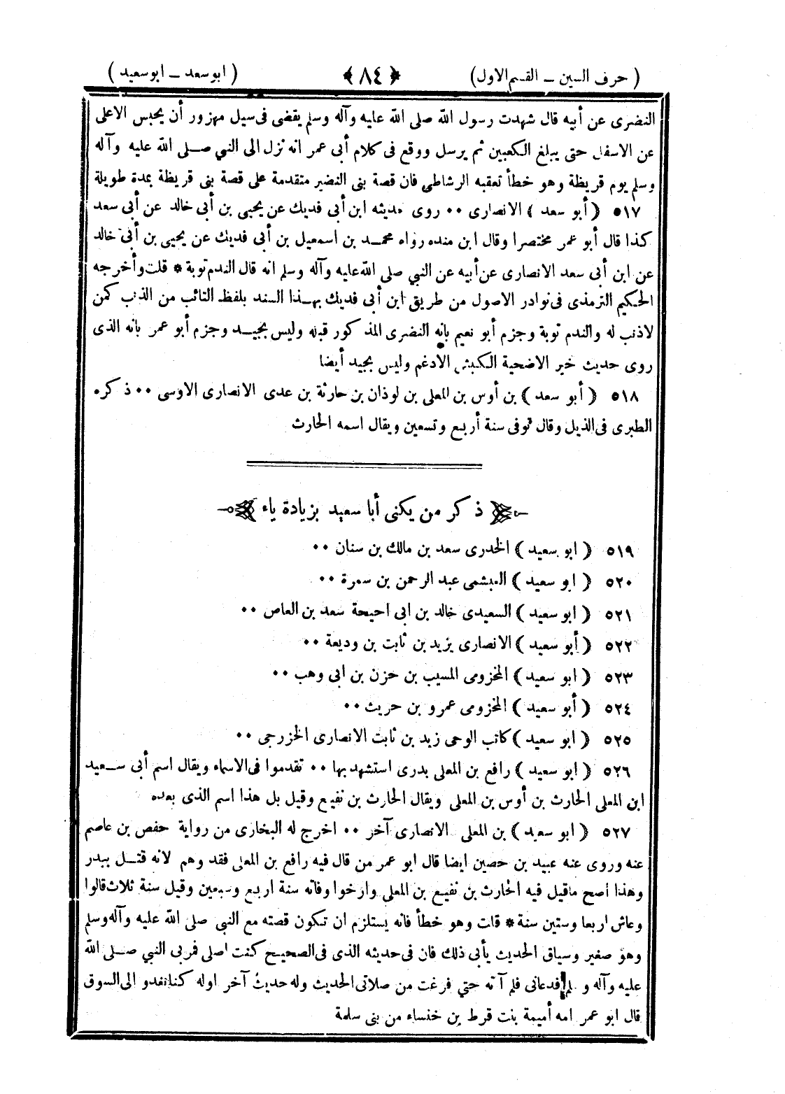 <84> النضري عن أبيه قال شهدت رسول الله الله عليه وسلم يقضي في سيل مهروز أن يحبس الأعلى عن الأسفل حتى يبلغ الكعبين ثم يرسل ووقع في كلام أبي عمر أنه نزل الى النبي صلى الله عليه وسلم يوم قريظة وهو خطأ تعقبه الرشاطي فإن قصة بني النضير متقدمة على قصة بني قريظة بمدة طويلة أبو سعد الأنصاري روى حديثه بن أبي فديك عن يحيى بن أبي خالد عن أبي سعد كذا قال أبو عمر مختصرا وقال بن منده رواه محمد بن إسماعيل بن أبي فديك عن يحيى بن أبي خالد عن بن أبي سعد الأنصاري عن أبيه عن النبي صلى الله عليه وسلم أنه قال الندم توبة قلت وأخرجه الحكيم الترمذي في نوادر الأصول من طريق بن أبي فديك بهذا السند بلفظ التائب من الذنب كمن لا ذنب له والندم توبة وجزم أبو نعيم بأنه النضري المذكور قبله وليس بجيد وجزم أبو بكر بأنه الذي روى حديث خير الأضحية الكبش الأدغم وليس بجيد أيضا أبو سعد بن أوس بن المعلى بن لوذان بن حارثة بن عدي الأنصاري الأوسي ذكره الطبري في الذيل وقال توفي سنة أربع وتسعين ويقال اسمه الحارث ذكر من يكنى أبا سعيد بزيادة ياء أبو سعيد الخدري سعد بن مالك بن سنان أبو سعيد العبشمي عبد الرحمن بن سمرة أبو سعيد السعيدي خالد بن أبي أحيحة سعد بن العاص أبو سعيد الأنصاري يزيد بن ثابت بن وديعة أبو سعيد المخزومي المسيب بن حزن بن أبي وهب أبو سعيد المخزومي عمر بن حريث أبو سعيد كاتب الوحي زيد بن ثابت الأنصاري الخزرجي أبو سعيد رافع بن المعلى بدري استشهد بها تقدموا في الأسماء ويقال اسم أبي سعيد بن المعلى الحارس بن أوس بن العلي ويقال الحارس بن نفيع وقيل بل هذا اسم الذي بعده أبو سعيد بن المعلي الأنصاري آخر أخرج له البخاري من رواية حفص بن عاصم عنه وروى عنه عبيد بن حنين أيضا قال أبو عمر من قال فيه رافع بن المعلي فقد وهم لأنه قتل ببدر وهذا أصح ما قيل فيه الحارث بن نفيع بن المعلى وأرخوا وفاته سنة أربع وسبعين وقيل سنة ثلاث قالوا وعاش أربعا وستين سنة قلت وهو خطأ فإنه يستلزم أن تكون قصته مع النبي صلى الله عليه وسلم وهو صغير وسياق الحديث يأبى ذلك فإن في حديثه الذي في الصحيح كنت أصلي فمر بي النبي صلى الله عليه وسلم فدعاني فلم آته حتى فرغت من صلاتي الحديث وله حديث آخر أوله كنا نغدو الى السوق قال أبو عمر أمه أميمة بنت قرط بن خنساء من بني سلمة §
