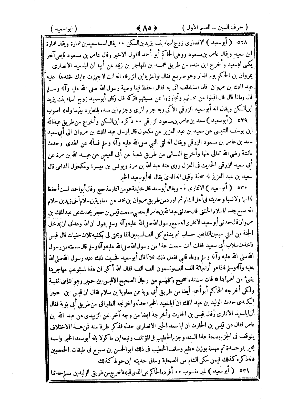 <85> أبو سعيد الأنصاري زوج أسماء بنت يزيد بن السكن يقال اسمه سعيد بن عمارة ويقال عمارة بن سعيد ويقال عامر بن مسعود وهي الحاكم أبو أحمد القول الأخير وقال عامر بن مسعود تابعي آخر يكنى أبا سعيد وأخرج بن منده من طريق محمد بن المهاجر بن زياد عن أبيه أن أبا سعيد الأنصاري مر بمروان بن الحكم يوم الدار وهو صريع فقال لو أعلم يا بن الزرقاء أنه أنت لأجهزت عليك فحقدها عليه عبد الملك بن مروان فلما استخلف أتى به فقال احفظ فيها وصية رسول الله صلى الله عليه وسلم قال وماذا قال قال اقبلوا من محسنهم وتجاوزوا عن مسيئهم فتركه قال وكان أبو سعيد زوج أسماء بنت يزيد بن السكن ويقال إنه أبو سعيد الزرقي الآتي وبه جزم المزي وجزم بن مندة بالمغايرة بينهما ولعله أصوب أبو سعيد سعد بن عامر بن مسعود الزرقي ذكره بن السكن وأخرج من طريق عبد الله بن يوسف التنيسي عن سعيد بن عبد العزيز عن مكحول قال أرسل عبد الملك بن مروان الى أبي سعيد سعد بن عامر بن مسعود الزرقي ويقال إنه لقي النبي صلى الله عليه وسلم فسأله عن الهدى وحدث عن عائشة رضي الله عنها وأخرج النسائي من طريق شعبة عن أبي العيص عن عبد الله بن مرة عن أبي سعيد الزرقي الحديث في العزل روى عنه عبد الله بن مرة ويونس بن ميسرة ومكحول الشامي قال سعيد بن عبد العزيز له صحبة وقيل إنه الذي يقال له أبو سعد الخير أبو سعيد الأنماري ويقال أبو سعد قال خليفة هو من أنمار مذحج قال أبو أحمد لست أحفظ له اسما ولا نسبا وحديثه في أهل الشام ثم أورد من طريق مروان بن محمد عن معاوية بن سلام أخي زيد بن سلام أنه سمع جده أبا سلام الخشني قال حدثني عبد الله بن عامر اليحصبي سمعت قيس بن حجر يحدث عن عبد الملك بن مروان قال حدثني أبو سعيد الأنماري أنه سمع رسول الله صلى الله عليه وسلم يقول إن الله وعدني أن يدخل الجنة من أمتي سبعين ألفا بغير حساب ثم يشفع كل ألف لسبعين ألفا ويحثي له بكفيه ثلاث حثيات قال قيس فأخذت بتلابيب أبي سعيد فقلت أنت سمعت هذا من رسول الله صلى الله عليه وسلم قال سمعت من رسول الله صلى الله عليه وسلم وعاه قلبي ففعل ذلك ثلاثا قال أبو سعيد فحسبت ذلك عند رسول الله صلى الله عليه وسلم فإذا هو أربعمائة ألف ألف وتسعون ألف ألف فقال الله أكبر إن هذا لمستوعب مهاجرينا ونستعين بشيء من أعرابنا قلت سنده صحيح وكلهم من رجال الصحيح إلا قيس بن حجر وهو شامي ثقة ولكن أخرجه الحاكم أبو أحمد أيضا من طريق أبي توبة عن معاوية بن سلام فقال إن قيس بن حجر الكندي حدث الوليد بن عبد الملك أن أبا سعيد الخير حدثه وأخرجه الطبراني من طريق أبي توبة عن معاوية فقال إن أبا سعيد الأنماري وقيل قيس بن الحارث وأخرجه أيضا من وجه آخر عن الزبيدي عن عبد الله بن عامر فقال عن قيس بن الحارث إن أبا سعيد الخير الأنصاري حدثه فذكر طرفا منه فمن هذا الاختلاف يتوقف في الجزم بصحة هذا السند وجزم الخطيب في المؤتلف وتبعه بن ماكولا بأنه أبو سعد الخير واسمه بجير بموحدة ثم مهملة بوزن عظيم وسلف الخطيب في ذلك أبو الحسن بن سميع في طبقات الحمصيين فإنه ذكره كذلك فيمن سكن الشام من الصحابة وساق حديثه بن جوصا كذلك أبو سعيد غير منسوب أفرده الحاكم عن الذي قبله فأخرج من طريق الوليد بن مسلم حدثنا §