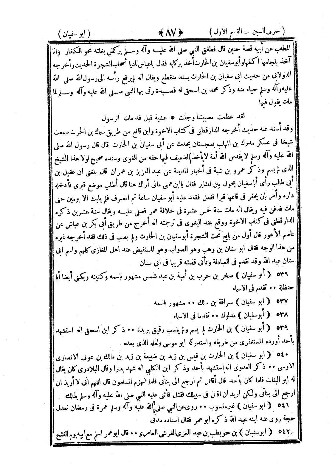 <87> المطلب عن أبيه قصة حنين قال فطفق النبي صلى الله عليه وسلم يركض بغلته نحو الكفار وأنا آخذ بلجامها أكفها وأبو سفيان بن الحارث آخذ بركابه فقال يا عباس ناد يا أصحاب الشجرة الحديث وأخرجه الدولابي من حديث أبي سفيان بن الحارث بسند منقطع ويقال إنه لم يرفع رأسه الى رسول الله صلى الله عليه وسلم حياء منه وذكر محمد بن إسحاق له قصيدة رثى بها النبي صلى الله عليه وسلم لما مات يقول فيها لقد عظمت مصيبتنا وجلت عشية قيل قد مات الرسول وقد أسند عنه حديث أخرجه الدارقطني في كتاب الإخوة وابن قانع من طريق سماك بن حرب سمعت شيخا في عسكر مدرك بن المهلب بسجستان يحدث عن أبي سفيان بن الحارث قال قال رسول الله صلى الله عليه وسلم لا يقدس الله أمة لا يأخذ الضعيف فيها حقه من القوي وسنده صحيح لولا هذا الشيخ الذي لم يسم وأنشد له أبو الحسن مما قاله يوم حنين إن بن عم المرء من أعمامه بني أبيه قوة من قدامه فإن هذا اليوم من أيامه يقاتل الحرمي عن إحرامه يقاتل المسلم عن إسلامه الأبيات وذكر عمر بن شبة في أخبار المدينة عن عبد العزيز بن عمران قال بلغني أن عقيل بن أبي طالب رأى أبا سفيان يجول بين المقابر فقال يا بن عمي ما لي أراك هنا قال أطلب موضع قبري فأدخله داره وأمر بأن يحفر في قاعها قبرا ففعل فقعد عليه أبو سفيان ساعة ثم انصرف فلم يلبث إلا يومين حتى مات فدفن فيه ويقال إنه مات سنة خمس عشرة في خلافة عمر فصلى عليه ويقال سنة عشرين ذكره الدارقطني في كتاب الإخوة ووقع عند البغوي في ترجمته أنه أخرج من طريق أبي بكر بن عياش عن عاصم الأعور قال أول من بايع تحت الشجرة أبو سفيان بن الحارث ولم يصب في ذلك فقد أخرجه غيره من هذا الوجه فقال أبو سنان بن وهب وهو الصواب وهو المستفيض عند أهل المغازي كلهم واسم أبي سنان عبد الله وقد تقدم في العبادلة وتأتي قصته قريبا في أبي سنان أبو سفيان صخر بن حرب بن أمية بن عبد شمس مشهور باسمه وكنيته ويكنى أبا حنظلة تقدم في الأسماء أبو سفيان سراقة بن مالك مشهور باسمه أبو سفيان مدلوك تقدما في الأسماء أبو سفيان بن الحارث لم يسم ولم ينسب رفيق بريدة ذكر بن إسحاق أنه استشهد بأحد أورده المستغفري من طريقه واستدركه أبو موسى ولعله الذي بعده أبو سفيان بن الحارث بن قيس بن زيد بن ضبيعة بن زيد بن مالك بن عوف الأنصاري الأوسي ذكر العدوي أنه استشهد بأحد وذكر بن الكلبي أنه شهد بدرا وقال البلاذري كان يقال له أبو البنات فلما كان بأحد قال أقاتل ثم أرجع إلى بناتي فلما انهزم المسلمون قال اللهم إني لا أريد أن أرجع إلى بناتي ولكن أريد أن أقتل في سبيلك فقتل فأثنى عليه النبي صلى الله عليه وسلم بذلك أبو سفيان غير منسوب روى عن النبي صلى الله عليه وسلم عمرة في رمضان تعدل حجة روى عنه ابنه عبد الله ذكره أبو عمر فقال إسناده مدني أبو سفيان بن حويطب بن عبد العزي القرشي العامري قال أبو عمر أسلم مع أبيه يوم الفتح §