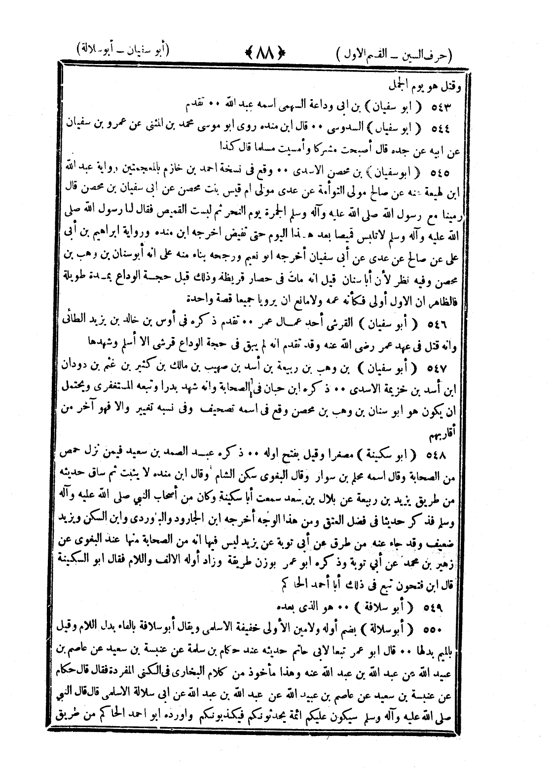 <88> وقتل هو يوم الجمل أبو سفيان بن أبي وداعة السهمي اسمه عبد الله تقدم أبو سفيان السدوسي قال بن مندة روى أبو موسى محمد بن المثنى عن عمرو بن سفيان عن أبيه عن جده قال أصبحت مشركا وأمسيت مسلما أبو سفيان بن محصن الأسدي وقع في نسخة أحمد بن خازم بالمعجمتين رواية عبد الله بن لهيعة عنه عن صالح مولى التوأمة عن عدي مولى أم قيس بنت محصن عن أبي سفيان بن محصن قال رمينا مع رسول الله صلى الله عليه وسلم الجمرة يوم النحر ثم لبست القميص فقال لنا رسول الله صلى الله عليه وسلم لا تلبس قميصا بعد هذا اليوم حتى تفيض أخرجه بن مندة ورواه إبراهيم بن أبي علي عن صالح عن عدي عن أبي سفيان أخرجه أبو نعيم ورجحه بناء منه على أنه أبو سنان بن وهب بن محصن وفيه نظر لأن أبا سنان قيل أنه مات في حصار قريظة وذلك قبل حجة الوداع بمدة طويلة فالظاهر أن الأول أولى فكأنه عمه ولا مانع أن يرويا جميعا قصة واحدة أبو سفيان القرشي أحد عمال عمر تقدم ذكره في أوس بن خالد بن يزيد الطائي وأنه قتل في عهد عمر رضي الله عنه وقد تقدم أنه لم يبق في حجة الوداع قرشي إلا أسلم وشهدها أبو سفيان بن وهب بن ربيعة بن أسد بن صهيب بن مالك بن كثير بن غنم بن دودان بن أسد بن خزيمة الأسدي ذكره بن حبان في الصحابة وأنه شهد بدرا وتبعه المستغفري ويحتمل أن يكون هو أبا سنان بن وهب بن محصن وقع في اسمه تصحيف وفي نسبه تغيير وإلا فهو آخر من أقاربهم أبو سكينة مصغرا وقيل بفتح أوله ذكره عبد الصمد بن سعيد فيمن نزل حمص من الصحابة وقال اسمه محلم بن سوار وقال البغوي سكن الشام وقال بن مندة لا يثبت ثم ساق حديثه من طريق يزيد بن ربيعة عن بلال بن سعد سمعت أبا سكينة وكان من أصحاب النبي صلى الله عليه وسلم فذكر حديثا في فضل العتق ومن هذا الوجه أخرجه بن الجارود والباوردي وابن السكن ويزيد ضعيف وقد جاء عنه من طرق عن أبي توبة عن يزيد ليس فيها أنه من الصحابة منها عند البغوي عن زهير بن محمد عن أبي توبة وذكره أبو عمر بوزن طريقة وزاد أوله الألف واللام فقال أبو السكينة قال بن فتحون تبع في ذلك أبا أحمد الحاكم أبو سلافة هو الذي بعده أبو سلالة بضم أوله ولامين الأولى خفيفة الأسلمي ويقال أبو سلافة بالفاء بدل اللام وقيل بالميم بدلها قال أبو عمر تبعا لأبي حاتم حديثه عند حكام بن سلم عن عنبسة بن سعيد عن عاصم بن عبيد الله عن عبد الله بن عبد الله عنه وهذا مأخوذ من كلام البخاري في الكنى المفردة فقال قال حكام عن عنبسة بن سعيد عن عاصم بن عبيد الله عن عبد الله بن عبد الله عن أبي سلالة الأسلمي قال قال النبي صلى الله عليه وسلم سيكون عليكم أئمة يحدثونكم فيكذبونكم وأورده أبو أحمد الحاكم من طريق §
