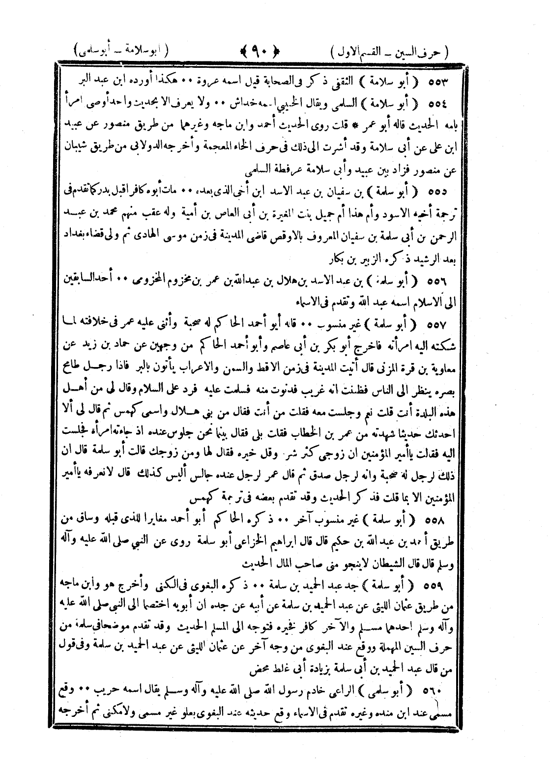 <90> أبو سلامة الثقفي ذكر في الصحابة قيل اسمه عروة هكذا أورده بن عبد البر أبو سلامة السلمي ويقال الحبيبي اسمه خداش ولا يعرف إلا بحديث واحد أوصى امرأ بأمه الحديث قاله أبو عمر قلت روى الحديث أحمد وابن ماجة وغيرهما من طريق منصور عن عبيد بن على عن أبى سلامه وقد أشرت إلى ذلك في حرف الخاء المعجمه وأخرجه الدولابي من طريق شيبان عن منصور فزاد بين عبيد وأبى سلامه عرفطه السلمي أبو سلمة بن سفيان بن عبد الأسد بن أخي الذي بعده مات أبوه كافرا قبل بدر كما تقدم في ترجمة أخيه الأسود وأم هذا أم جميل بنت المغيرة بن أبي العاص بن أمية وله عقب منهم محمد بن عبد الرحمن بن أبي سلمة بن سفيان المعروف بالأوقص قاضي المدينة في زمن موسى الهادي ثم ولي قضاء بغداد بعد الرشيد ذكره الزبير بن بكار أبو سلمة بن عبد الأسد بن هلال بن عبد الله بن عمر بن مخزوم المخزومي أحد السابقين الى الإسلام اسمه عبد الله وتقدم في الأسماء أبو سلمة غير منسوب قال أبو أحمد الحاكم له صحبة وأثنى عليه في خلافته لما شكته اليه امرأته فأخرج أبو بكر بن أبي عاصم وأبو أحمد الحاكم من وجهين عن حماد بن زيد عن معاوية بن قرة المزني قال أتيت المدينة في زمن الأقط والسمن والأعراب يأتون بالبر فإذا رجل طامح بصره ينظر الى الناس فظننت أنه غريب فدنوت فسلمت عليه فرد علي السلام وقال لي من أهل هذه البلدة أنت قلت نعم وجلست معه فقلت من أنت قال من بني هلال واسمي كهمس ثم قال لي ألا أحدثك حديثا شهدته من عمر بن الخطاب فقلت بلى فقال بينما نحن جلوس عنده إذ جاءته امرأة فجلست اليه فقالت يا أمير المؤمنين إن زوجي كثر شره وقل خيره فقال لها ومن زوجك قالت أبو سلمة قال إن ذلك لرجل له صحبة وإنه لرجل صدق ثم قال عمر لرجل عنده جالس أليس كذلك قال لا نعرفه يا أمير المؤمنين إلا بما قلت فذكر الحديث وقد تقدم بعضه في ترجمة كهمس أبو سلمة غير منسوب آخر ذكره الحاكم أبو أحمد مغايرا للذي قبله وساق من طريق أحمد بن عبد الله بن حكيم قال قال إبراهيم الخزاعي أبو سلمة روى عن النبي صلى الله عليه وسلم قال قال الشيطان لا ينجو مني صاحب المال الحديث أبو سلمة جد عبد الحميد بن سلمة ذكره البغوي في الكنى وأخرج هو وابن ماجة من طريق عثمان البتي عن عبد الحميد بن سلمة عن أبيه عن جده أن أبويه اختصما الى النبي صلى الله عليه وسلم أحدهما مسلم والآخر كافر فخيره فتوجه الى المسلم الحديث وقد تقدم موضحا في سلمة من حرف السين المهملة ووقع عند البغوي من وجه آخر عن عثمان البتي عن عبد الحميد بن أبي سلمة عن أبيه عن جده فترجم لوالد أبي سلمة وليس بجيد فإن المحفوظ فيها عبد الحميد بن سلمة وفي قول من قال عبد الحميد بن أبي سلمة بزيادة أبي غلط محض أبو سلمي الراعي خادم رسول الله صلى الله عليه وسلم يقال اسمه حريث وقع مسمى عند بن منده وغيره تقدم في الأسماء ووقع حديثه عند البغوي بعلو غير مسمى ولا مكنى ثم أخرجه §